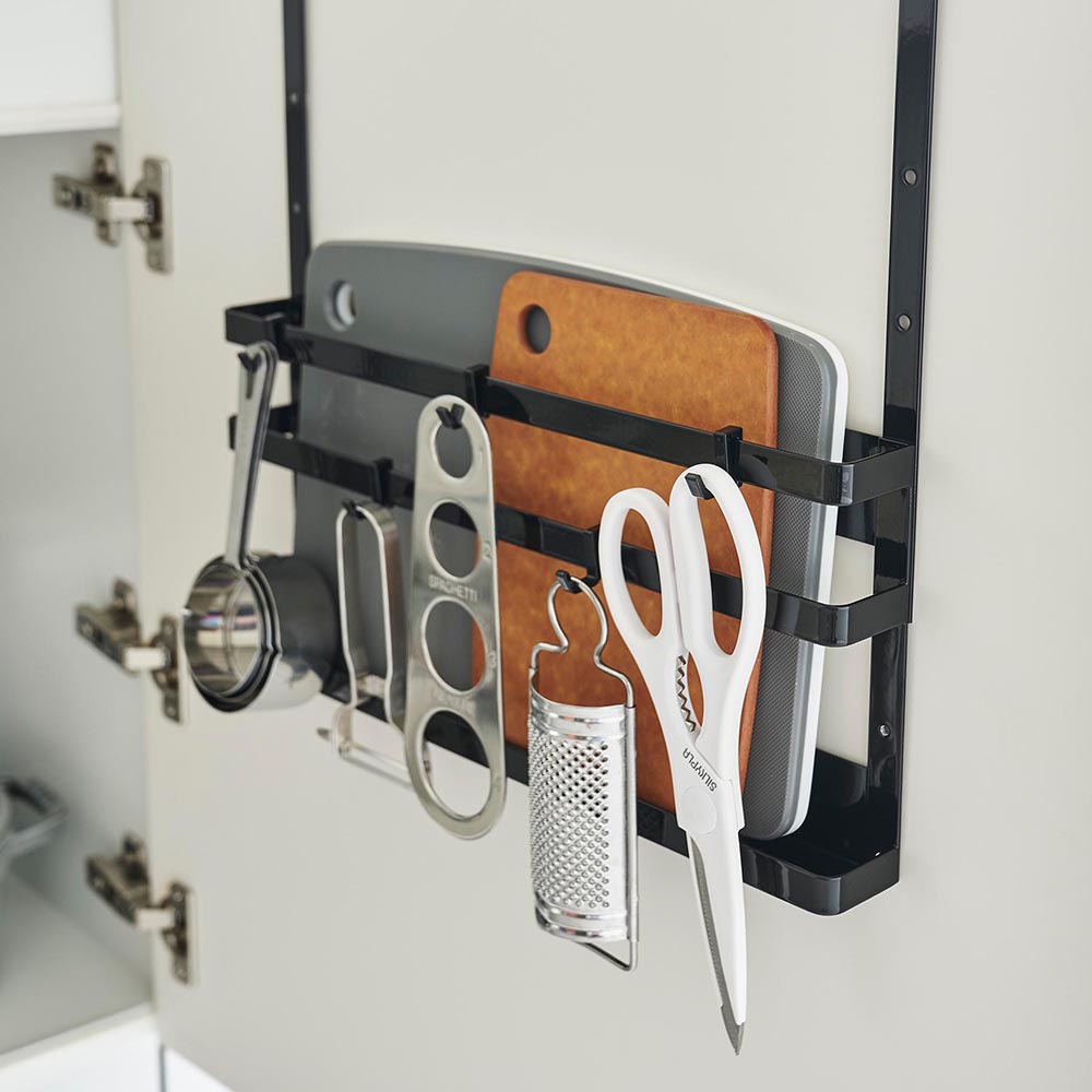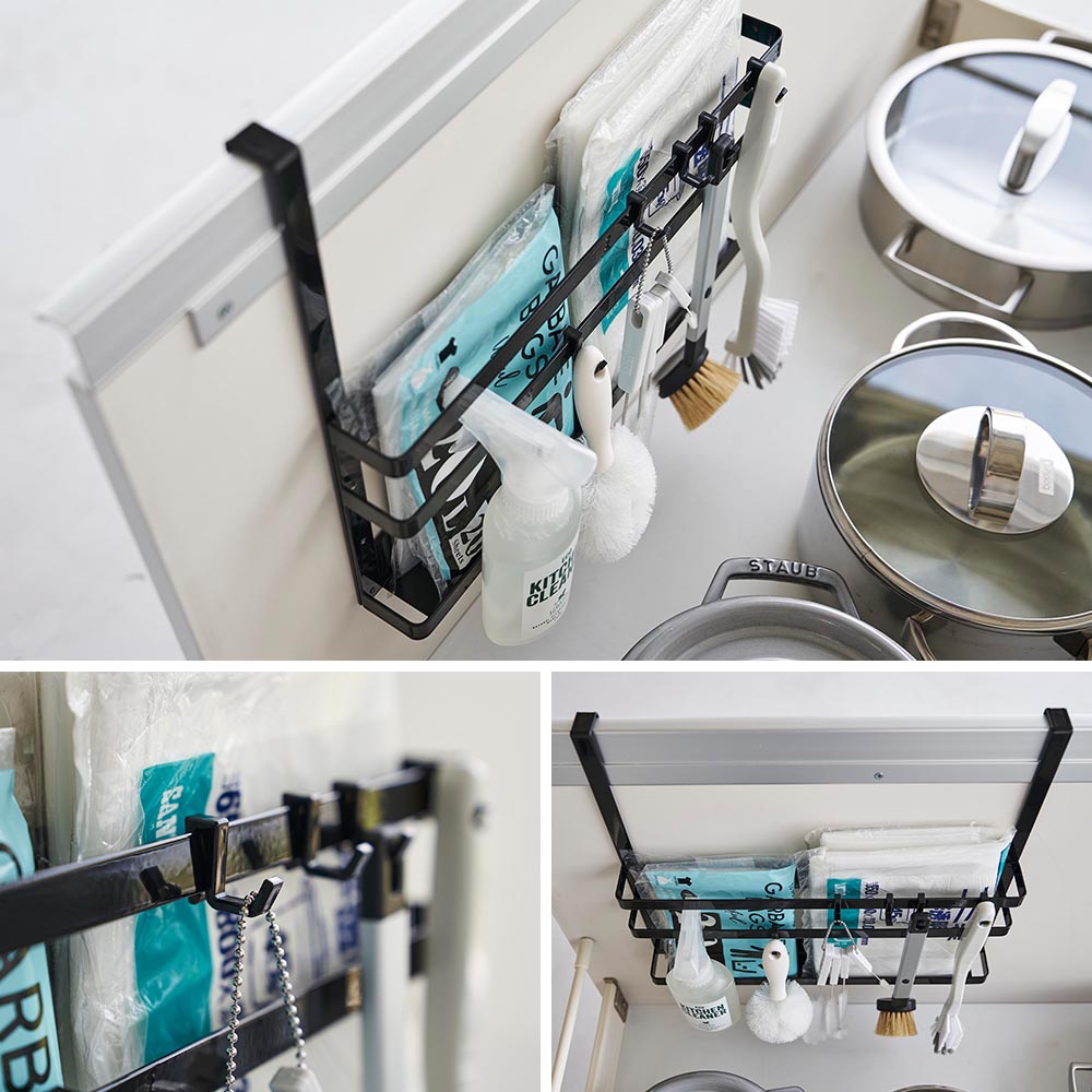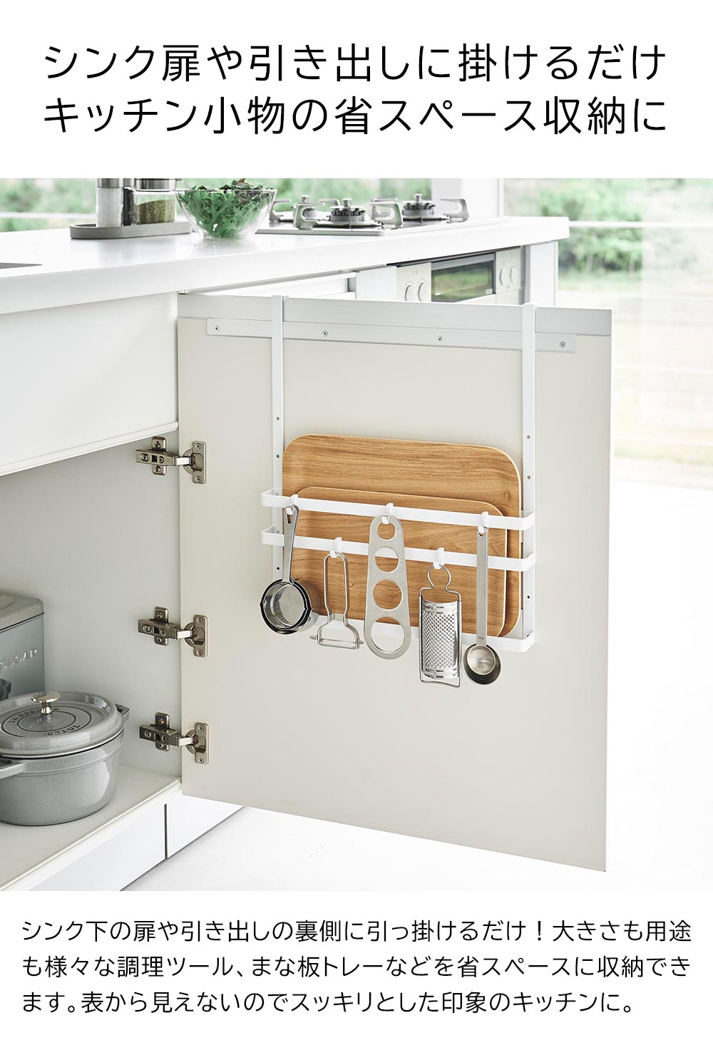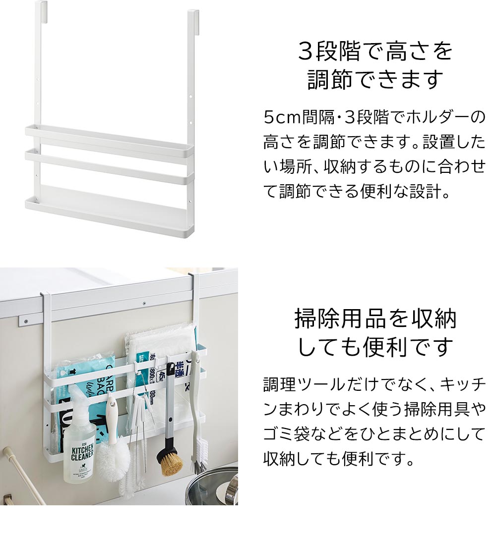 シンク扉や引き出しに掛けて 用途も大きさも様々なキッチンまわりの小物類は、そのままにしておくと散らかった印象に。そんなキッチンには、シンク扉や引き出しの裏側のデッドスペースを利用して収納できるツールホルダーが便利です。取り付け方はとても簡単!シンク扉・引き出しに引っ掛けるだけで設置完了。調理ツールやまな板トレーなどスッキリと整理して収納できます。キッチンまわりの掃除用具やゴミ袋を収納しても便利!また、取り外し可能な付属フックを使ってツール類を吊り下げ収納できます。収納する場所に合わせてホルダーの高さも3段階で調整できる親切な設計です。 ![]() ![]() ![]() ![]() ![]() ![]() ![]() ![]() ![]() ![]() ![]() |
