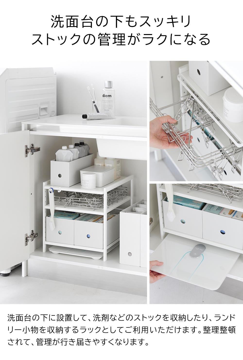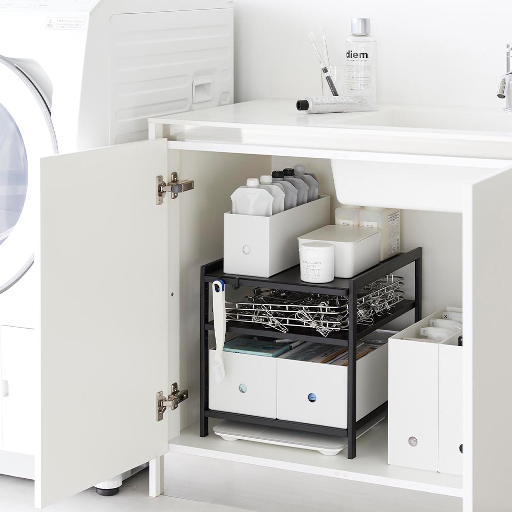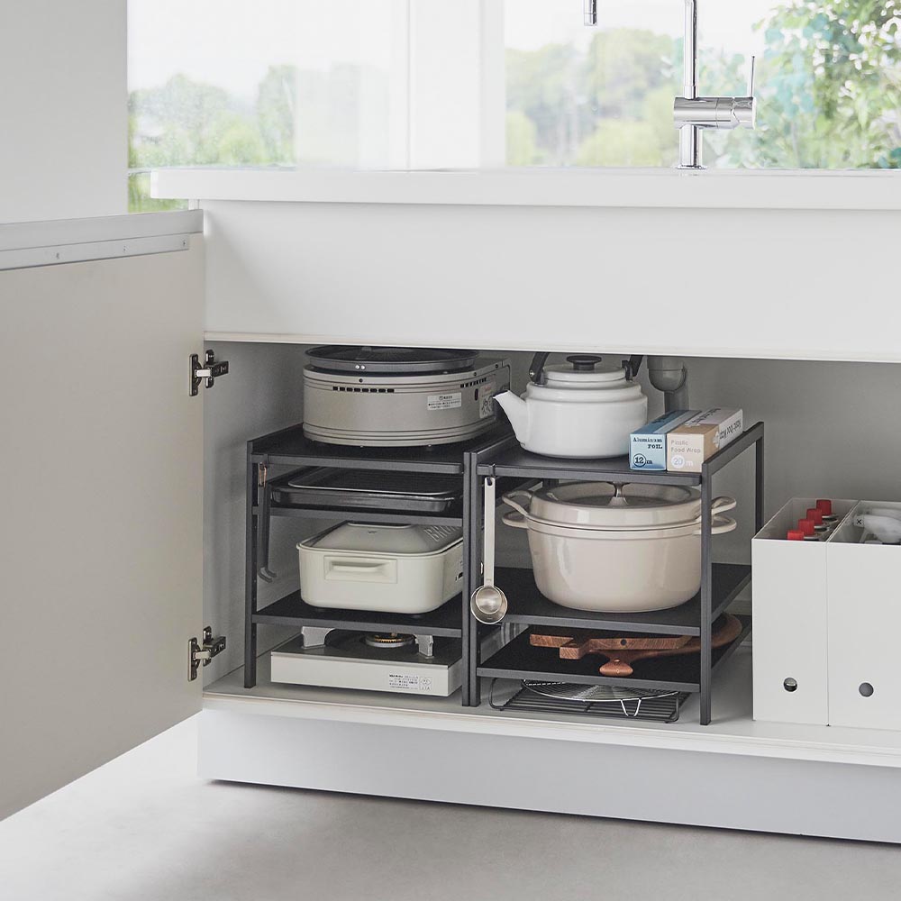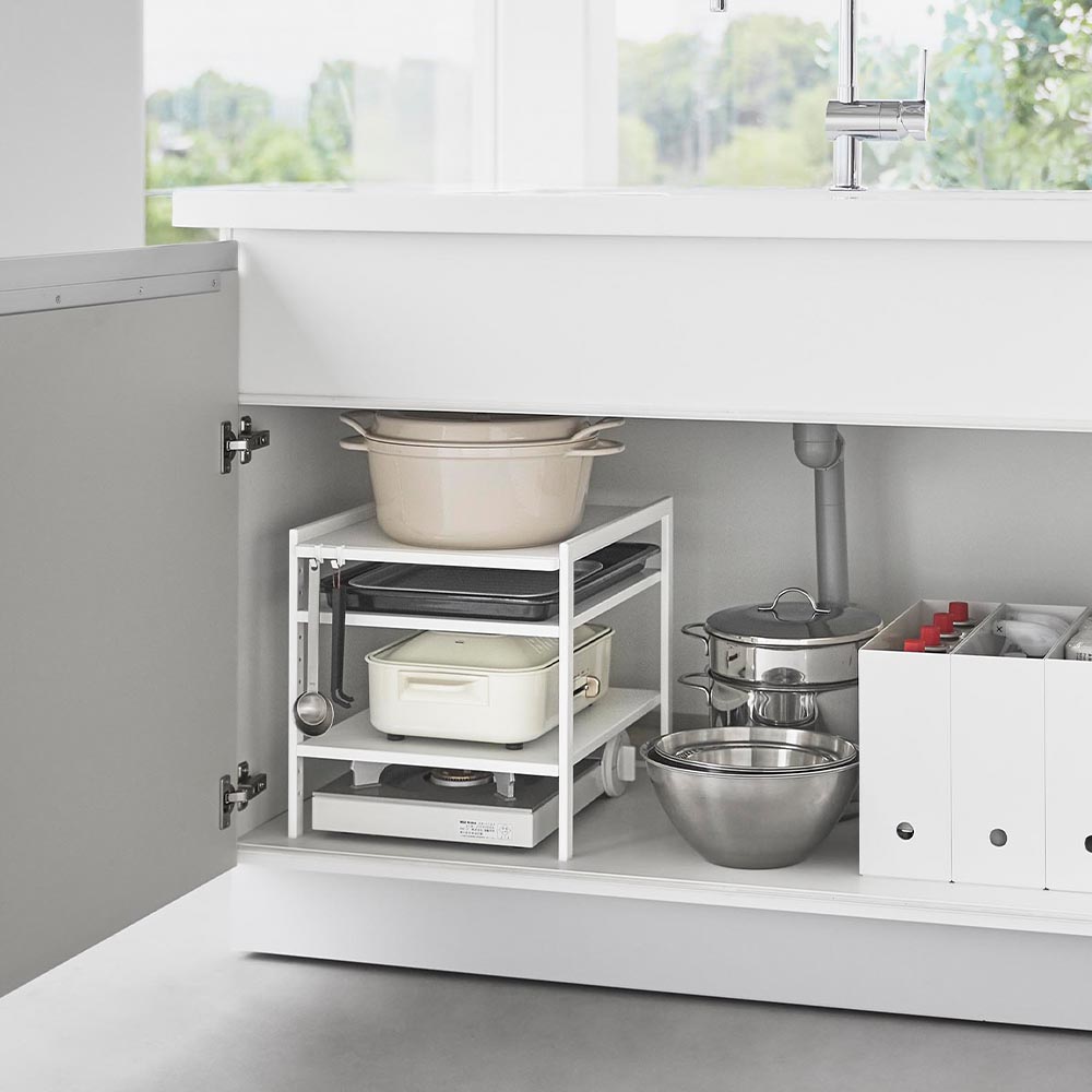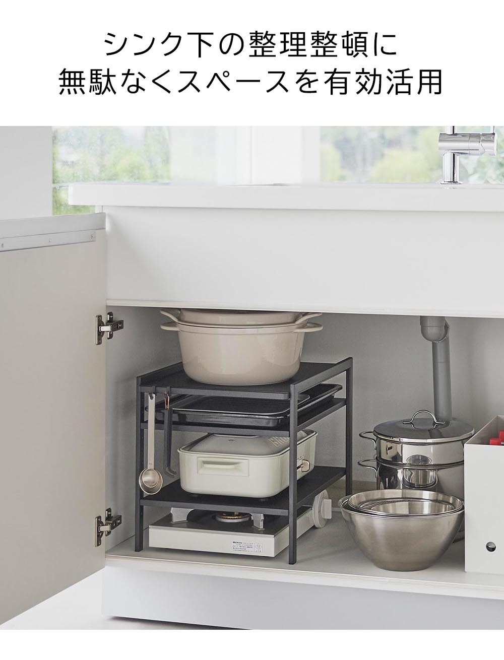 鍋やカセットコンロを シンク下や洗面台下の収納スペースを無駄なく活用できる3段収納ラック。約2.5cm刻みで細かく高さを調節し、シンク下に収納する様々な大きさの鍋や調理道具がスッキリ片付きます。スチール製の棚板は耐荷重が約10kgあり重い鍋を置けます。ハンドル付きの棚板には付属のフックを取り付けて、キッチン小物を掛けて収納できます。また、洗面台の下に設置して、洗剤ストックやランドリー小物のラックとしてもご利用いただけます。 ![]() ![]() ![]() ![]() ![]() ![]() ![]() ![]() ![]() |