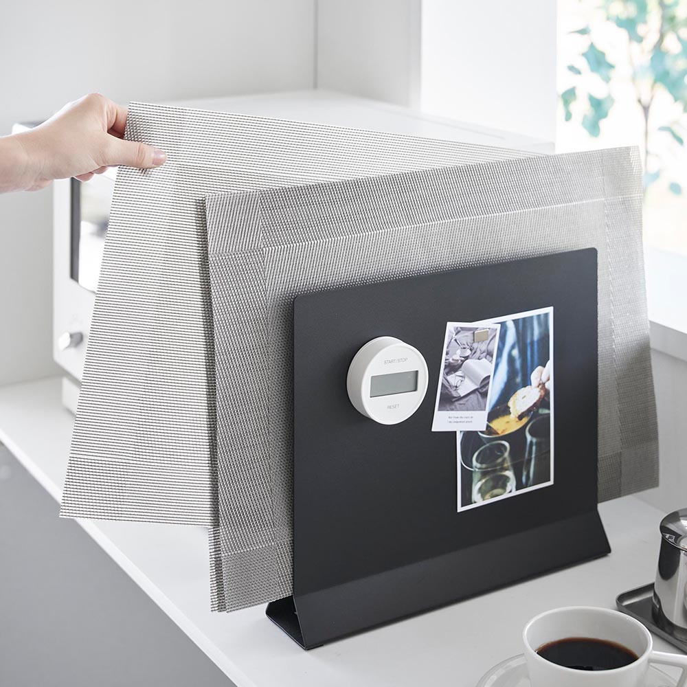 置き場所に困る 置き場所に困るランチョンマットを浮かせて収納できるスタンドです。浮かせて収納できるので、ほこりなどがつかず衛生的。幅約6cmとスリムなサイズで、置いた場所の邪魔にならずスペースを広く使えます。円形のランチョンマットや、キッチントレーなどの収納もできて便利です。また、丈夫で重さのあるスチール製なので、ティッシュケースやキッチンタイマーなどのマグネット小物をつけても◎ キッチンやダイニングの様々な場所で使えるシンプルなデザインも魅力的です。 ![]() ![]() ![]() ![]() ![]() ![]() ![]() ![]() ![]() ![]() ![]() ![]() |