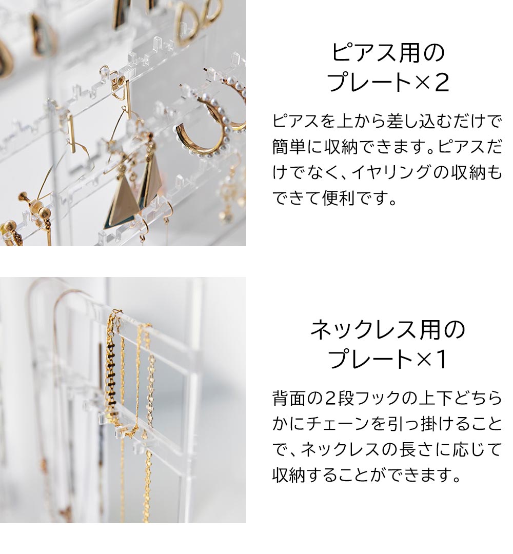 省スペースなのにたっぷりと 省スペースで卓上に置いても邪魔にならず、ピアスとネックレスを整理できる大容量の収納ホルダー。取り出しが簡単なスライド式で、ピアスとネックレスを分けて収納できます。ピアスはプレートの切れ込み部分に上から差し込むだけ。ネックレスは、プレートの背面にある2段フックの上下を使って、長さの違うネックレスを収納することができます。正面が開いているので収納したアクセサリーを見渡せ、探しやすいのも便利なポイントです。 ![]() ![]() ![]() ![]() ![]() ![]() ![]() ![]() ![]() ![]() ![]() ![]() |