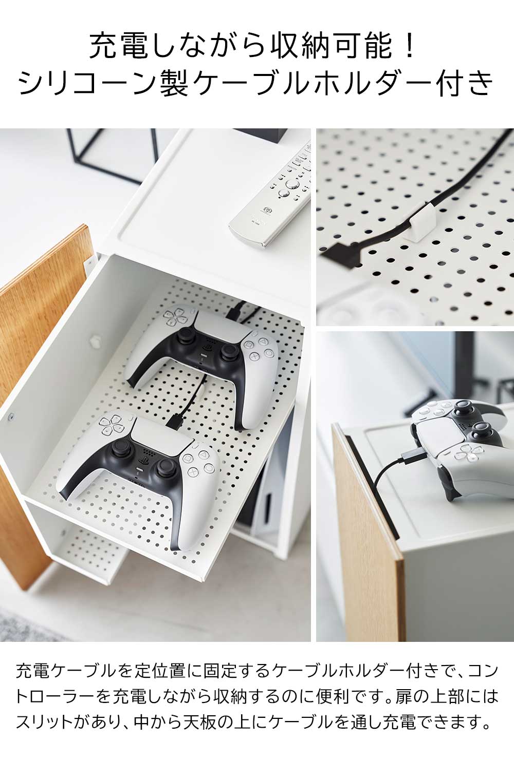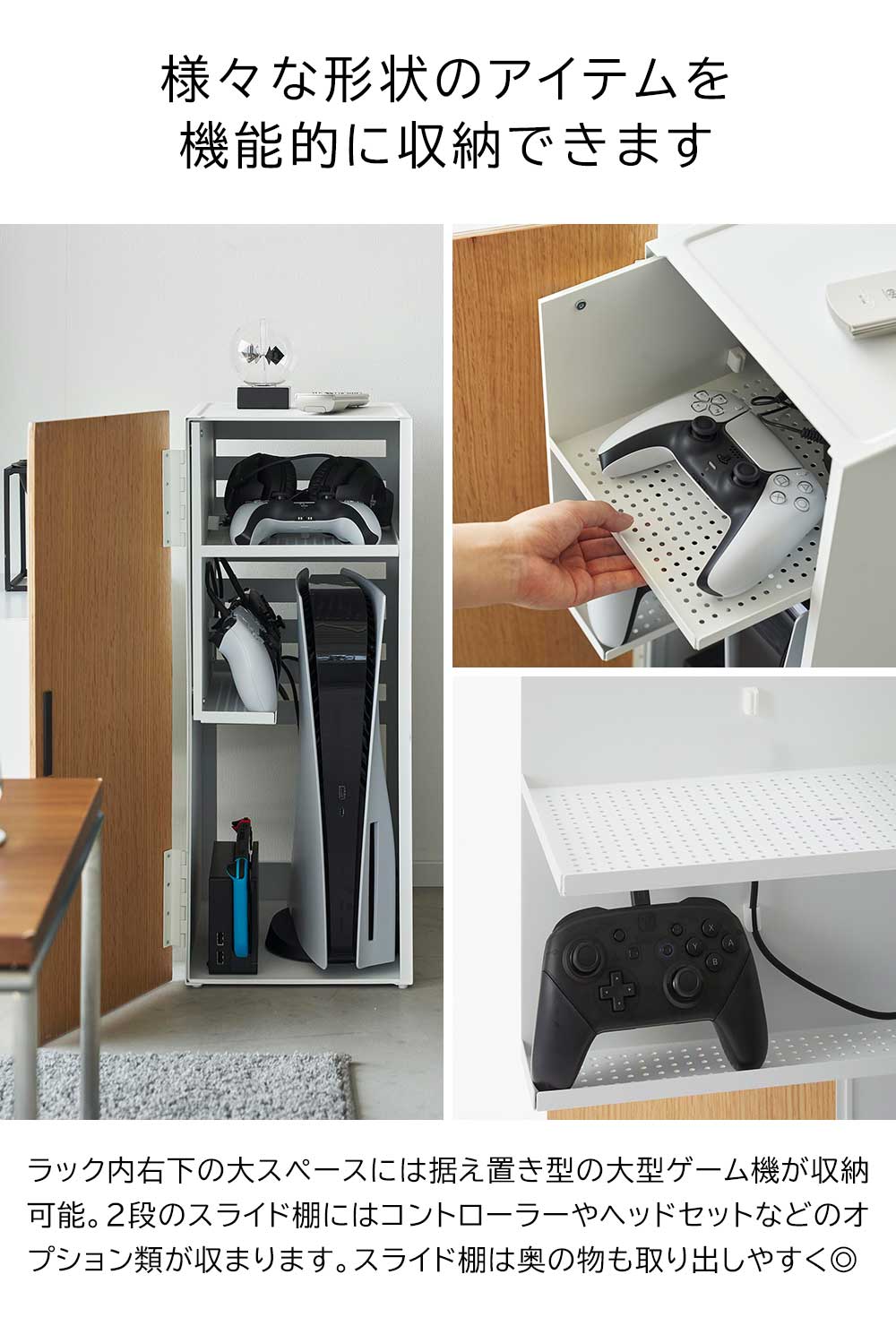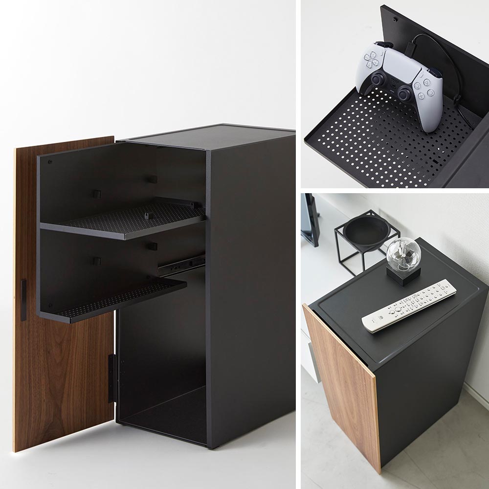 収納場所に困るゲーム機や 形も大きさもバラバラで複数あるゲーム機やオプション類をまとめて一括収納できるスチール製のラックです。天然木の扉が上品で、リビングなど人の目にふれる場所に置いても生活感を感じさせず、空間に上手に馴染みます。 ラックの中はとても機能的。スライド式の2段の棚には、コントローラーやヘッドセットなどを充電しながら並べて収納でき、付属のケーブルホルダーを使えば、充電ケーブルが迷子にならず棚に収まります。 ラック内右下の空間は広くあいており、大型の据え置き型ゲーム機が収納できます。 ラック背面には排熱穴がたくさんあいており、ケーブルの抜き差しにも便利です。 天板はコントローラーやリモコンの一時置きに活用できます。 お部屋のインテリアに合わせて、ホワイトとブラックの2色からお選びいただけます。 ![]() ![]() ![]() ![]() ![]() ![]() ![]() ![]() ![]() ![]() ![]() ![]() ![]() |