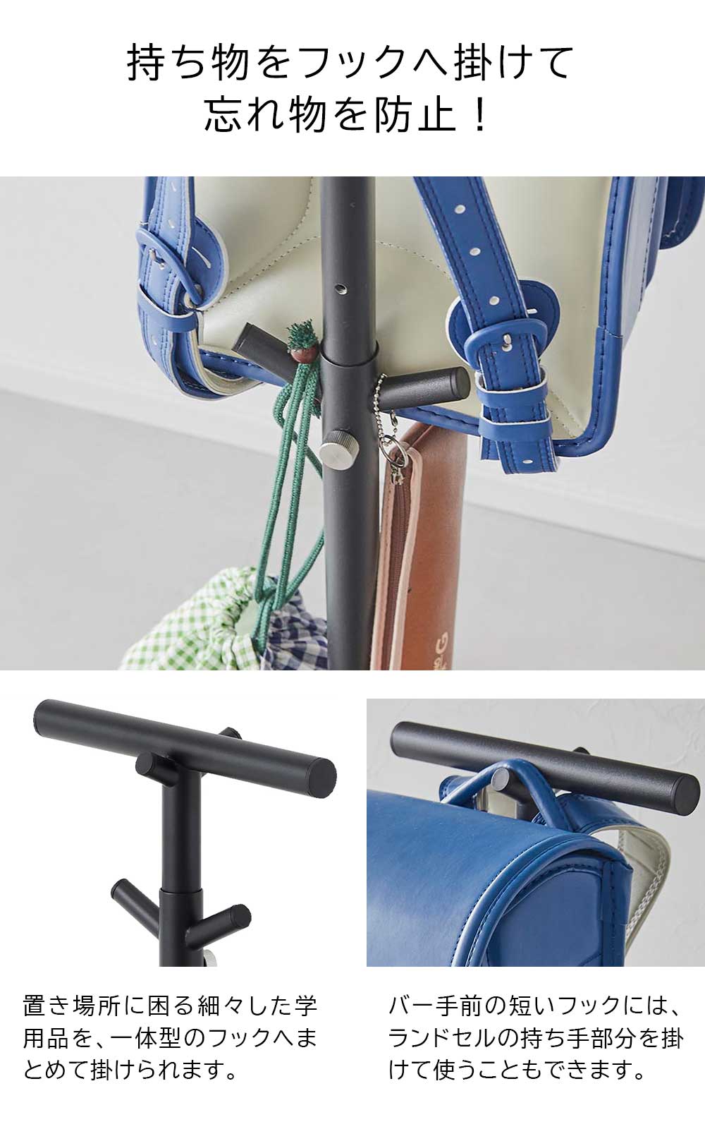 お子様の成長に合わせて お子様の成長に合わせて高さが調節できるランドセルスタンド。10cmごとに4段階高さが調節できます。ダイニングテーブルや学習机など、お子様が使いやすい高さに調節可能です。また、ランドセルを掛けたまま教科書やノートを取り出せ、宿題が終わればランドセルへすぐしまえ、お部屋が散らかることもありません。学用品を一括収納できるので、登校の準備もスタンド1つで完了します。未就学のお子様の通園バッグや帽子掛け、通勤バッグや洋服掛けなどにもご利用いただけ、長く役に立つ収納スタンドです。 ![]() ![]() ![]() ![]() ![]() ![]() ![]() ![]() ![]() ![]() ![]() ![]() |