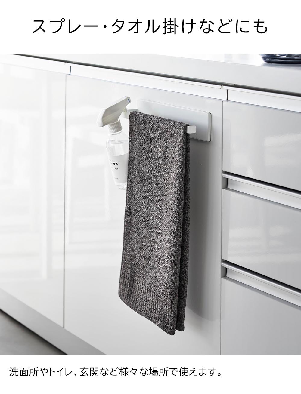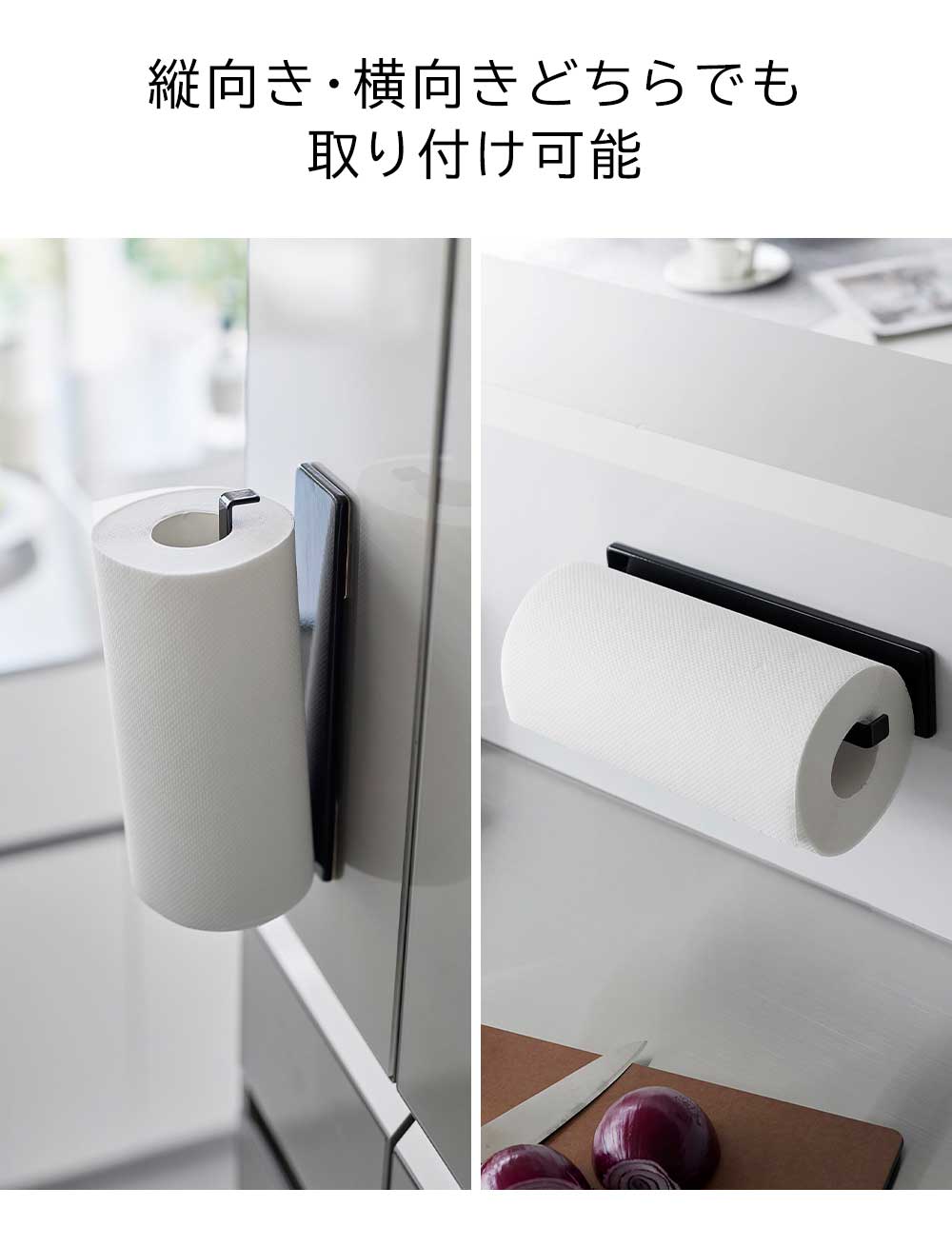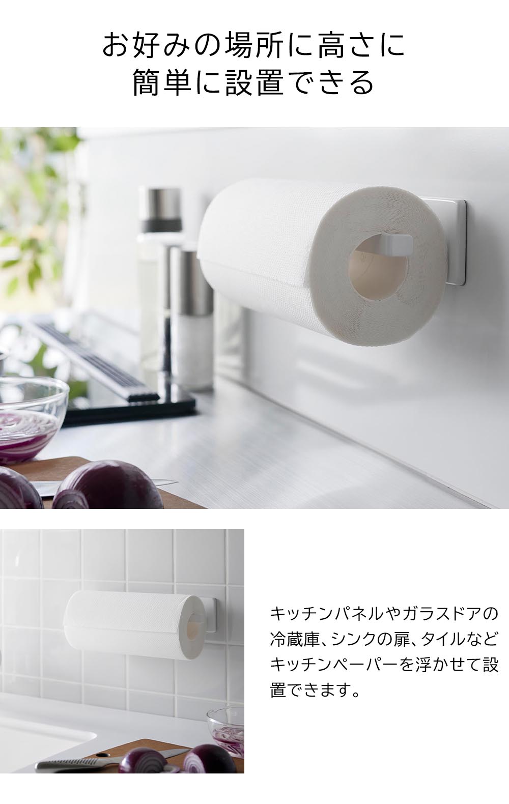 フィルムフックで壁面に設置 フィルムフックで浮かせて収納できるキッチンペーパーホルダー。お好みの位置に簡単に取り付けできます。また、縦向きで冷蔵庫に、横向きでキッチンパネルに、と取り付ける場所によって向きを変えられます。冷蔵庫やキッチンパネルの他に、光沢のあるシンク扉やタイルにも取り付け可能です。スプレーやタオル掛けとしても使え、洗面所やトイレ、玄関など様々な場所で活躍できるキッチンペーパーホルダーです。 ![]() ![]() ![]() ![]() ![]() ![]() ![]() ![]() ![]() ![]() ![]() |