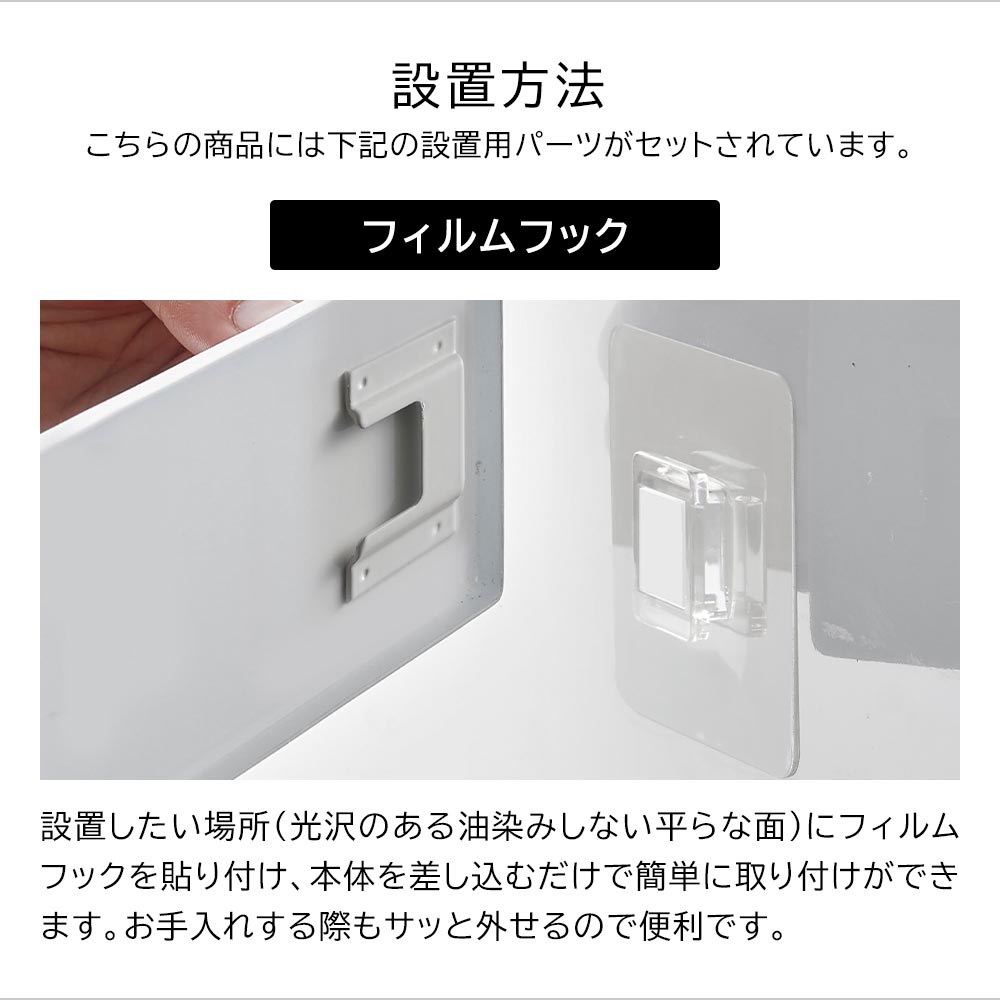 光沢のある平らな油染みしない面(フィルムフックの接着面よりも大きい面・タイル・プラスチック面・ステンレス・ガラス・金属塗装面・人工大理石)
