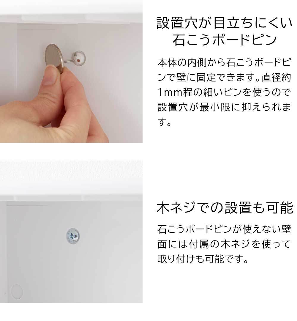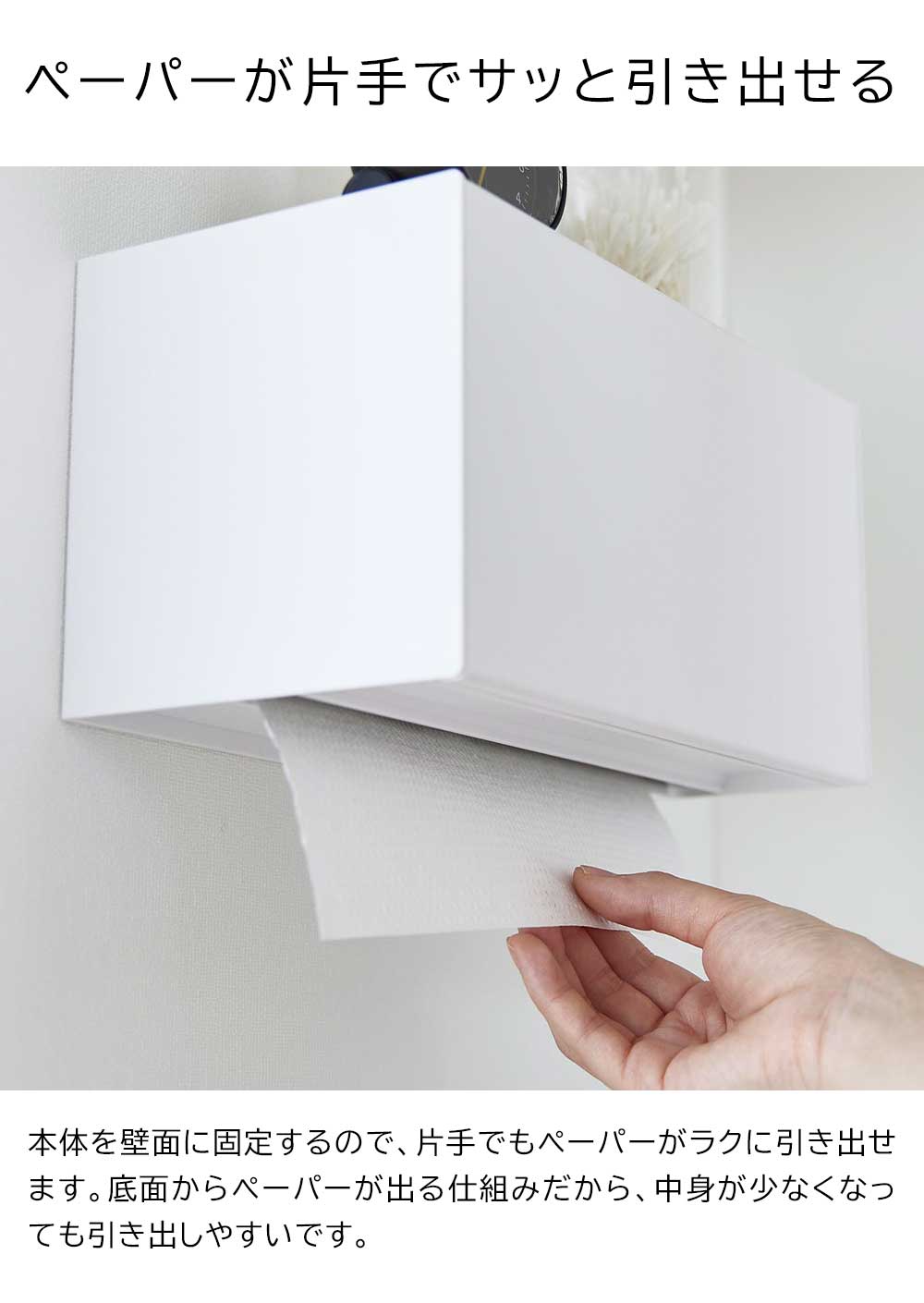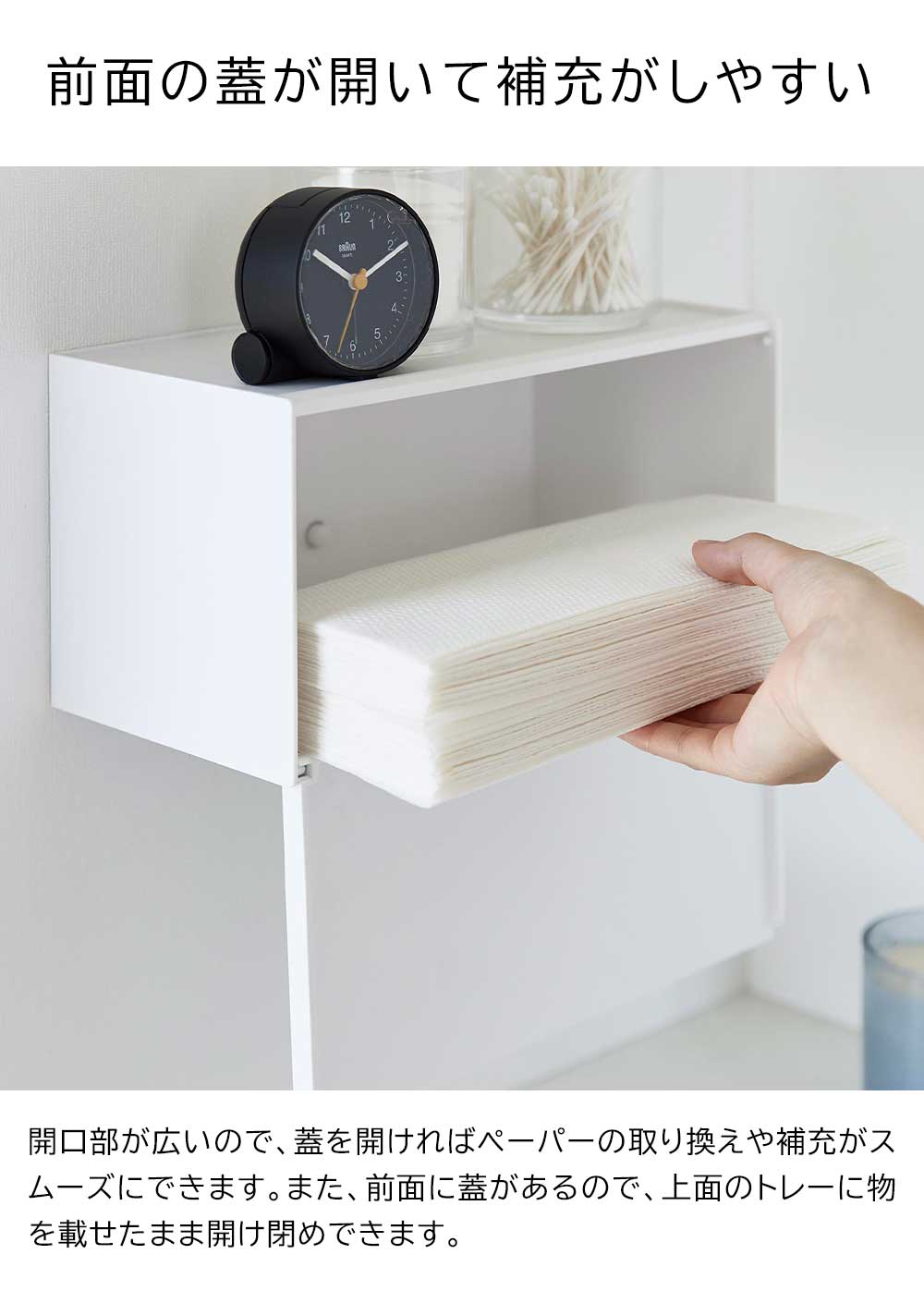 石こうボードピンで壁面設置 ペーパータオルやティッシュペーパーを壁面に設置できるシンプルなペーパーディスペンサーです。 壁の穴が目立ちにくい石こうボードピンで、洗面所やトイレなどお好みの場所に取り付けて、ペーパーをセットすればすぐに使えます。 底面からペーパーを簡単に引き出せる使いやすい設計。 前面の開口部が広いので、補充や取り換えに手間取ることはありません。 上面はトレーになっていて、スマートフォンの一時置きや小物のディスプレイができます。 ペーパーを個包装から出してそのままセットできる他、ボックスタイプ、ソフトパックタイプ、ロールタイプのペーパーに対応しているので、幅広くお使いいただけます。 ![]() ![]() ![]() ![]() ![]() ![]() ![]() ![]() ![]() ![]() ![]() ![]() ![]() |
