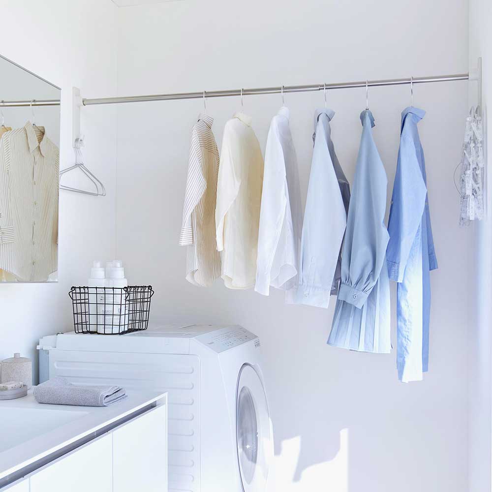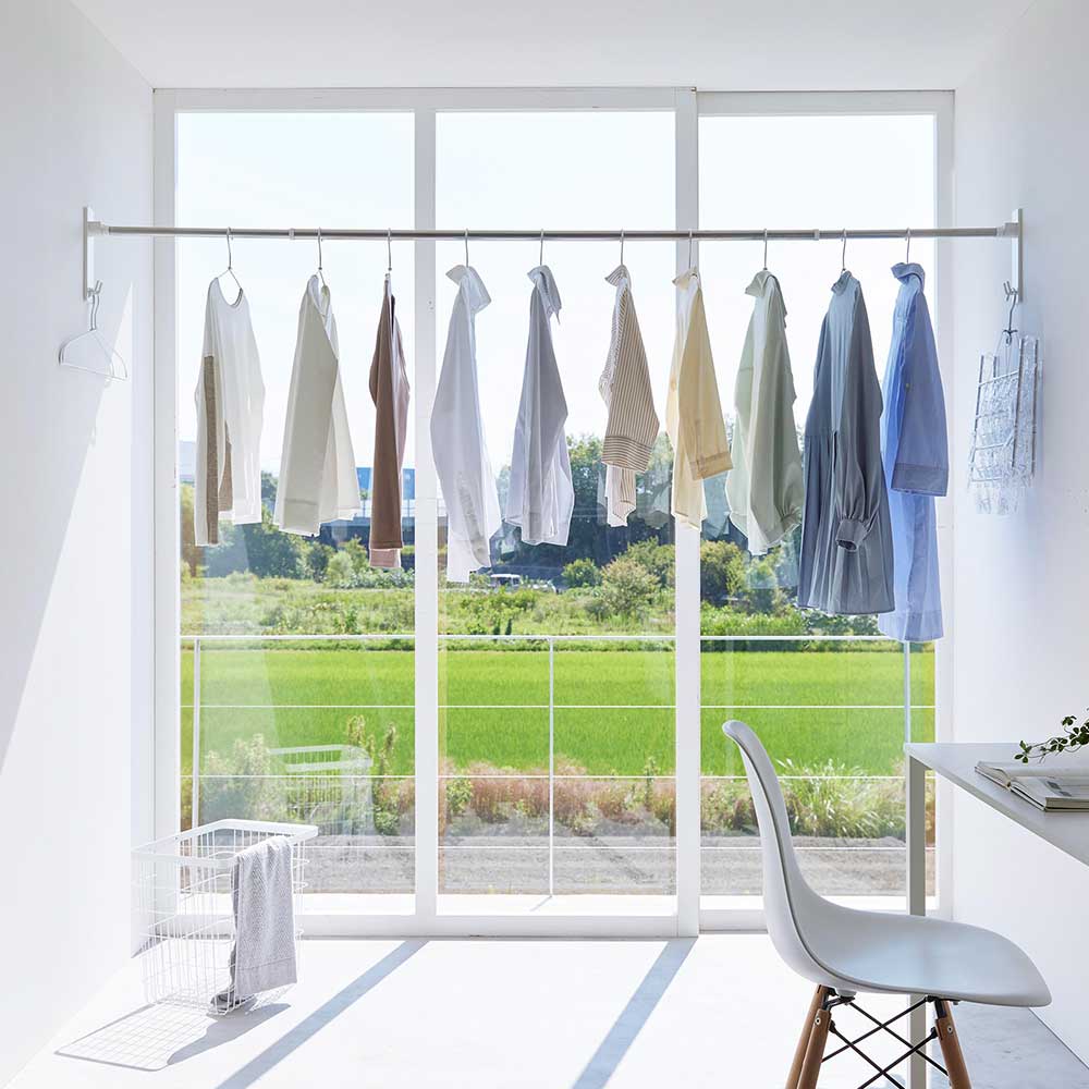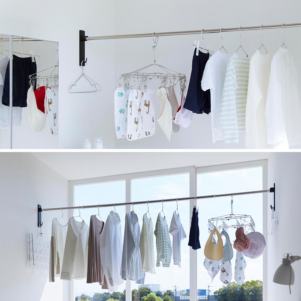 季節や天候、時間に左右されずに洗濯物が干せる、部屋干しにぴったりの室内用物干し竿ホルダーです。付属の石こうボードピンで壁面に取り付ければ設置完了!壁の穴跡が目立ちにくいのも嬉しいポイントです。洗面所やランドリールームなど、洗濯機の近くに設置すれば、洗濯物をスムーズに干せます。移動する手間も省けて、家事の効率も上がりますね!ワンルームなどの限られたスペースや、普段使わないリビングなどに設置すれば、空いているスペースの有効活用に。また、ホルダーにはフックが付いているので、ピンチハンガーや衣類ハンガーなどの引っ掛け収納ができて便利です。