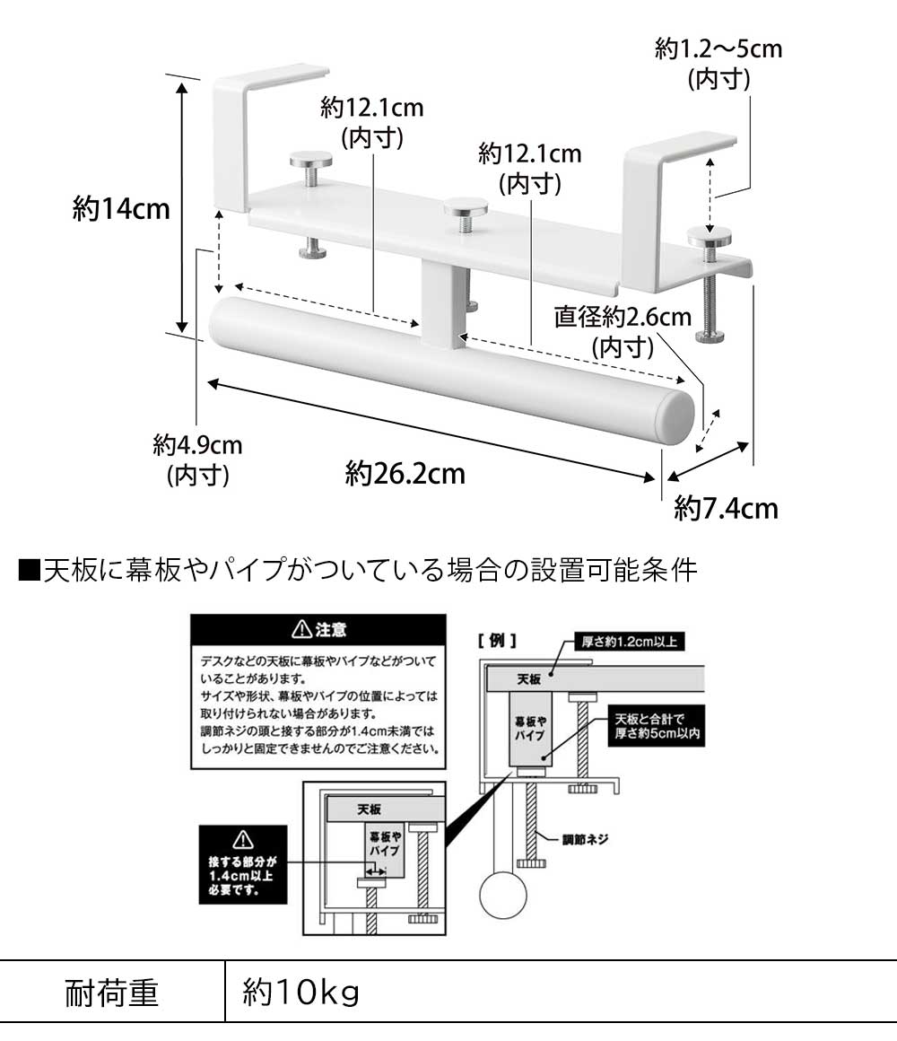 天板の厚さが約1.2~5cm(幕板やパイプなど含む)・ 幅約26.2cm以上(脚含まず)・奥行き約7.4cm以上のデスクやテーブル、キッチンカウンター