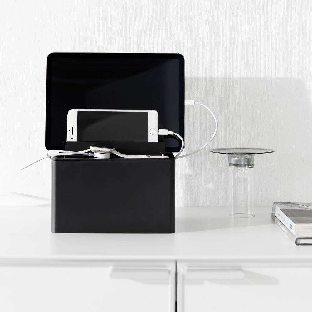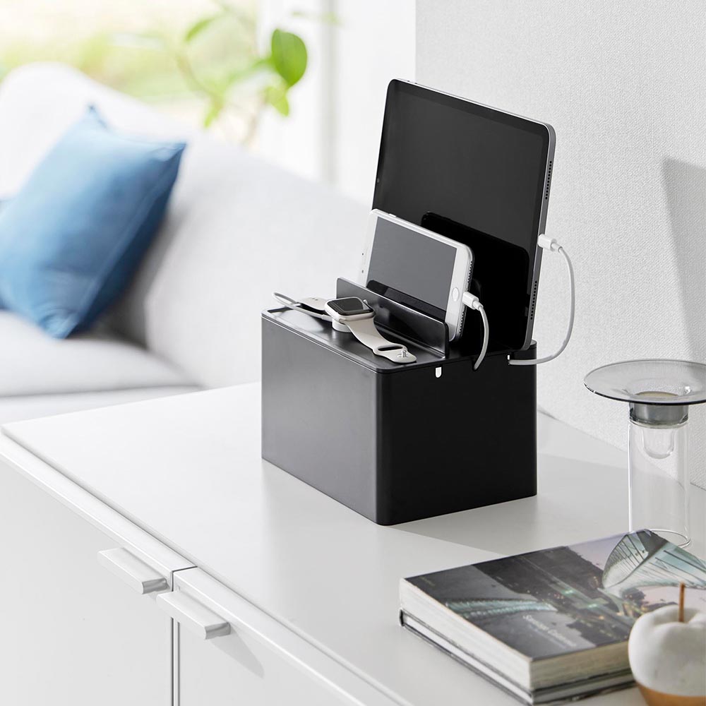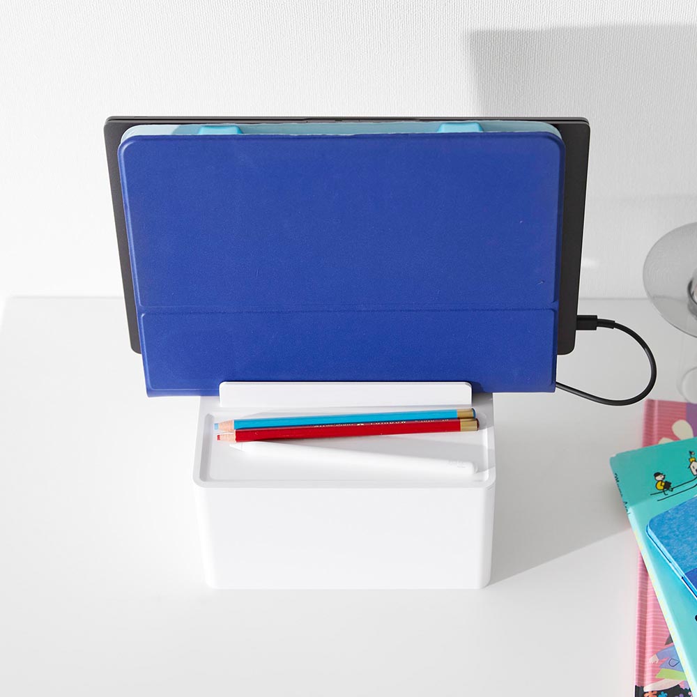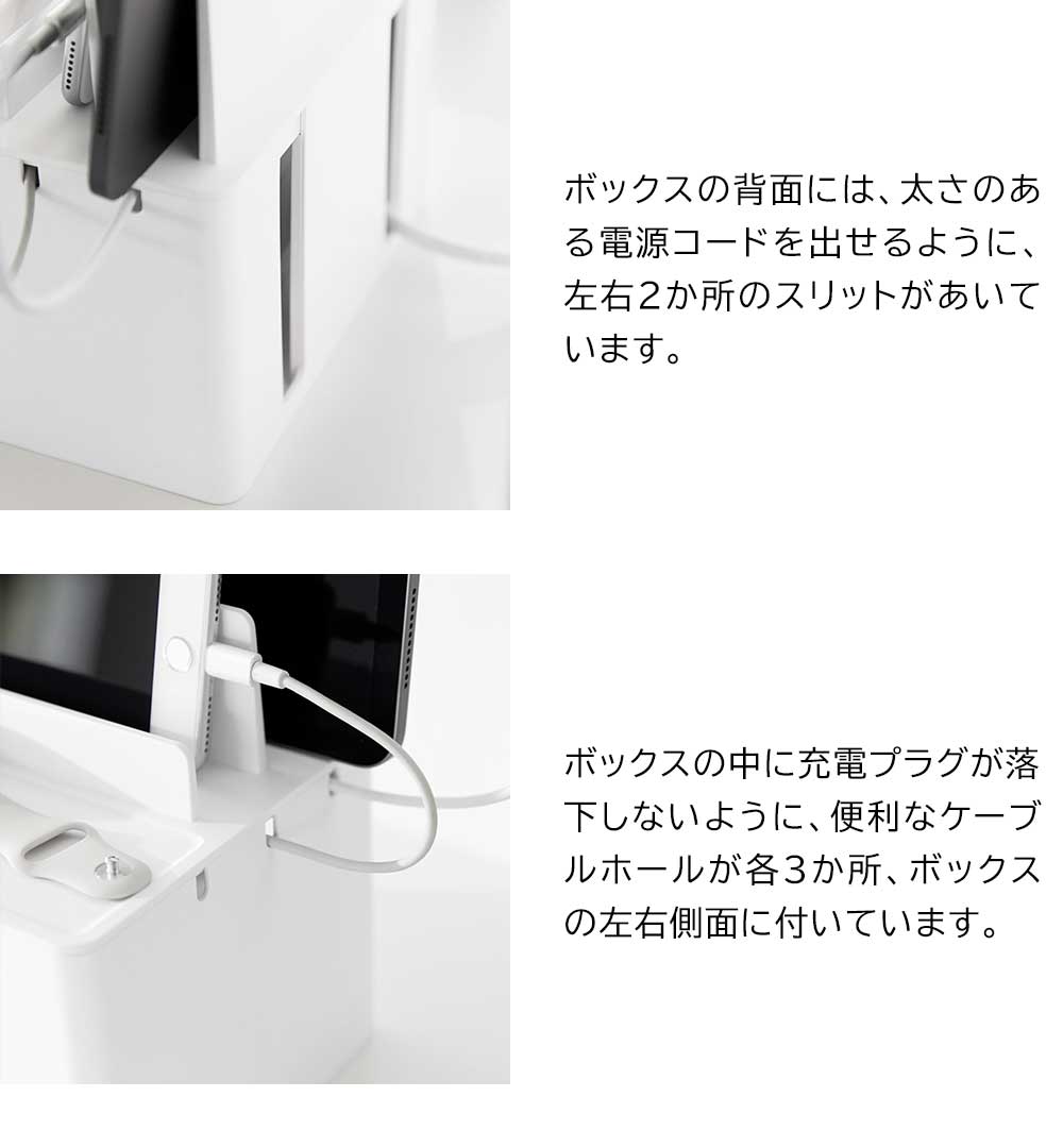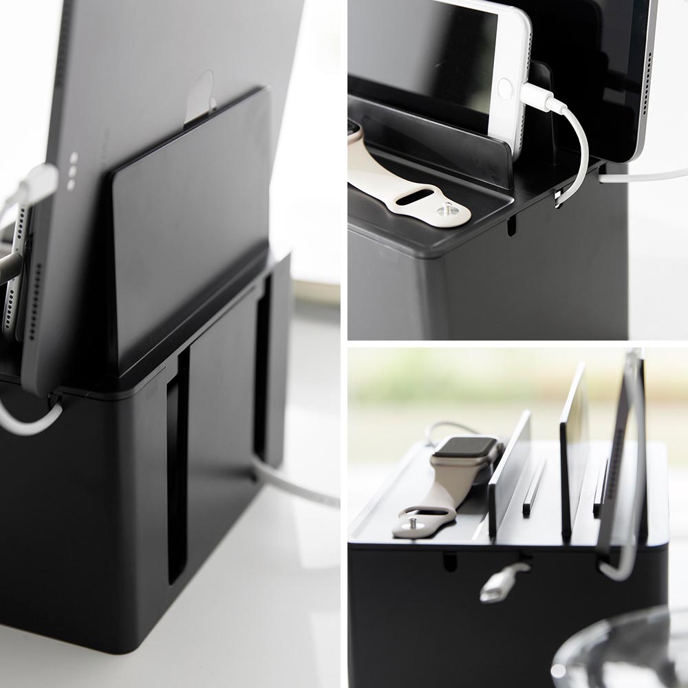 充電したままガジェット類を スマートフォンやタブレットなどのガジェット類を、充電したままスッキリと収納できる充電ステーションです。ゴチャつく電源タップやコードを、ボックスの中に隠して充電器をセットできるので、見た目にもスッキリ!背面には大きくあいたスリットが2か所あり、太さのある電源コードも出すことができます。またボックスの左右に3か所ずつ、充電プラグを引っ掛けられるケーブルホール付き。充電プラグがボックスの中に落下して、充電する際に探さなければいけない…なんて煩わしさもなくなりますね。もちろん、ガジェットスタンドとしても便利に使えます。後方に向かって仕切り板が高くなり、ガジェットのサイズに合わせて収納できたり、タブレットなどの角度を調節して立て掛けられたりと機能性も◎ 机の上で置き場所に困る、お子様の学習用タブレットと文具類の収納にもピッタリです。 ![]() ![]() ![]() ![]() ![]() ![]() ![]() ![]() ![]() ![]() ![]() ![]() |