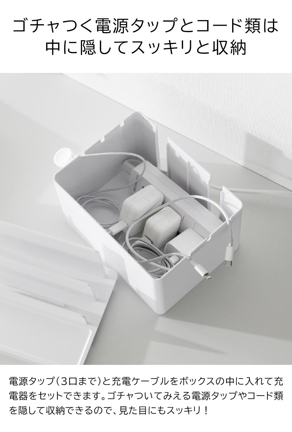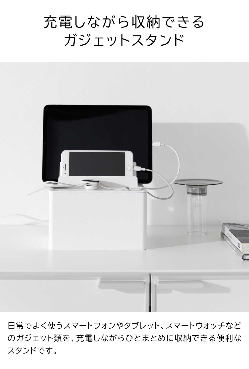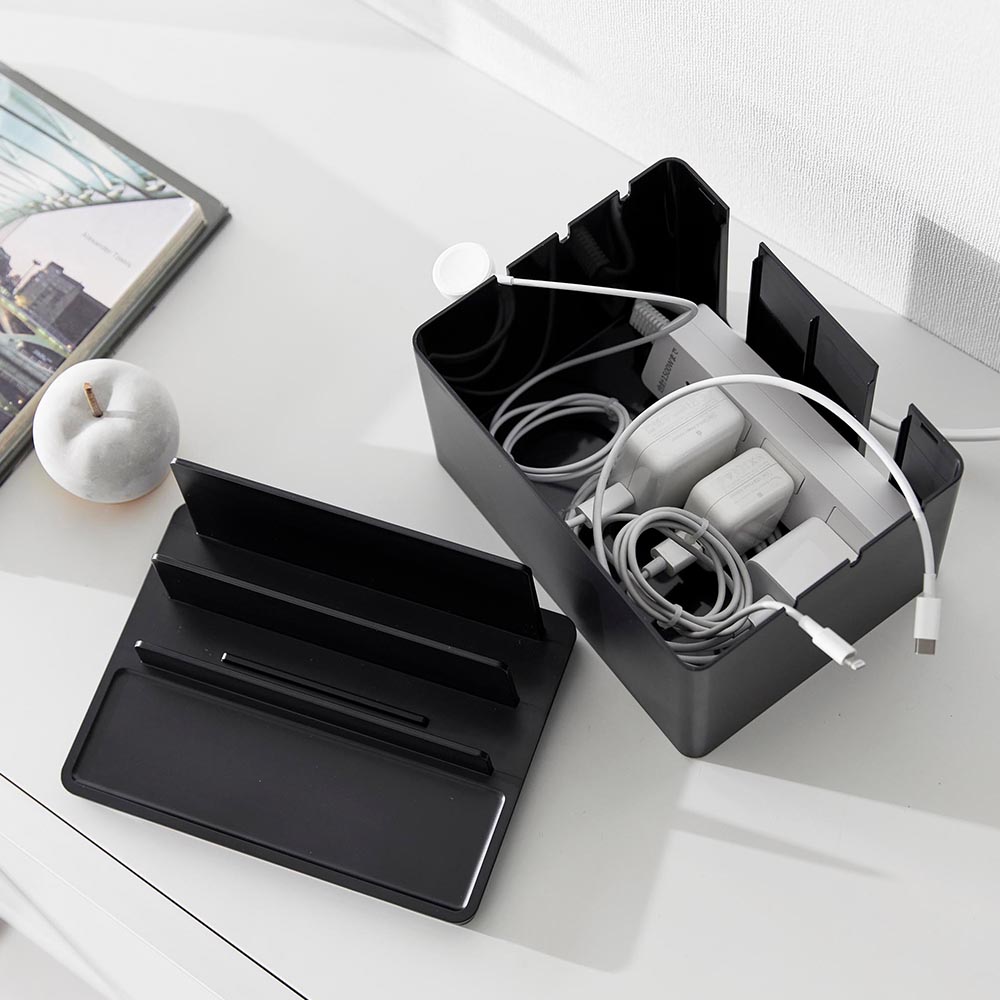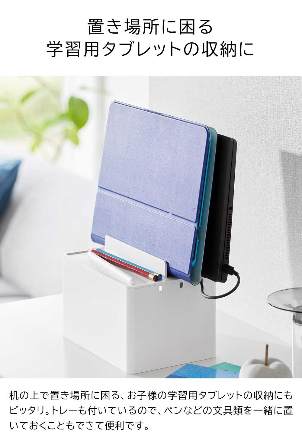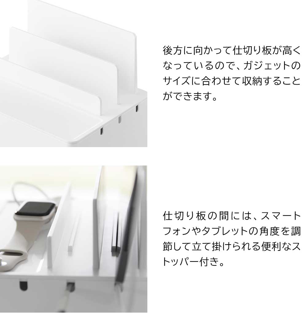 充電したままガジェット類を スマートフォンやタブレットなどのガジェット類を、充電したままスッキリと収納できる充電ステーションです。ゴチャつく電源タップやコードを、ボックスの中に隠して充電器をセットできるので、見た目にもスッキリ!背面には大きくあいたスリットが2か所あり、太さのある電源コードも出すことができます。またボックスの左右に3か所ずつ、充電プラグを引っ掛けられるケーブルホール付き。充電プラグがボックスの中に落下して、充電する際に探さなければいけない…なんて煩わしさもなくなりますね。もちろん、ガジェットスタンドとしても便利に使えます。後方に向かって仕切り板が高くなり、ガジェットのサイズに合わせて収納できたり、タブレットなどの角度を調節して立て掛けられたりと機能性も◎ 机の上で置き場所に困る、お子様の学習用タブレットと文具類の収納にもピッタリです。 ![]() ![]() ![]() ![]() ![]() ![]() ![]() ![]() ![]() ![]() ![]() ![]() |