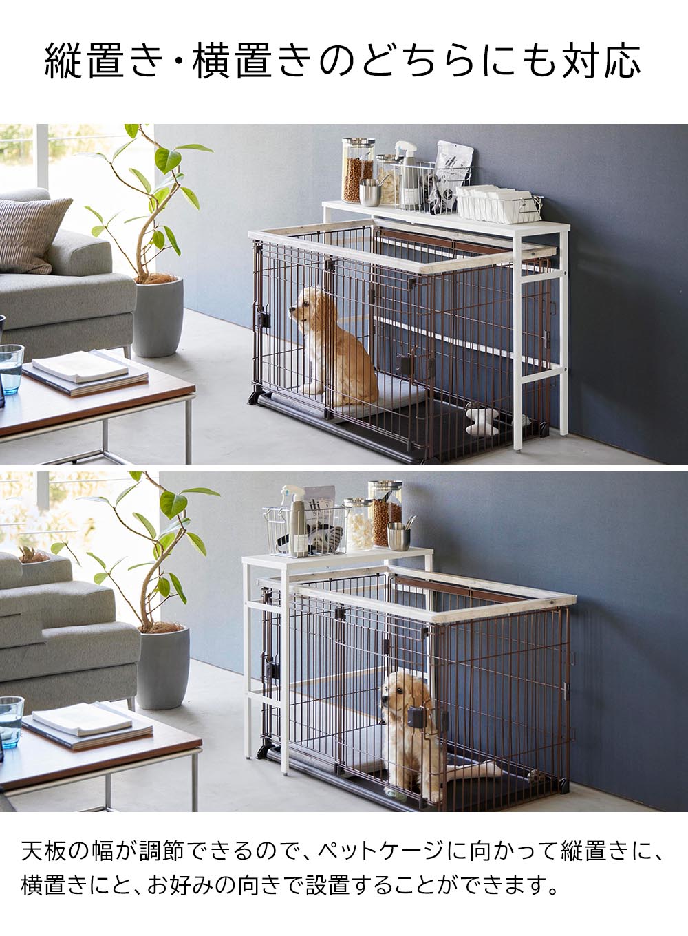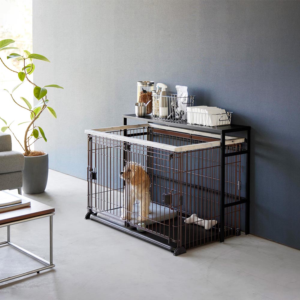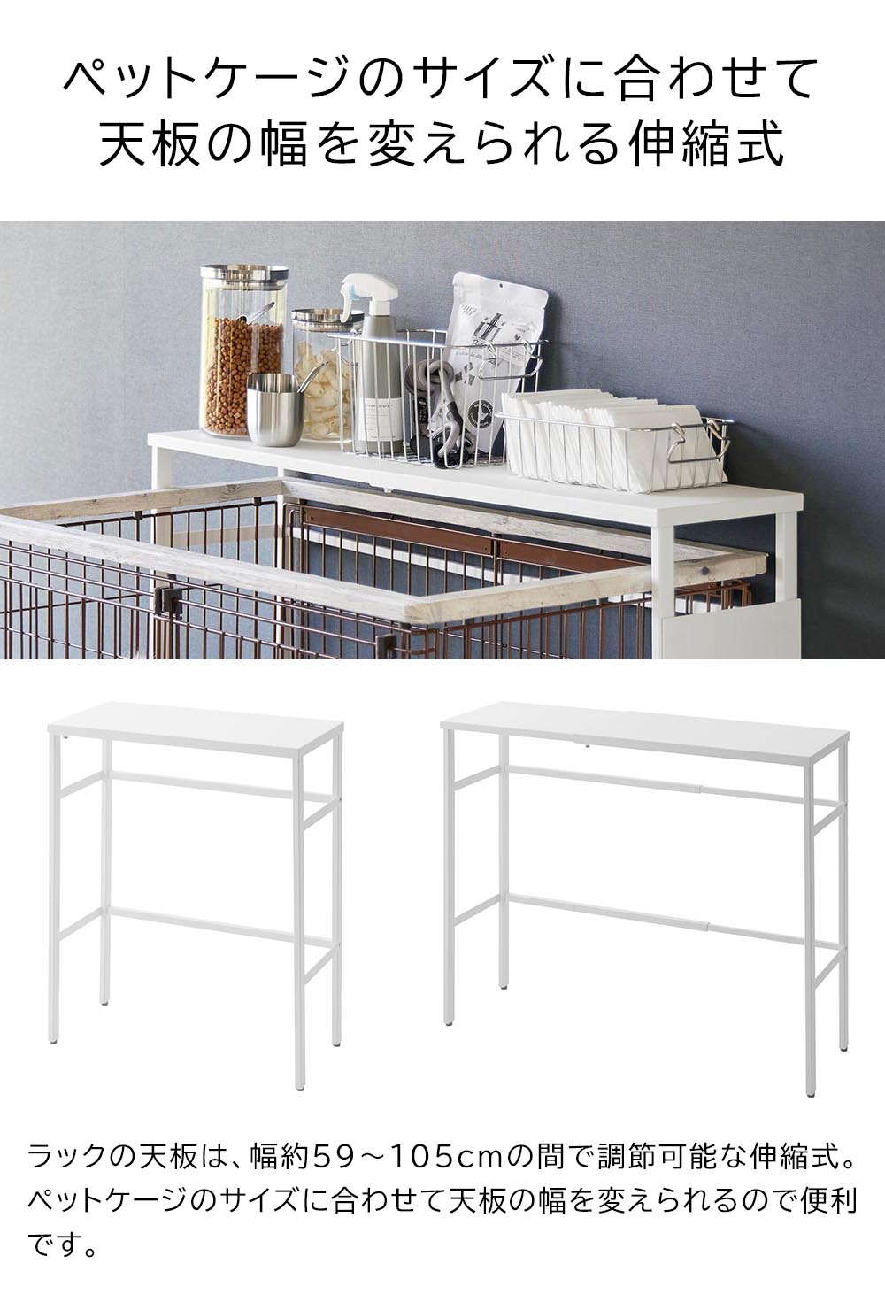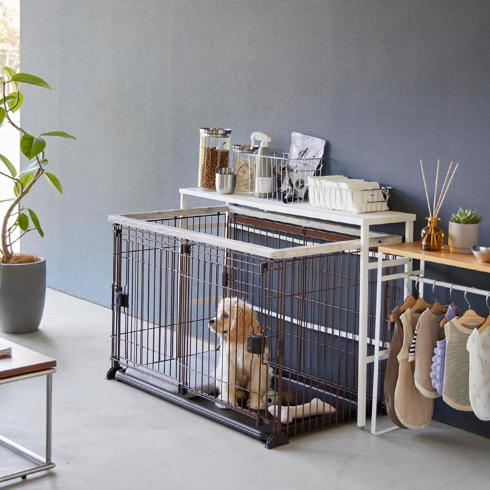 ペットケージ上のデッドスペースを有効活用して、ゴチャつくペット用品をスッキリ収納できる便利なペットケージ上ラックです。このラックは天板の幅を変えることができる伸縮式。ペットケージの大きさに合わせて変えられて便利に使えます。また、伸縮することで、縦置き・横置きとお好みの向きで設置できます。シンプルなデザインなのでどんなお部屋にもしっくりと馴染むのも嬉しいポイントです。