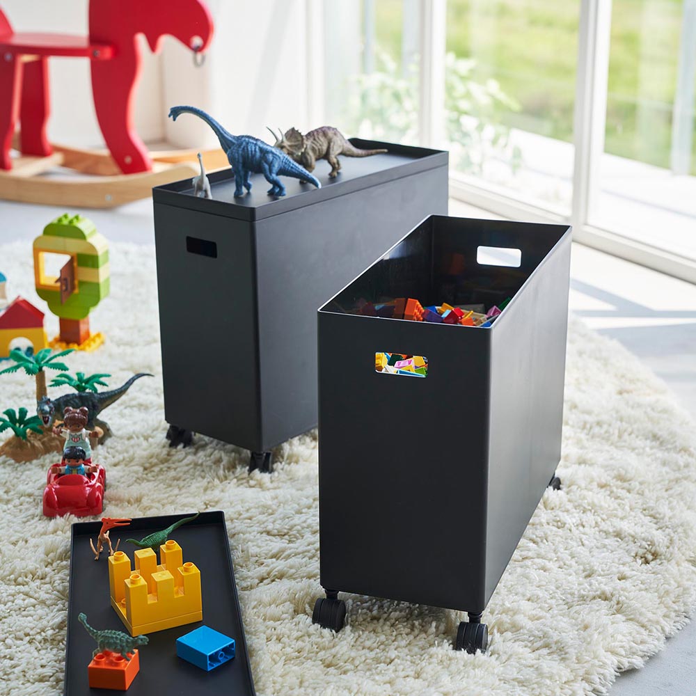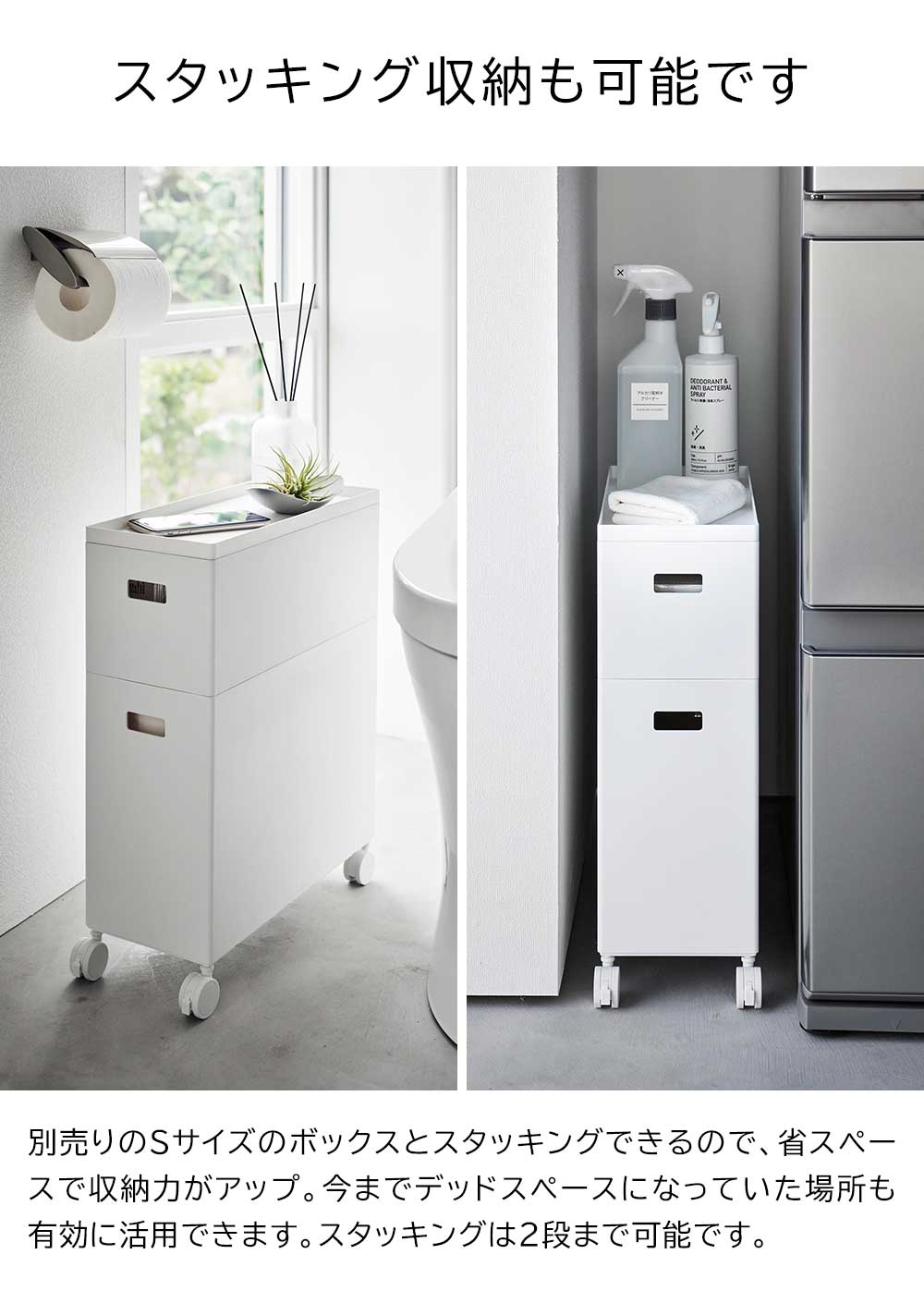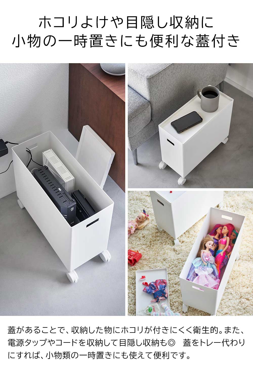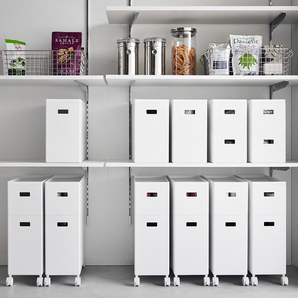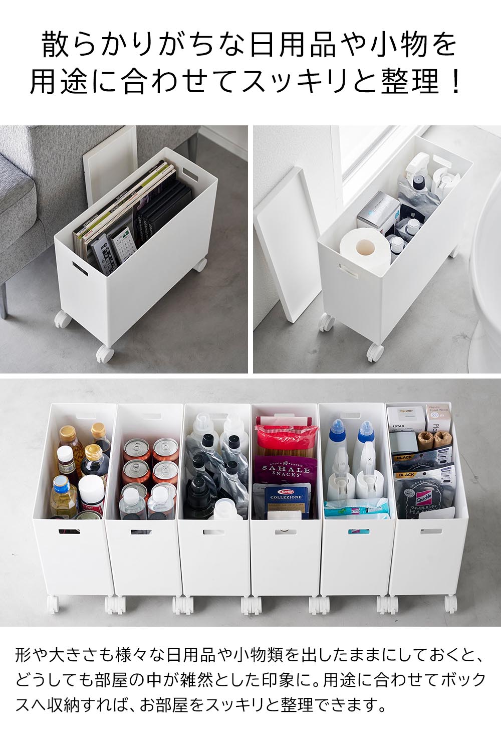 用途に合わせて様々な物を収納できる、Lサイズの蓋付き収納ボックスワゴンです。散らかりがちな日用品や小物を、用途に合わせてボックスへ収納すれば、スッキリとしたお部屋の印象に。蓋付きなので目隠し収納ができ、中に収納した物にホコリが付きにくく衛生的です。蓋をトレーとして小物類の一時置きにも使っても◎ 幅15.5cmとスリムなサイズで、狭い場所や隙間に収納できるのも嬉しいポイント。キャスターと持ち手が付いているので、ストック用品の詰め替えや掃除をする時に、ラクに移動できます。また、収納する場所や用途に合わせて、キャスターを取り外して使っても便利です。別売りのSサイズのボックスとスタッキングができ、省スペースで収納力がアップします。どんなお部屋にもなじむシンプルなデザインなので、リビングやパントリー、ランドリーやトイレなど様々な場所の整理整頓にピッタリです。
