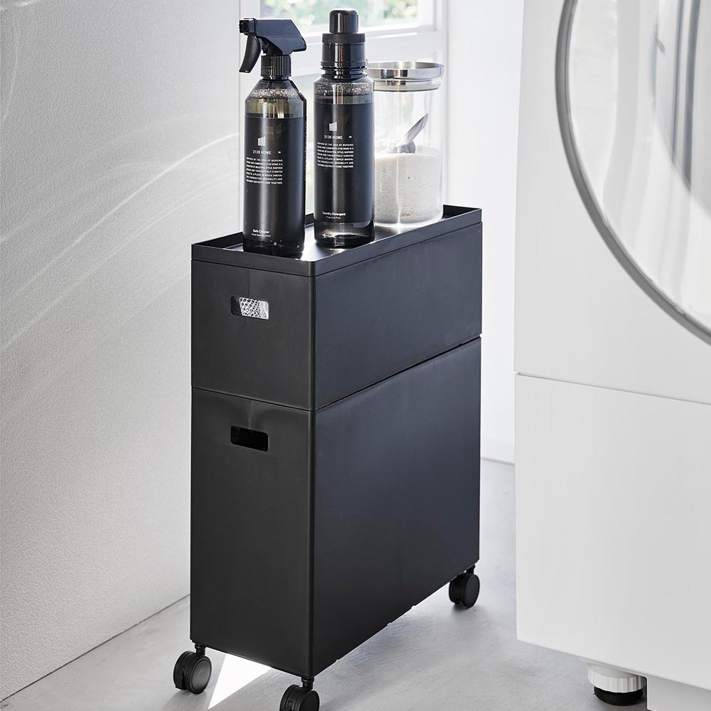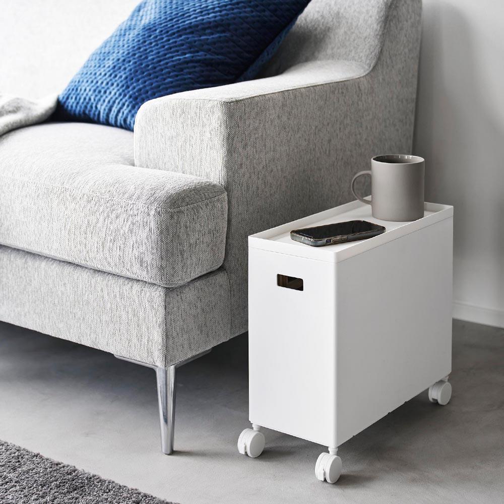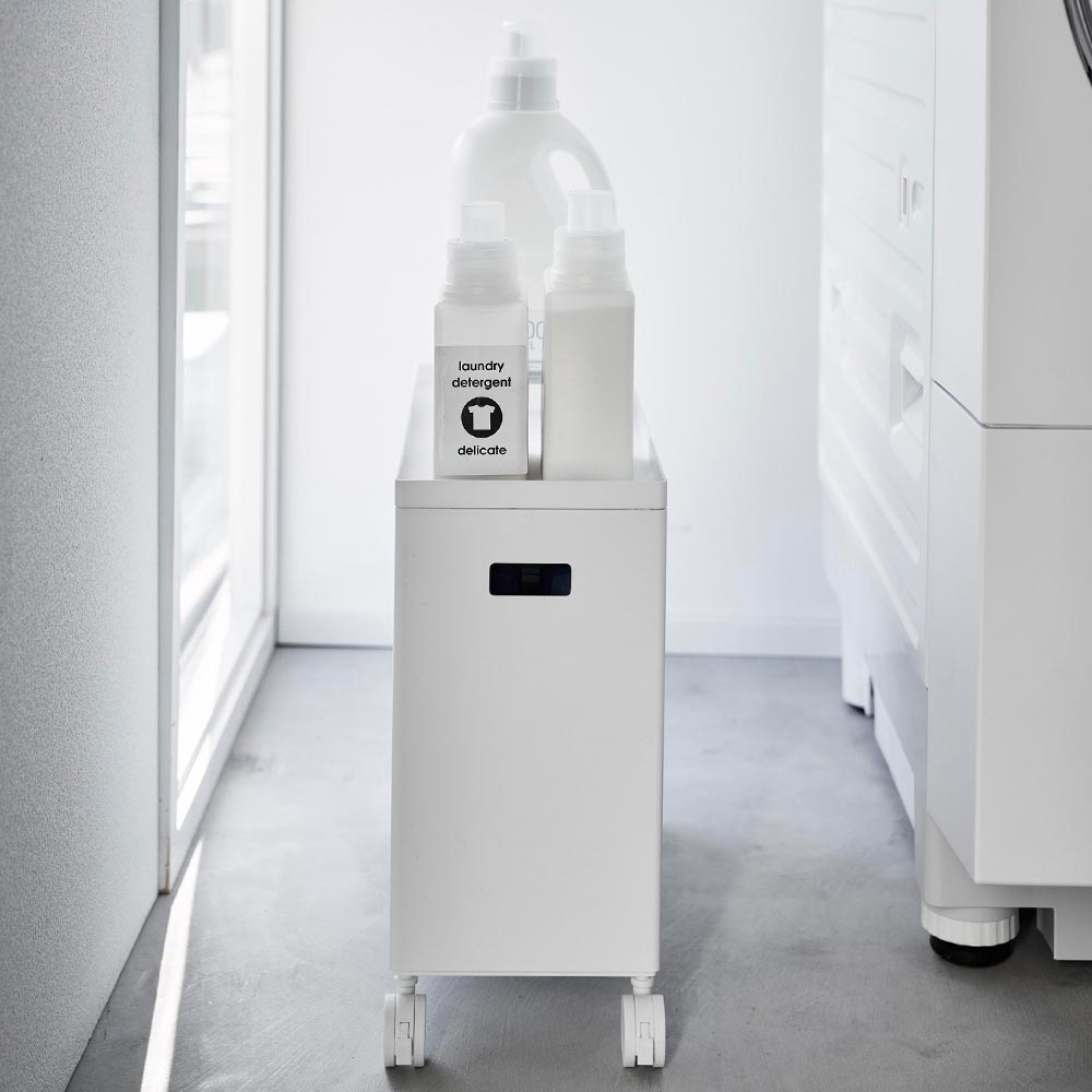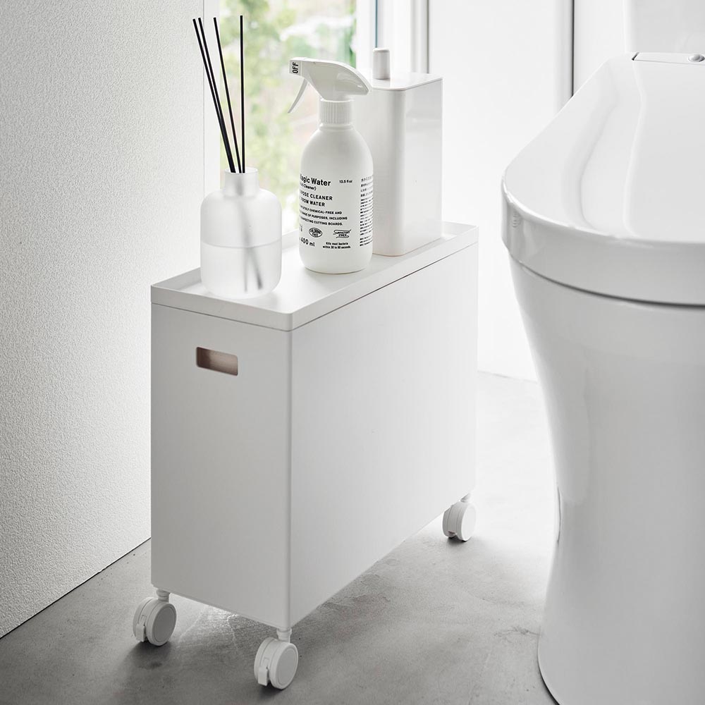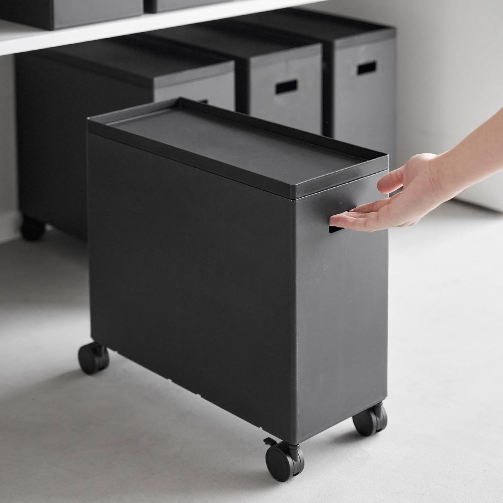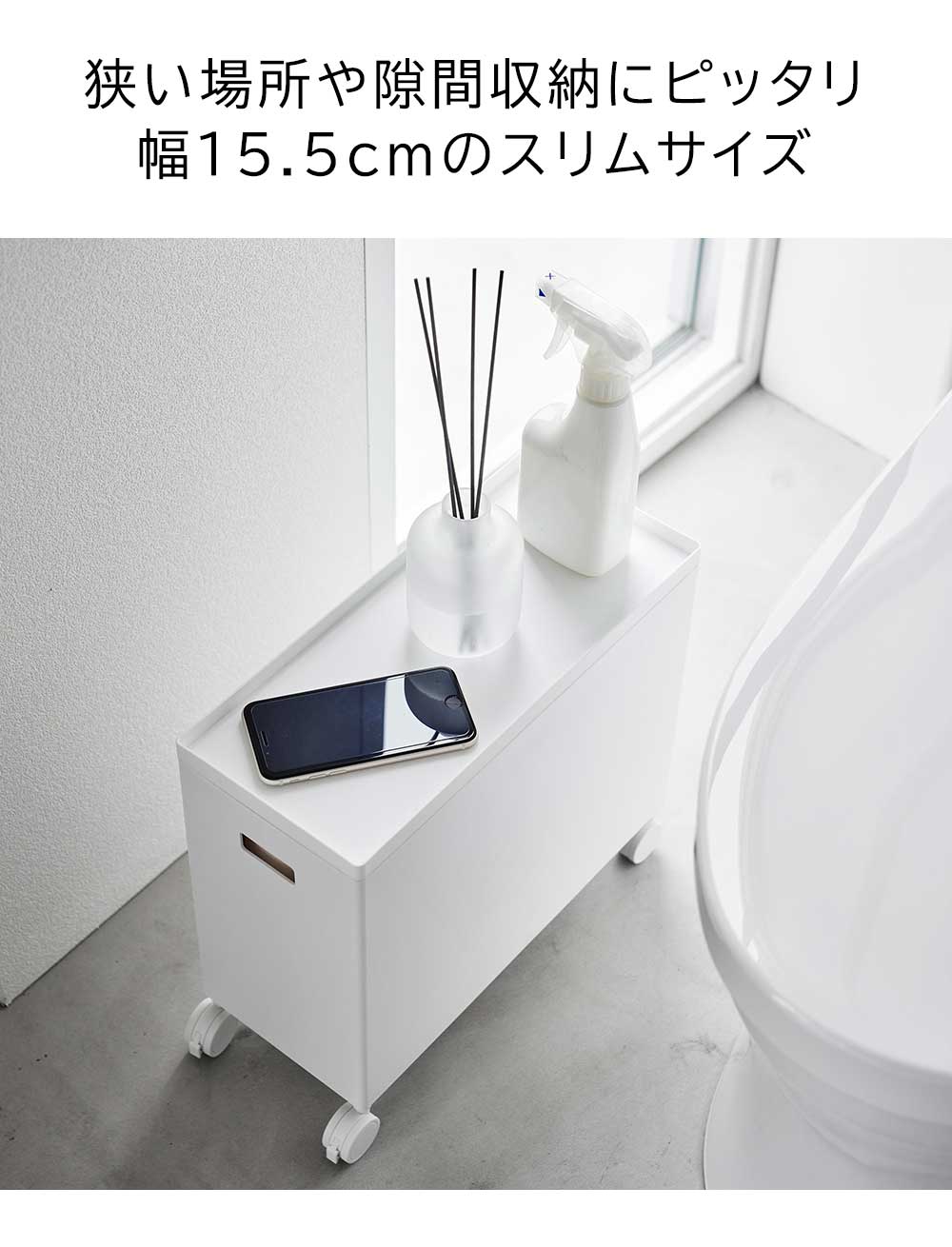 用途に合わせて様々な物を収納できる、Lサイズの蓋付き収納ボックスワゴンです。散らかりがちな日用品や小物を、用途に合わせてボックスへ収納すれば、スッキリとしたお部屋の印象に。蓋付きなので目隠し収納ができ、中に収納した物にホコリが付きにくく衛生的です。蓋をトレーとして小物類の一時置きにも使っても◎ 幅15.5cmとスリムなサイズで、狭い場所や隙間に収納できるのも嬉しいポイント。キャスターと持ち手が付いているので、ストック用品の詰め替えや掃除をする時に、ラクに移動できます。また、収納する場所や用途に合わせて、キャスターを取り外して使っても便利です。別売りのSサイズのボックスとスタッキングができ、省スペースで収納力がアップします。どんなお部屋にもなじむシンプルなデザインなので、リビングやパントリー、ランドリーやトイレなど様々な場所の整理整頓にピッタリです。