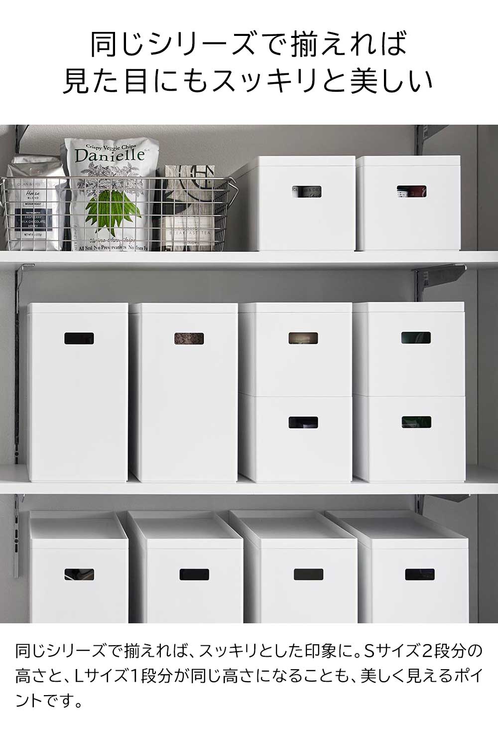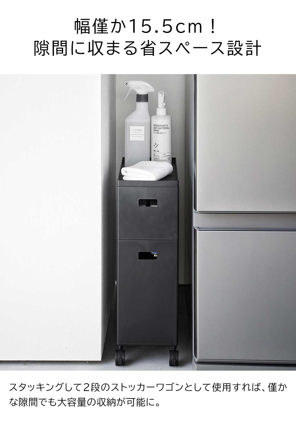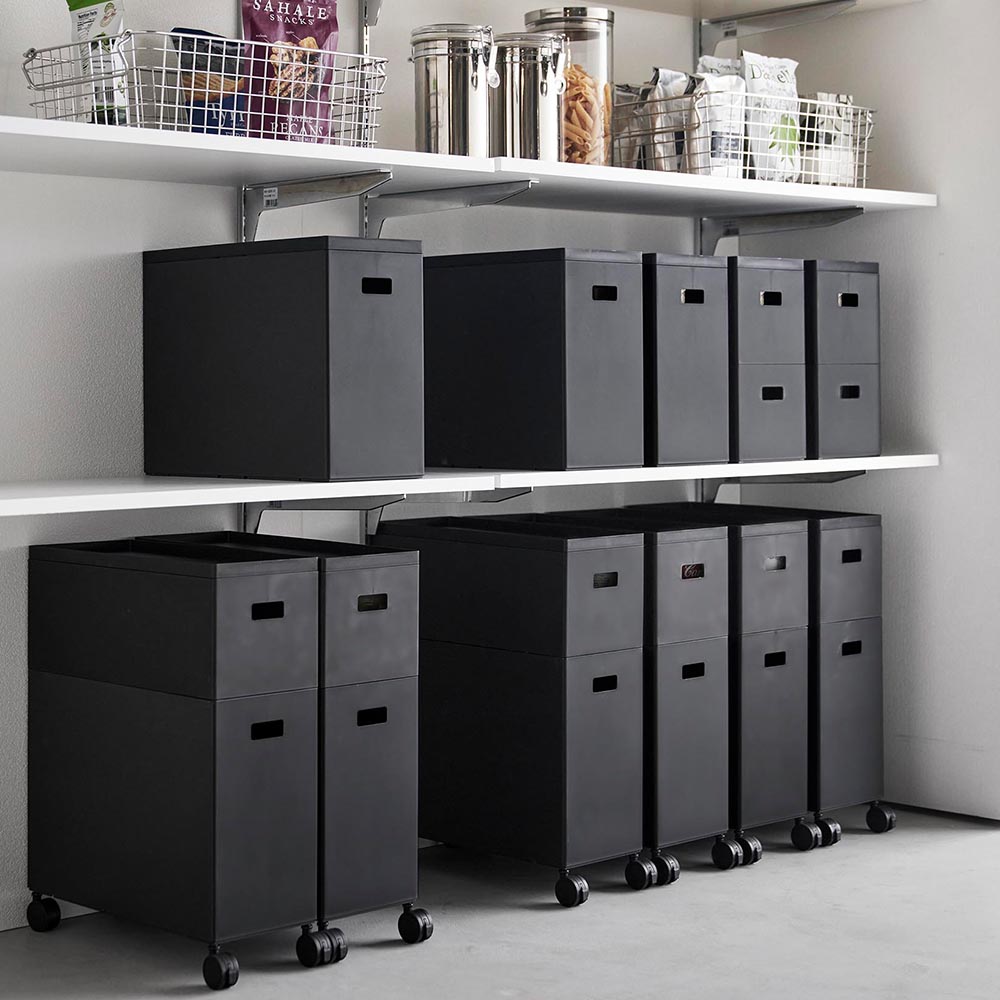 別売りの「蓋付き収納ボックスワゴン タワー S」「蓋付き収納ボックスワゴン タワー L」とスタッキングできる、Sサイズの追加ボックスです。このボックスを追加すれば、簡単に収納力がアップ!ストック用品や小物類が増えても安心です。ボックスの幅がスリムなので、僅かなスペースにも収まります。同じシリーズで揃えることで、スッキリとした印象に。