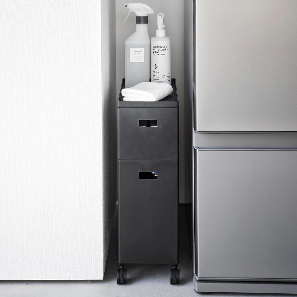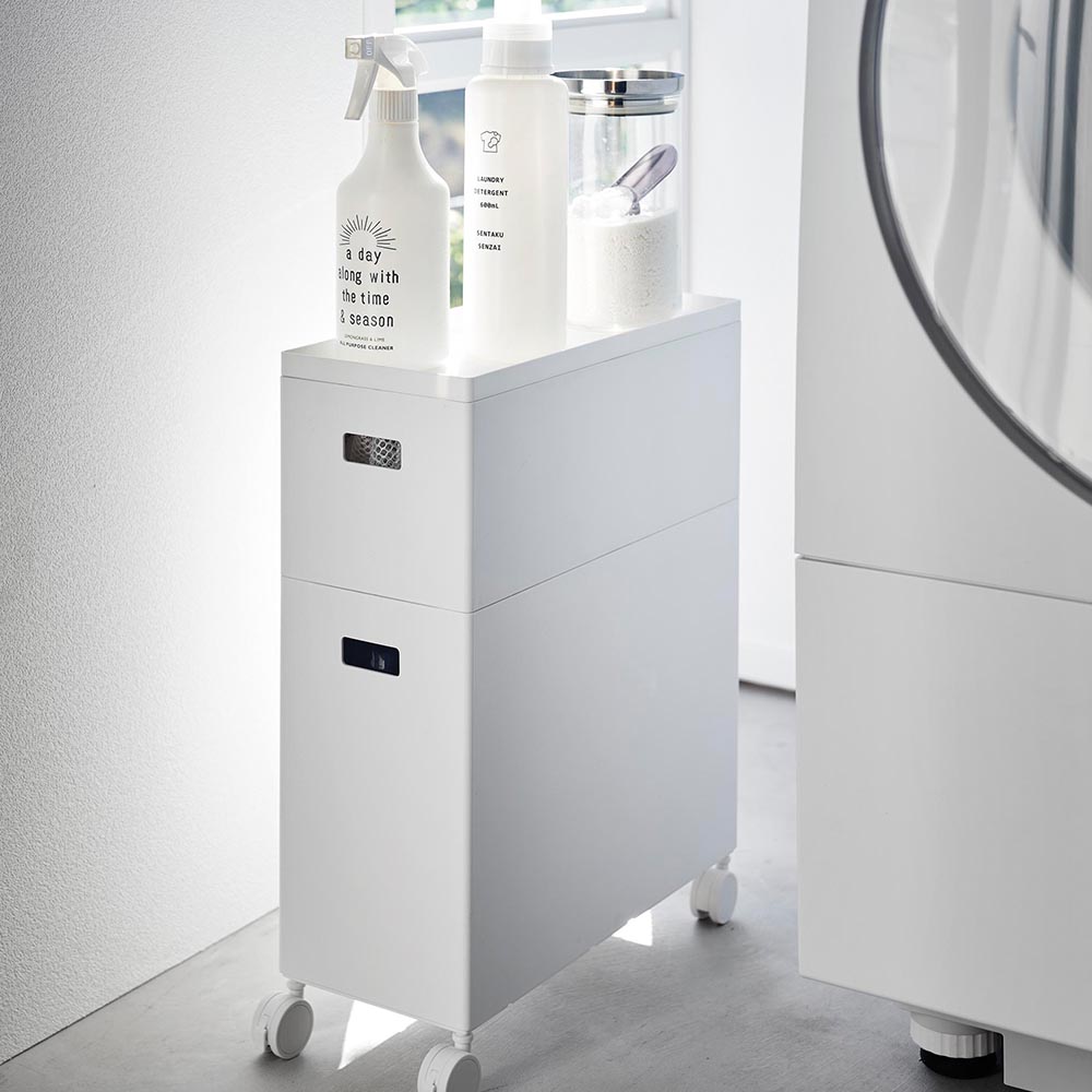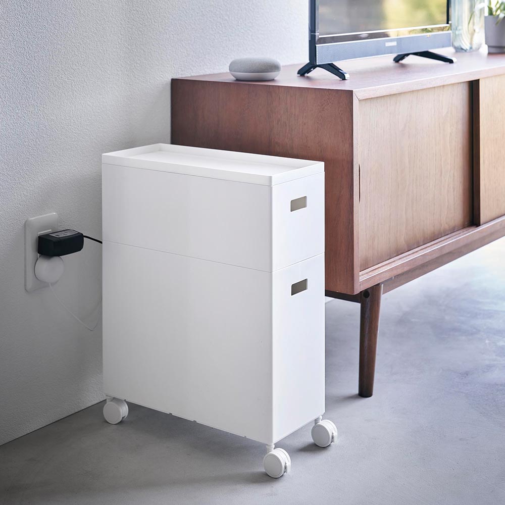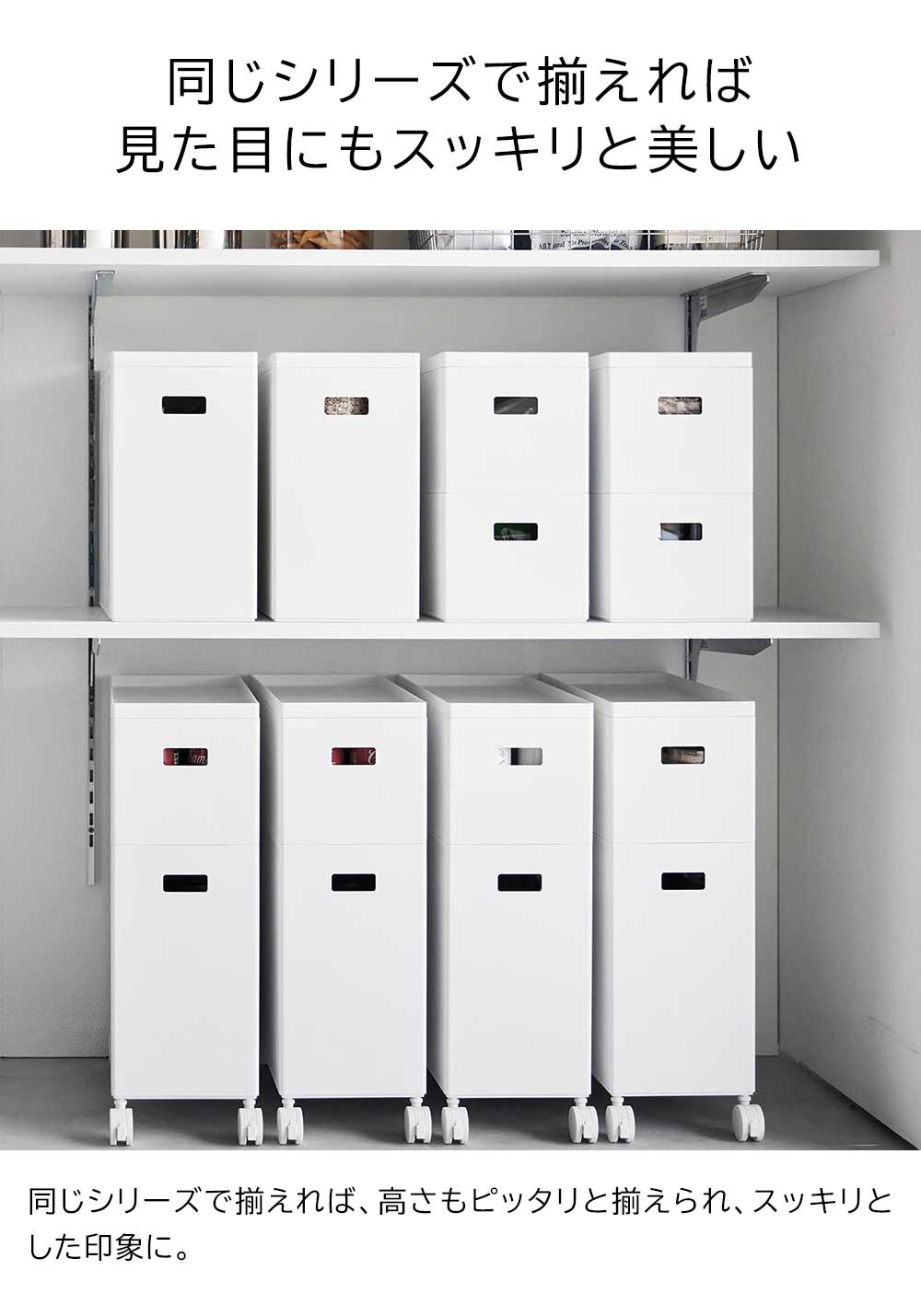 別売りの「蓋付き収納ボックスワゴン タワー S」とスタッキングできる、Lサイズの追加ボックスです。このボックスを追加すれば、簡単に収納力がアップ!ストック用品や小物類が増えても安心です。ボックスの幅がスリムなので、僅かなスペースにも収まります。同じシリーズで揃えることで、スッキリとした印象に。