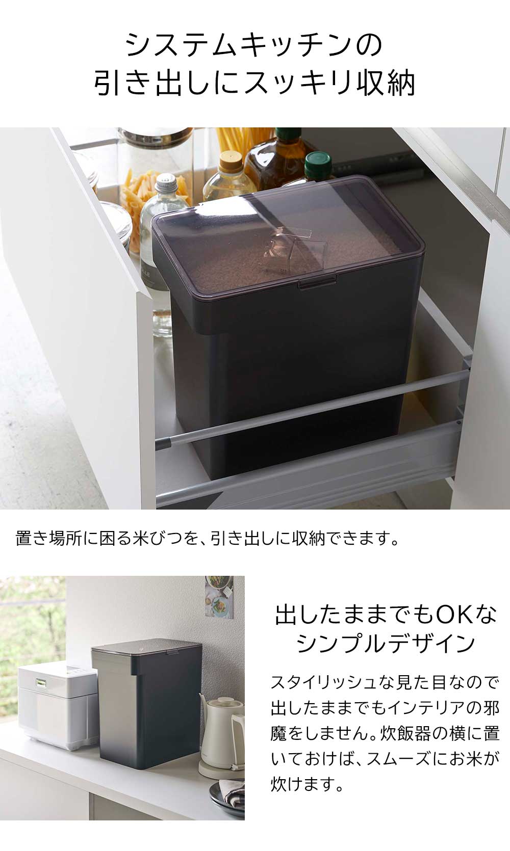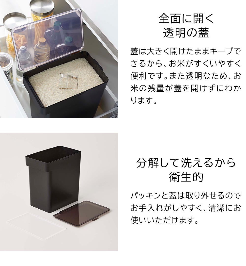 シンク下にスッキリ収納! かさばって置き場所に困る米びつですが、こちらはシンク下の引き出しに収めることができるのでキッチンがスッキリと片付きます。スタイリッシュなデザインなので出したままでもオシャレ、炊飯器の横に置いておけばスムーズにお米が炊けます。パッキン付きで密閉でき、お米を湿気や酸化から守ります。蓋が透明なので開けずに残量がわかり便利です。お米が量りやすい段々計量カップ付き。 ![]() ![]() ![]() ![]() ![]() ![]() ![]() ![]() ![]() ![]() ![]() ![]() ![]() |