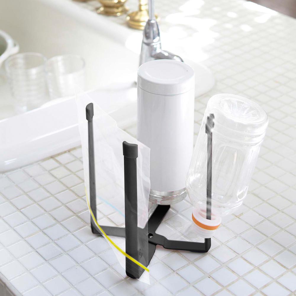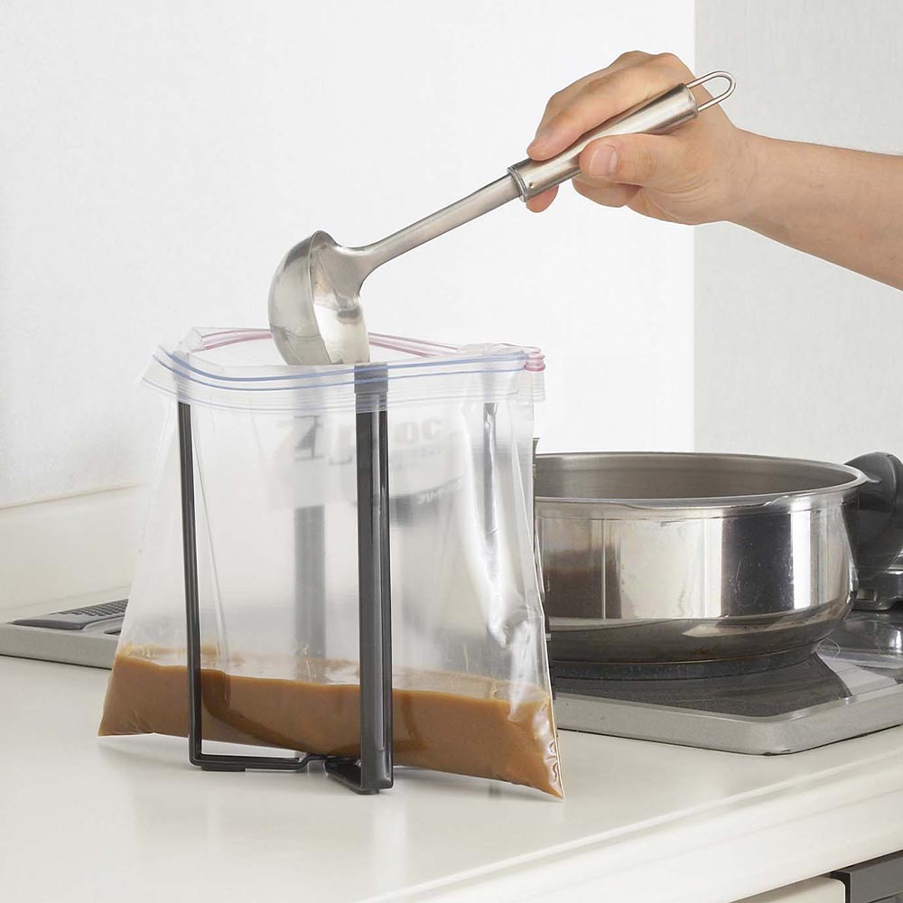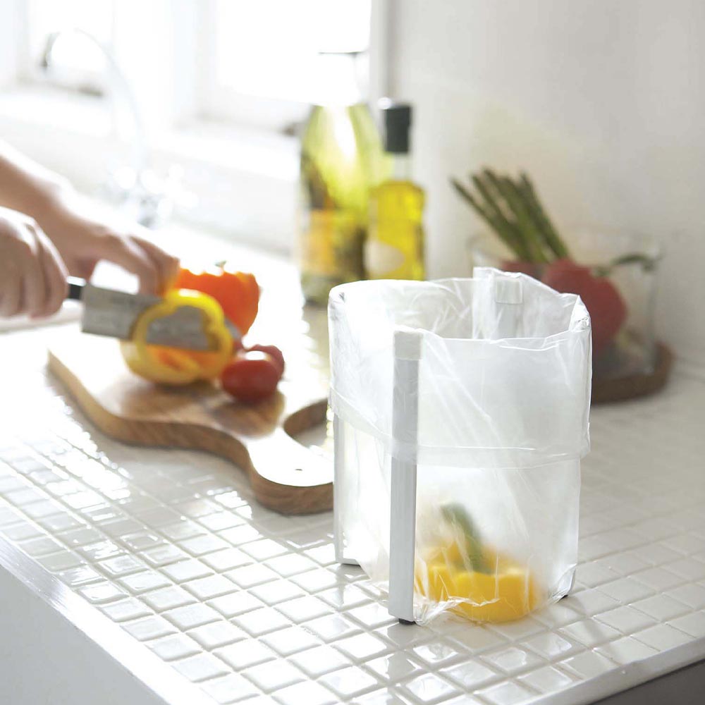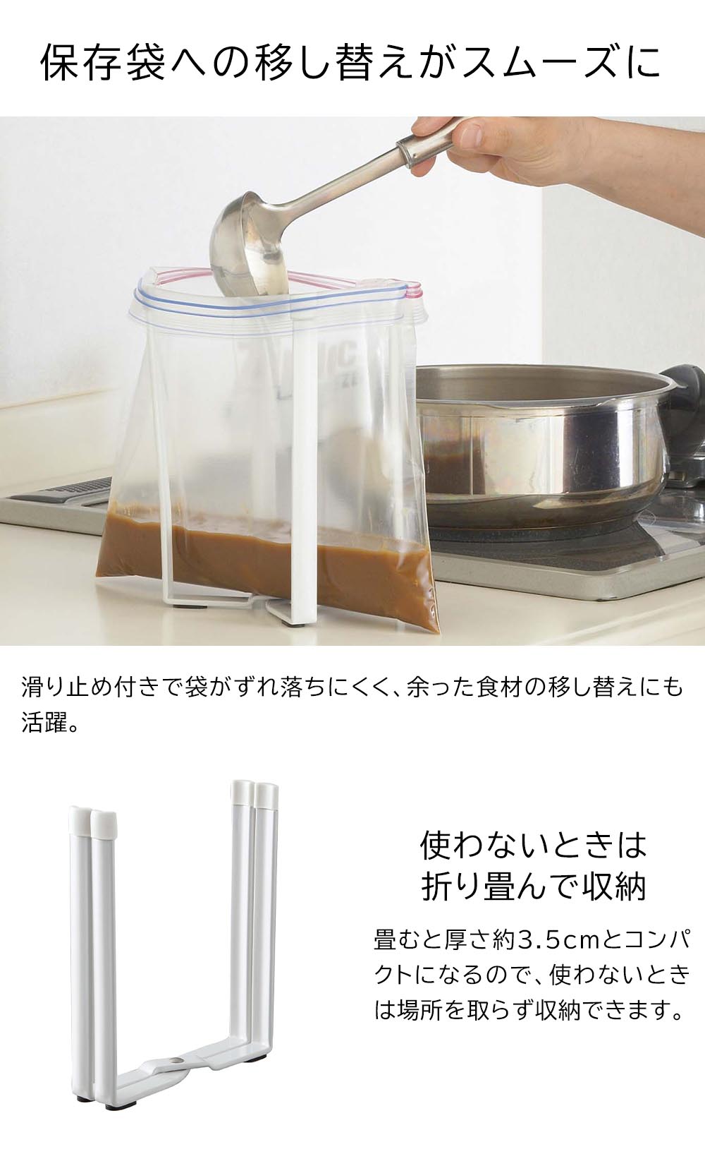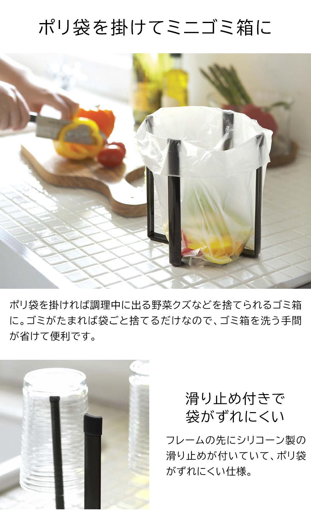 ポリ袋がゴミ箱に! フレームにポリ袋を掛けるだけで調理中にでる野菜クズなどをパッと捨てられるゴミ箱に。ゴミが溜まったら袋ごと捨てるだけなので、ゴミ箱を洗う手間が省けて楽です。グラスや牛乳パック、ペットボトルを干しておくのにも便利。保存袋を掛ければ、鍋から移し替える作業もスムーズにできます。また使わないときは折り畳んでスリムに収納できるのでキッチンで邪魔になりません。 ![]() ![]() ![]() ![]() ![]() ![]() ![]() ![]() |