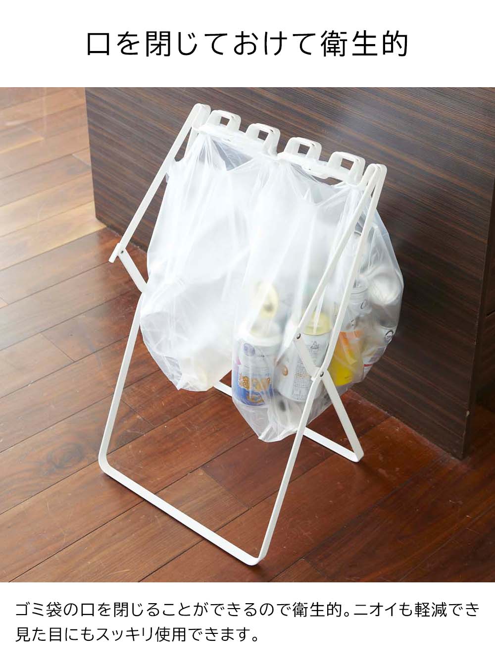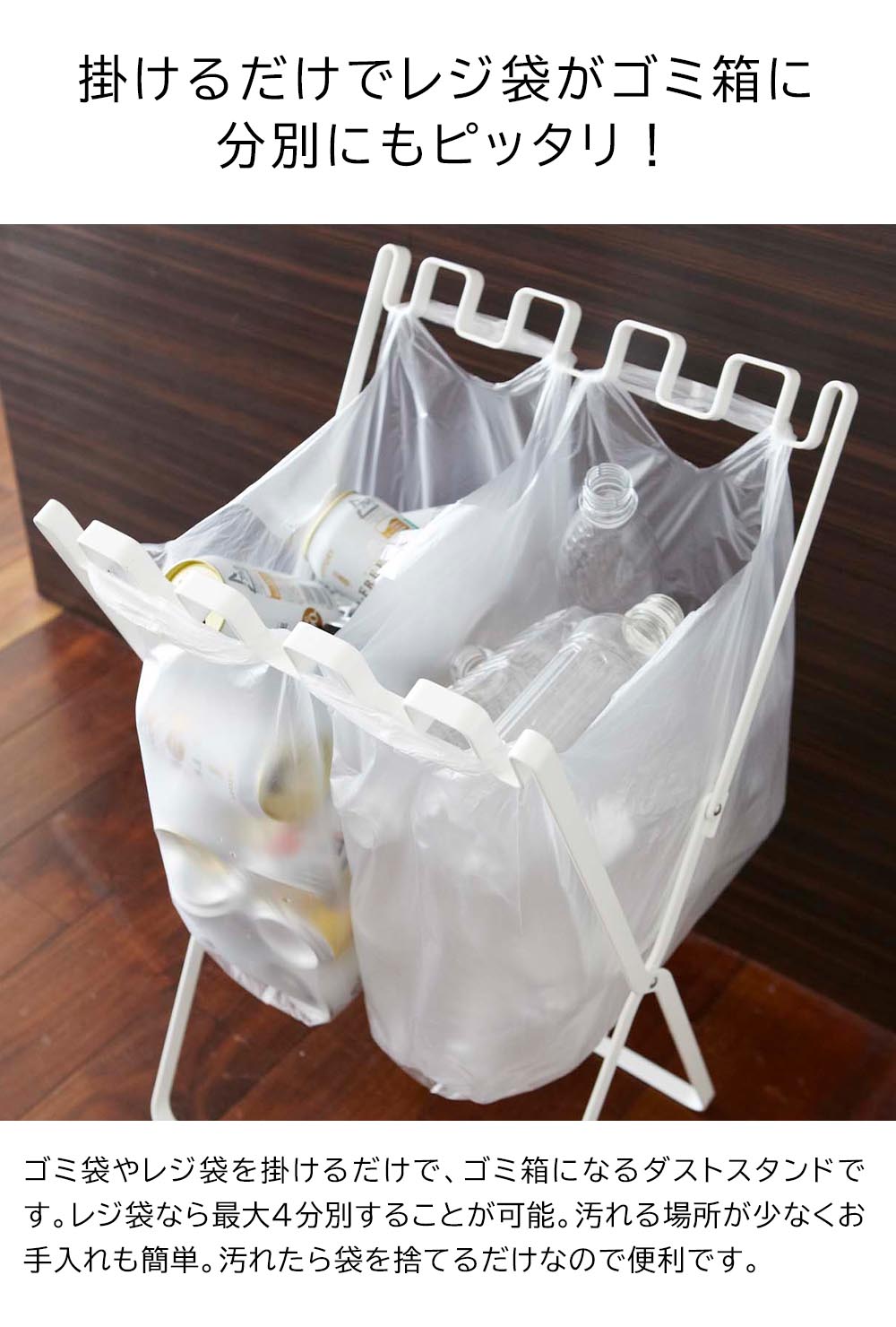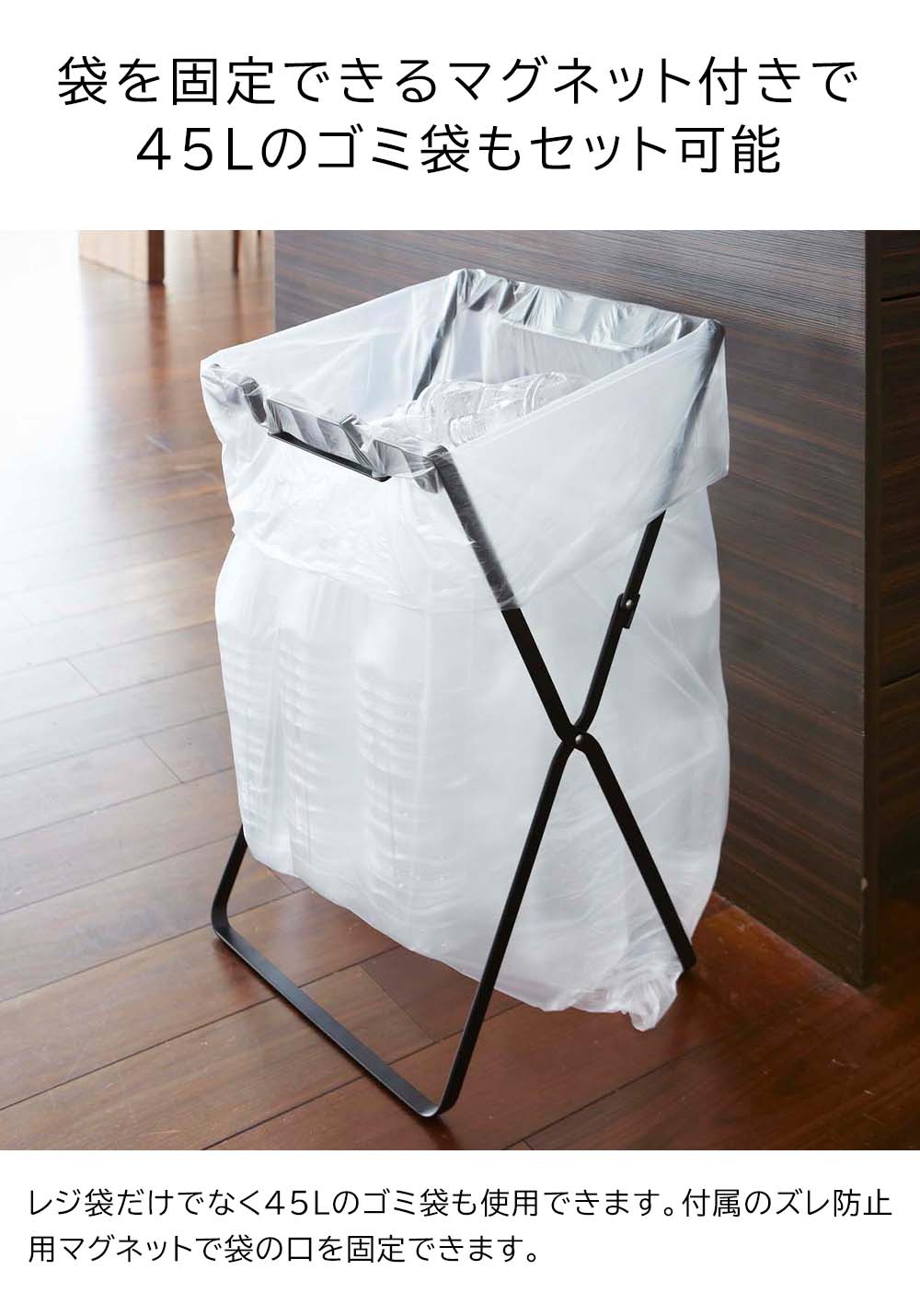 レジ袋を掛けるだけで、ゴミ箱になるダストスタンドです。レジ袋なら1~4枚掛けられるから、分別にピッタリ。45Lのゴミ袋も付属のマグネットを使用してしっかり固定できるので大きなゴミも収納できます。また、ゴミ袋の口を閉じておくことができるので、ニオイが軽減される上、中身が隠せて見た目もスッキリ。折り畳めば奥行き約3.5cmとスリムになり、使わないときはちょっとした隙間に収納できます。