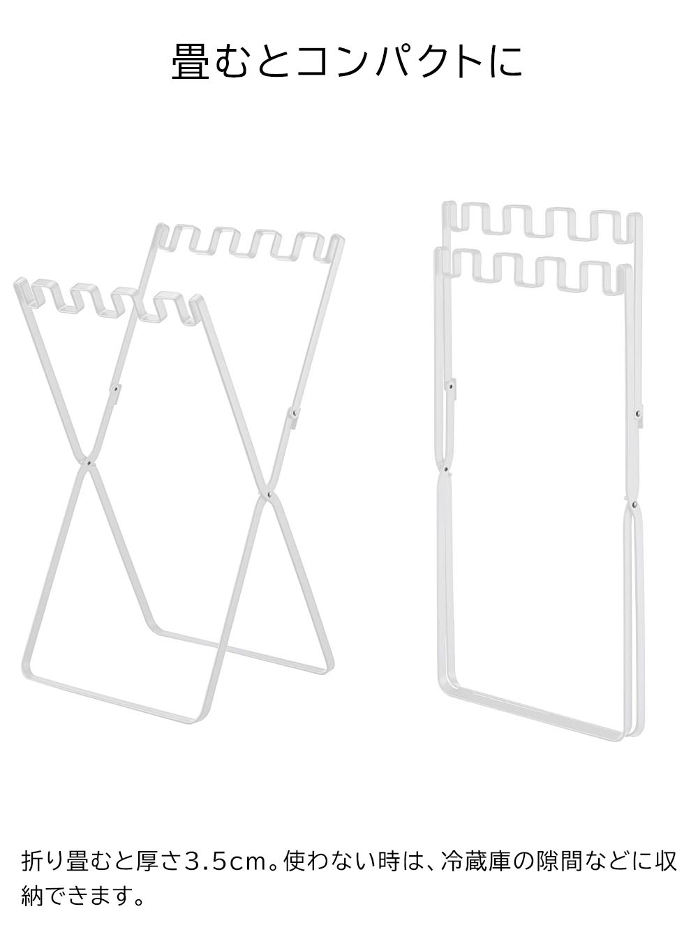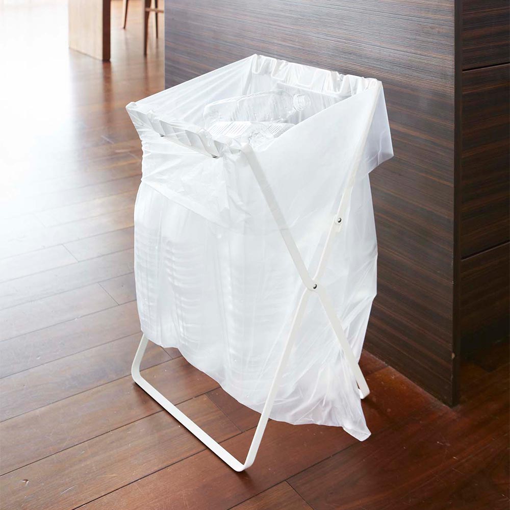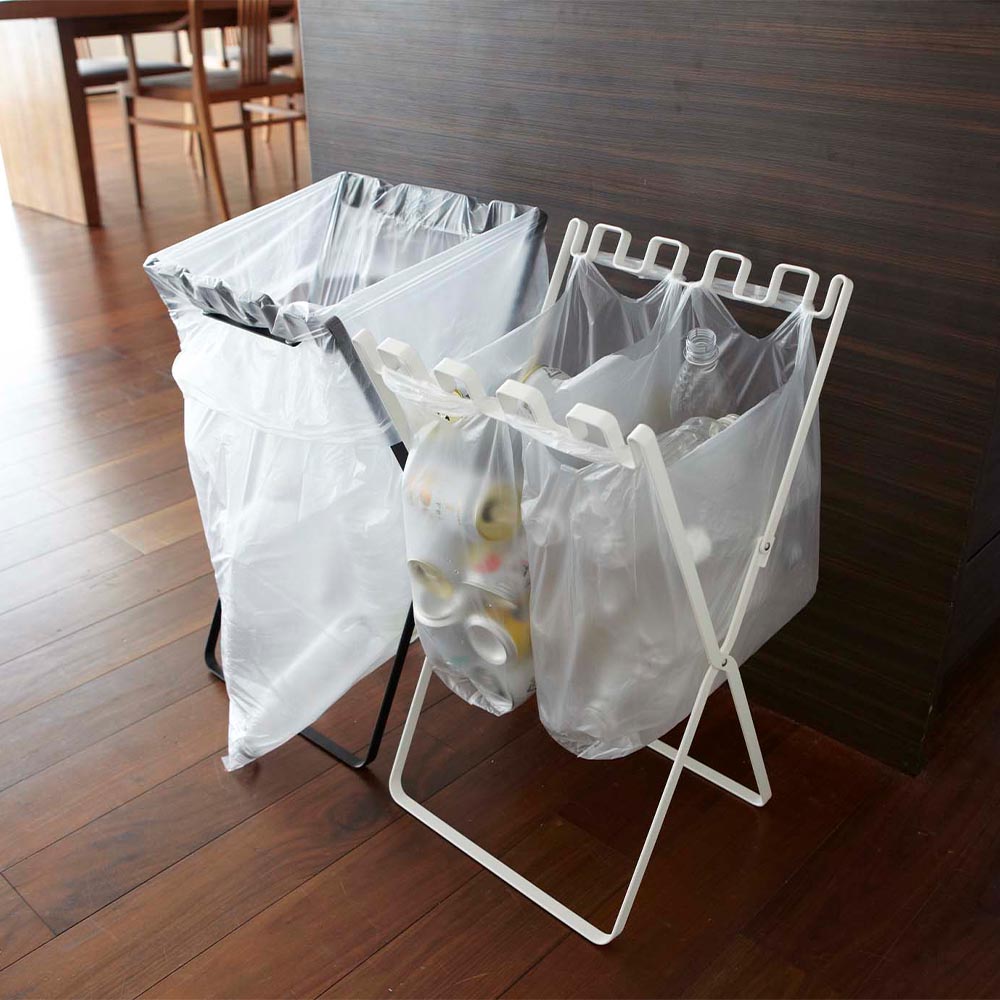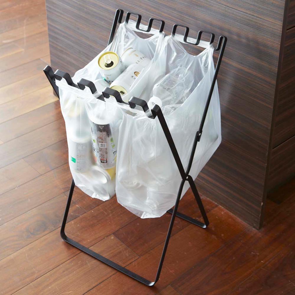 レジ袋を掛けるだけで、ゴミ箱になるダストスタンドです。レジ袋なら1~4枚掛けられるから、分別にピッタリ。45Lのゴミ袋も付属のマグネットを使用してしっかり固定できるので大きなゴミも収納できます。また、ゴミ袋の口を閉じておくことができるので、ニオイが軽減される上、中身が隠せて見た目もスッキリ。折り畳めば奥行き約3.5cmとスリムになり、使わないときはちょっとした隙間に収納できます。