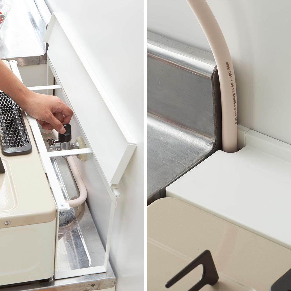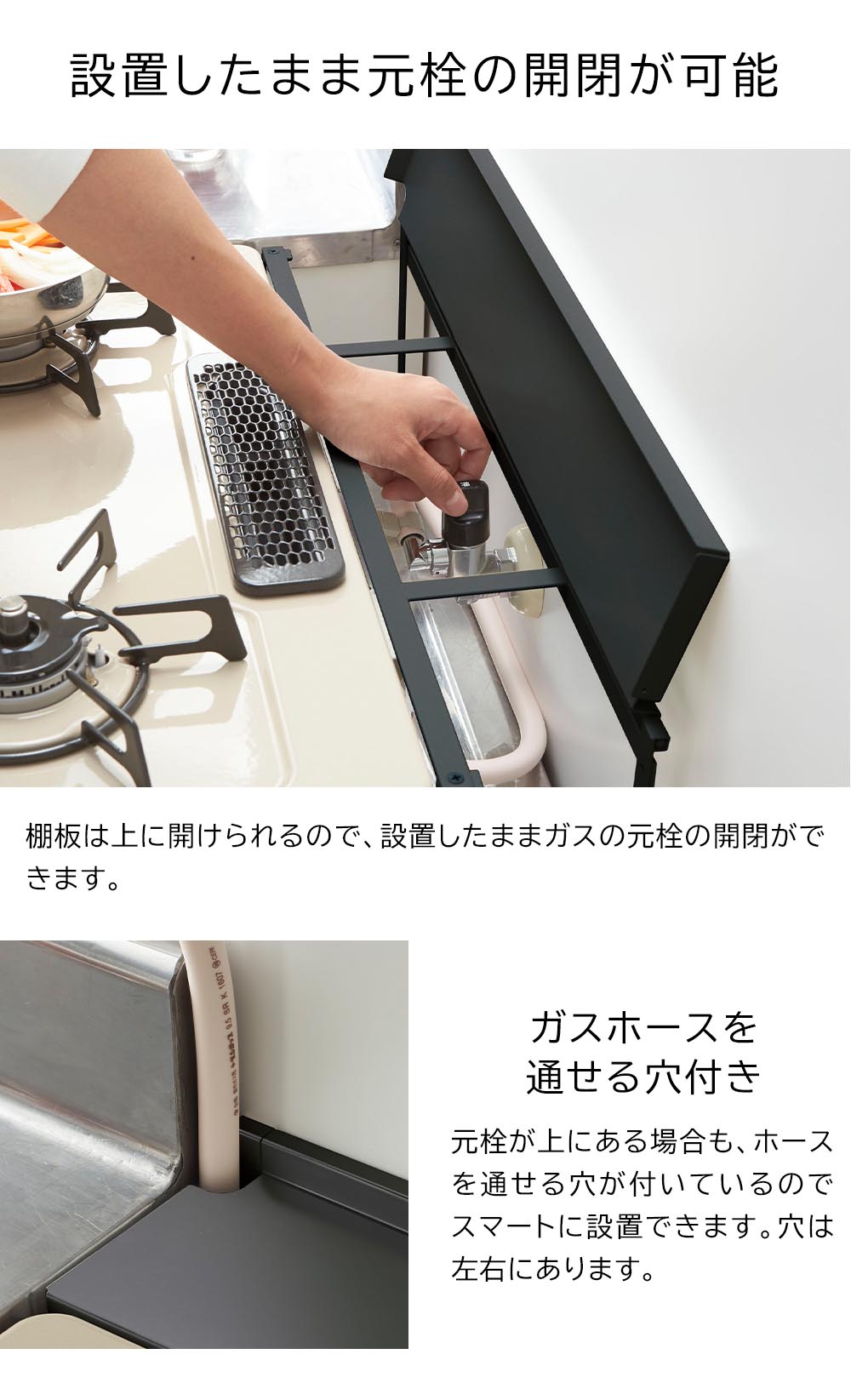 ガスコンロ奥の隙間に置いて 据え置きタイプのコンロ奥の隙間に置いて、ゴミや油汚れをガードするラックです。調理ツールやスパイスなどの収納スペースとしても使えて便利。棚板が開くので、設置したままガスの元栓を開閉することが可能です。ガスホースを通す穴がついているので、元栓が高い位置にあってもスッキリ設置できます。ビルトインコンロの周りで収納ラックとしてもお使いいただけます。 ![]() ![]() ![]() ![]() ![]() ![]() ![]() ![]() ![]() ![]() |