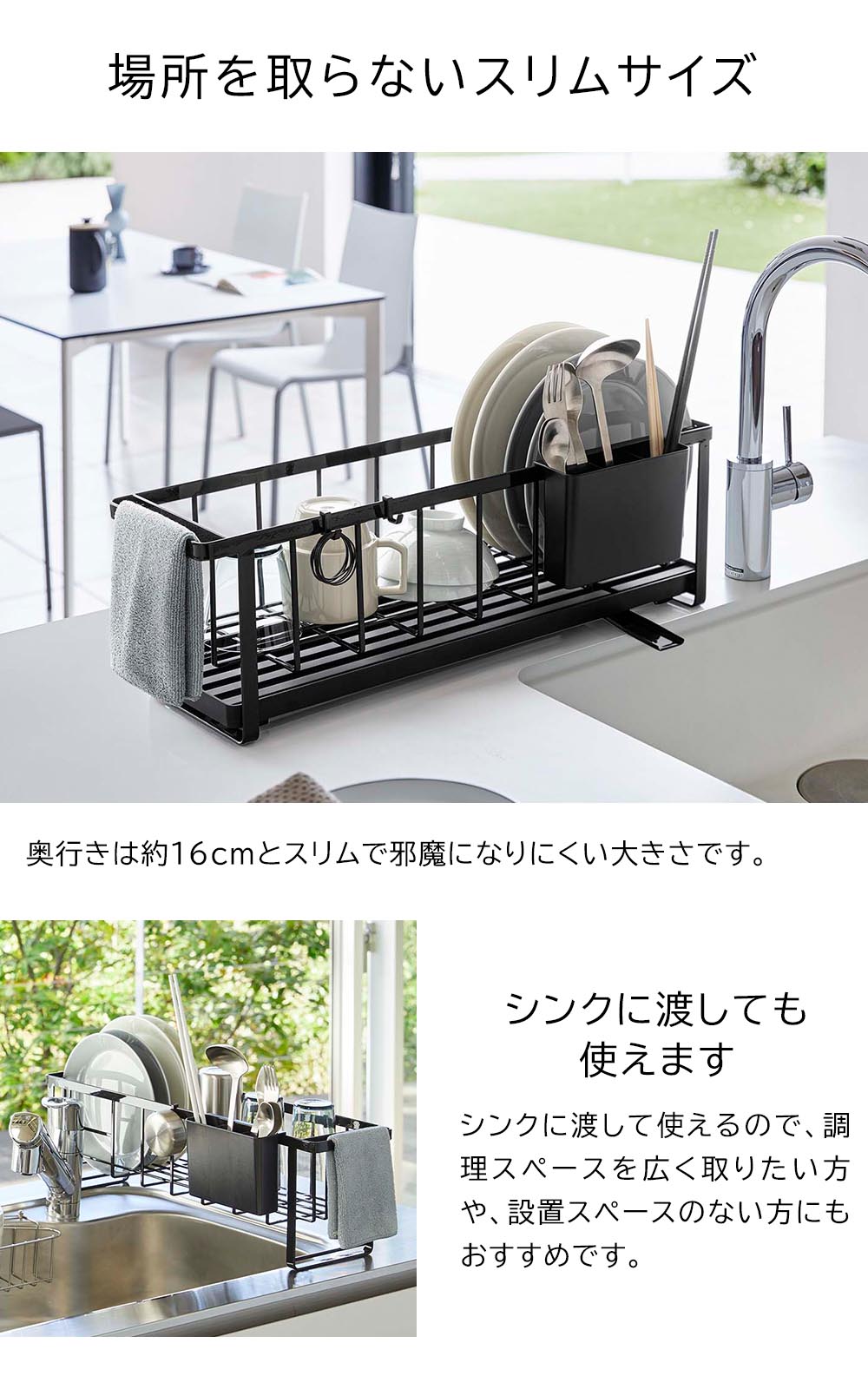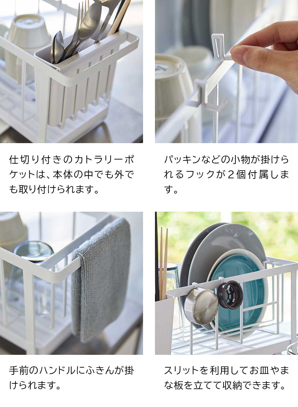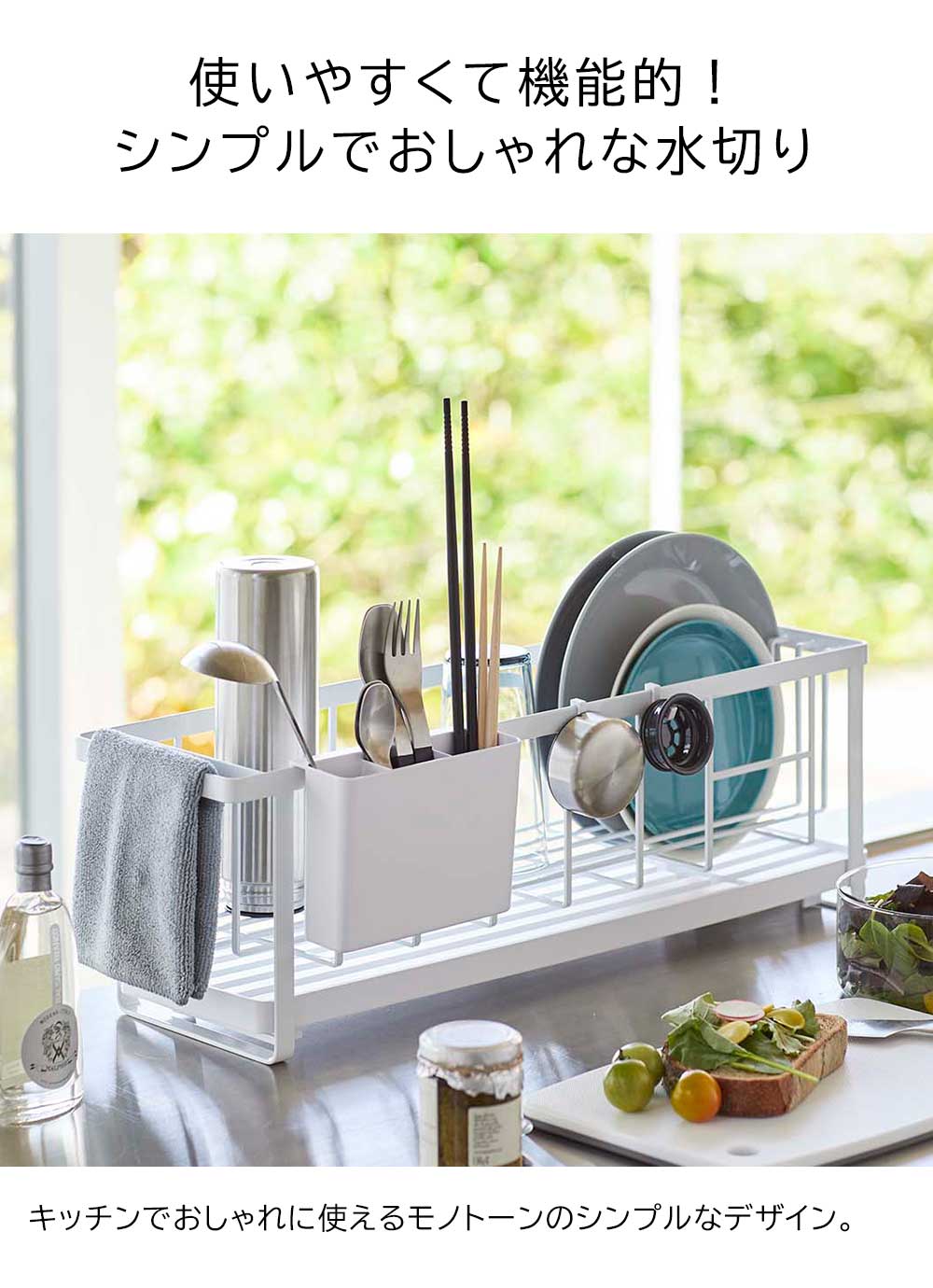 スッキリ使えるスリムサイズ キッチンで場所をとらずに置ける、奥行約16cmのスリムな水切りです。キッチンシンクに渡しても使えるので調理スペースを広く使いたい方にもおすすめ。トレーと本体は別々でも使用でき、収納量を増やすことができます。シンクに直接排水できる「水はけ」や、着脱できる「カトラリーポケット」「フック」など、使いやすい工夫があり機能的。モノトーンの落ち着いた佇まいがキッチンをおしゃれに演出してくれます。 ![]() ![]() ![]() ![]() ![]() ![]() ![]() ![]() ![]() ![]() ![]() |