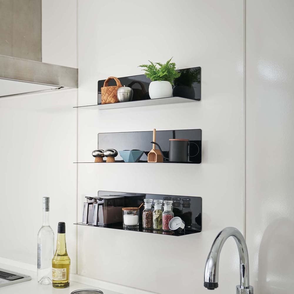 マグネットで簡単に壁に取り付けられるキッチンラックです。50cmとワイドサイズなので、調理でよく使う調味料などのキッチンアイテムをまとめて収納可能。自分の使いやすい位置に設置できるので、調理の際にサッと手に取ることができて便利です。棚は奥に向かって傾斜があるので、物が滑り落ちにくい形状。シンプルなデザインは色々なキッチンに馴染むので、飾り棚として観葉植物やインテリア小物などを置いてもおしゃれです。