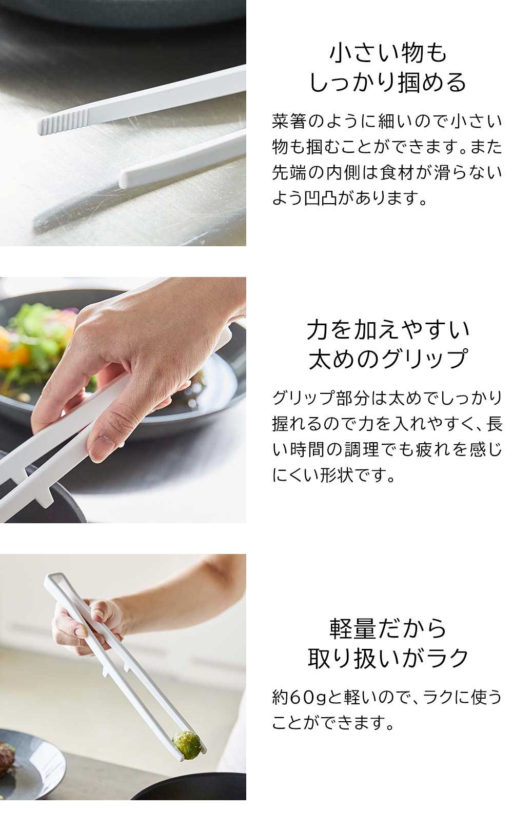 菜箸とトングのいいとこ取り 調理の時は菜箸、トングどちらを使われますか?菜箸は小さい物が掴めるけれど長いから力が入れにくい、トングは力が入れやすいけれど小さい物が掴めない。こちらはそんな一長一短がある2つを合体した「菜箸トング」です!力が入れやすく小さい物もしっかり掴めます。表面はシリコーンコーティングされていて弾力性があるためフライパンや鍋などに傷をつけません。太めのグリップは握りやすい上に軽量なので、長い時間でも疲れずにお使いいただけます。熱に強く、食洗機にも対応。毎日使いたくなる便利なアイテムです。 ![]() ![]() ![]() ![]() ![]() ![]() ![]() ![]() ![]() ![]() ![]() |