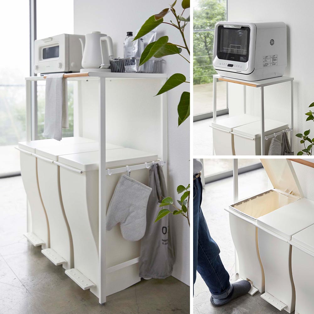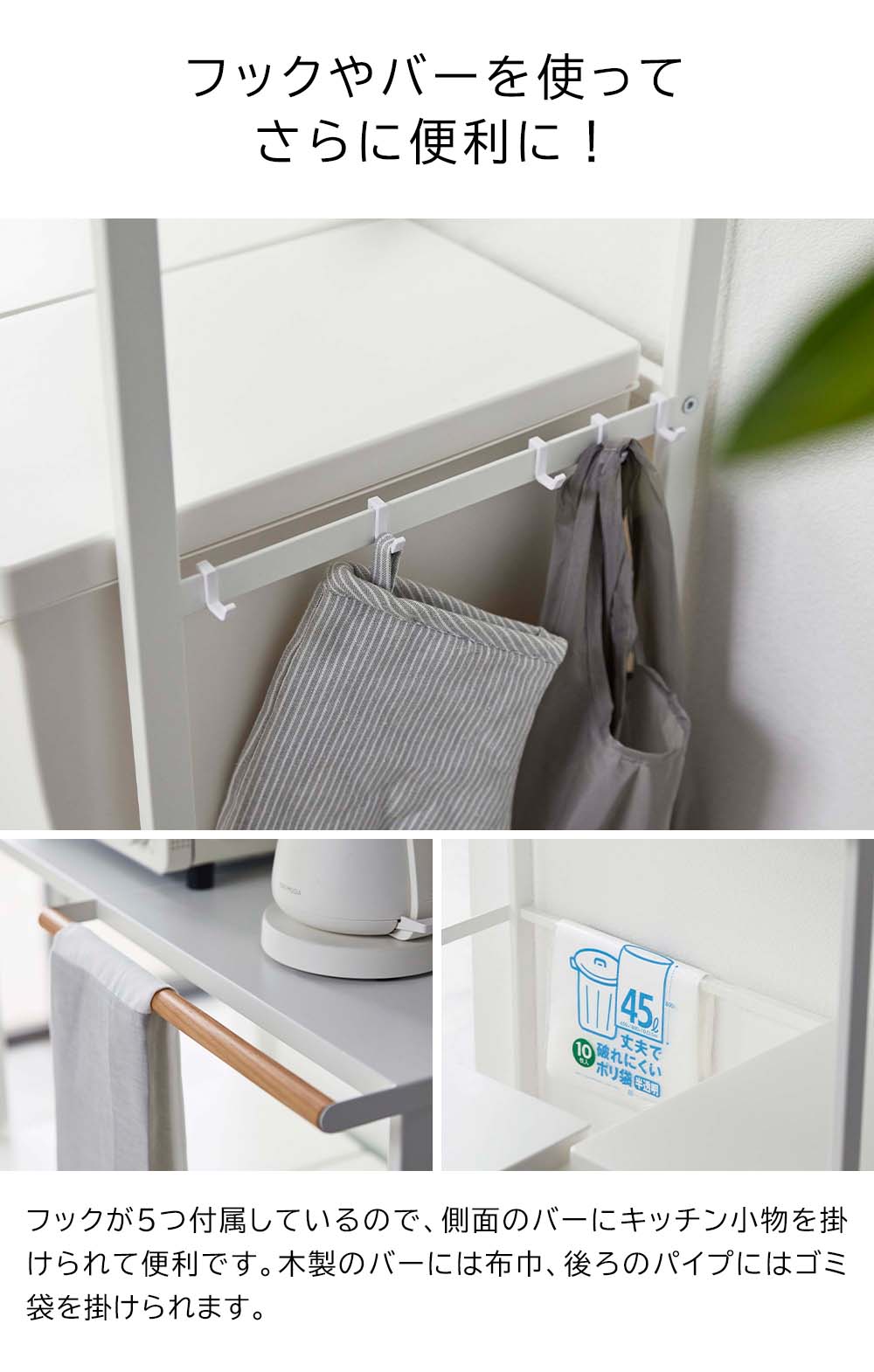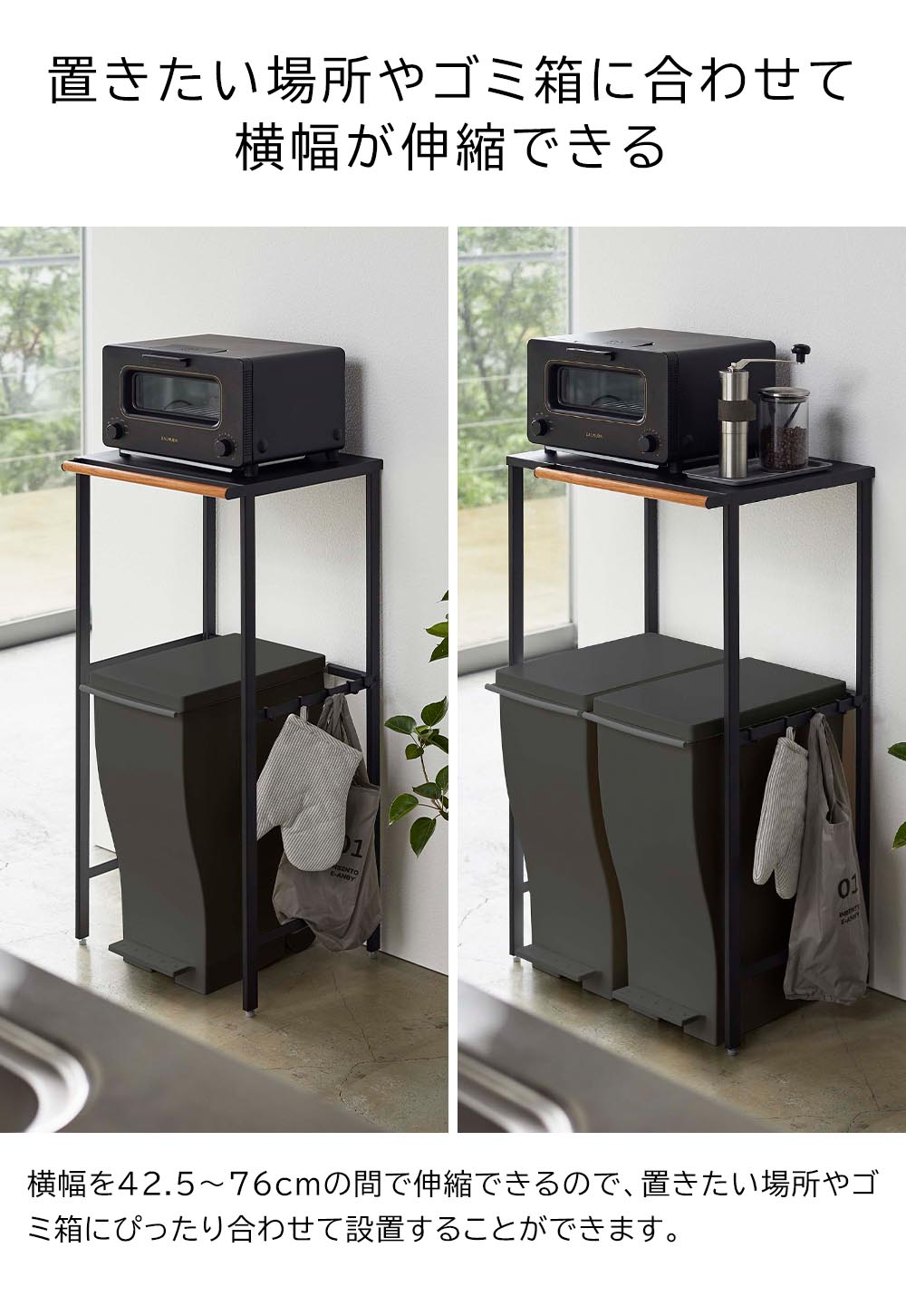 伸縮式でぴったりフィット! 使っていないゴミ箱上のデッドスペースをキッチン家電や小物を置ける便利な収納空間にします。幅約42.5~76cmの間で伸縮するので、置きたい場所やゴミ箱にぴったりと合わせて設置可能。蓋を開けた時に高さ約88cmまでのゴミ箱なら、天板に当てずに蓋を開けることができます。サイドのバーにミトンなどの小物が掛けられるフックは5個付属。前面のバーには布巾が掛けられます。木目が美しい天然木のバーがアクセントになった、シンプルでスタイリッシュなデザインです。 ![]() ![]() ![]() ![]() ![]() ![]() ![]() ![]() ![]() ![]() |