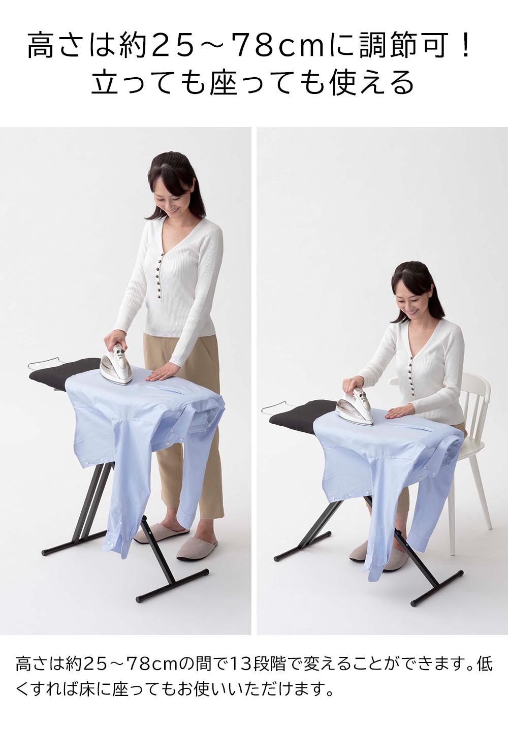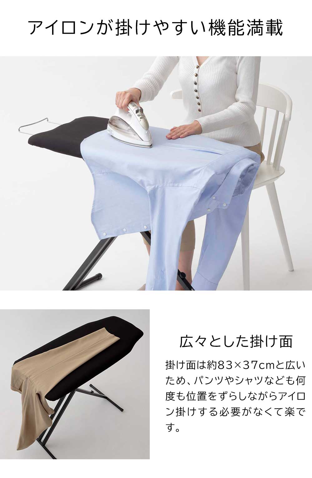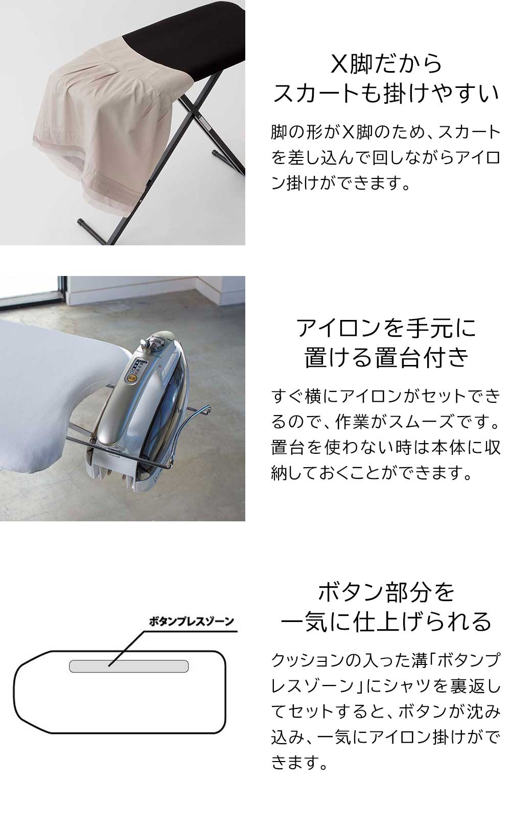 アイロンが掛けやすい アイロン掛けをスムーズにしてくれる機能がたくさんあるアイロン台です。作業がしやすい広い掛け面ながら、持ち運びやすい軽さが魅力。脚に工夫がありスカートは差し込んで回しながらアイロン掛けができます。また、シャツのボタン部分を一気に仕上げられるボタンプレスゾーンもとっても優秀!高さ調節ができるので、立っても座ってもお使いいただけます。使わない時はスリムに畳んで収納しておけ、邪魔にならない点も大変便利です。 ![]() ![]() ![]() ![]() ![]() ![]() ![]() ![]() ![]() ![]() ![]() |