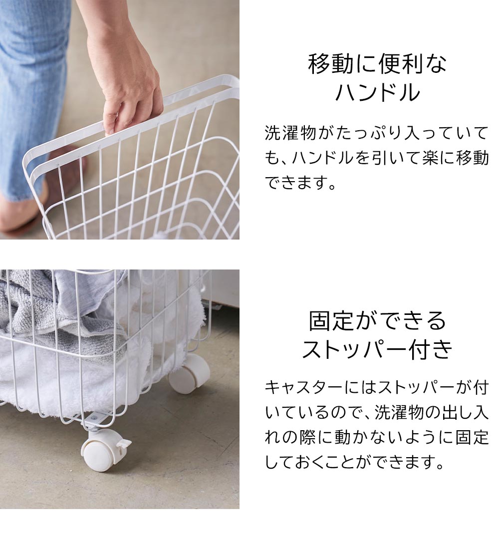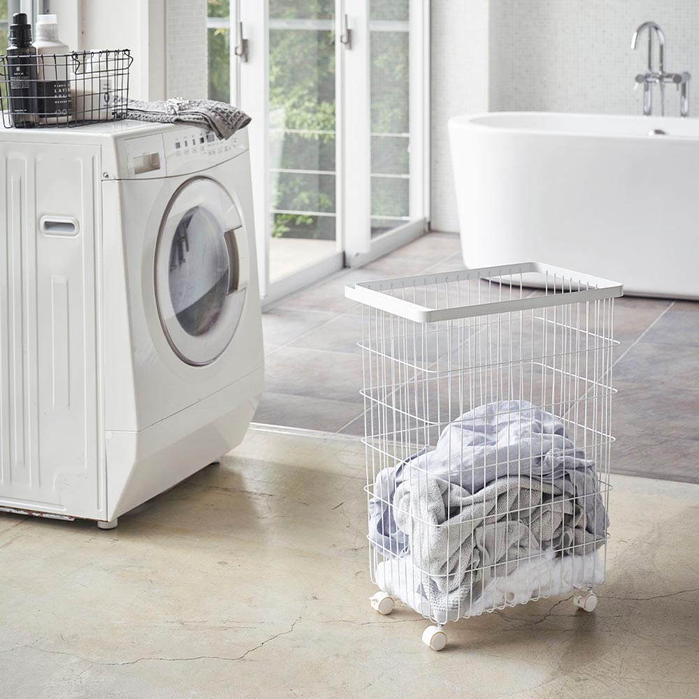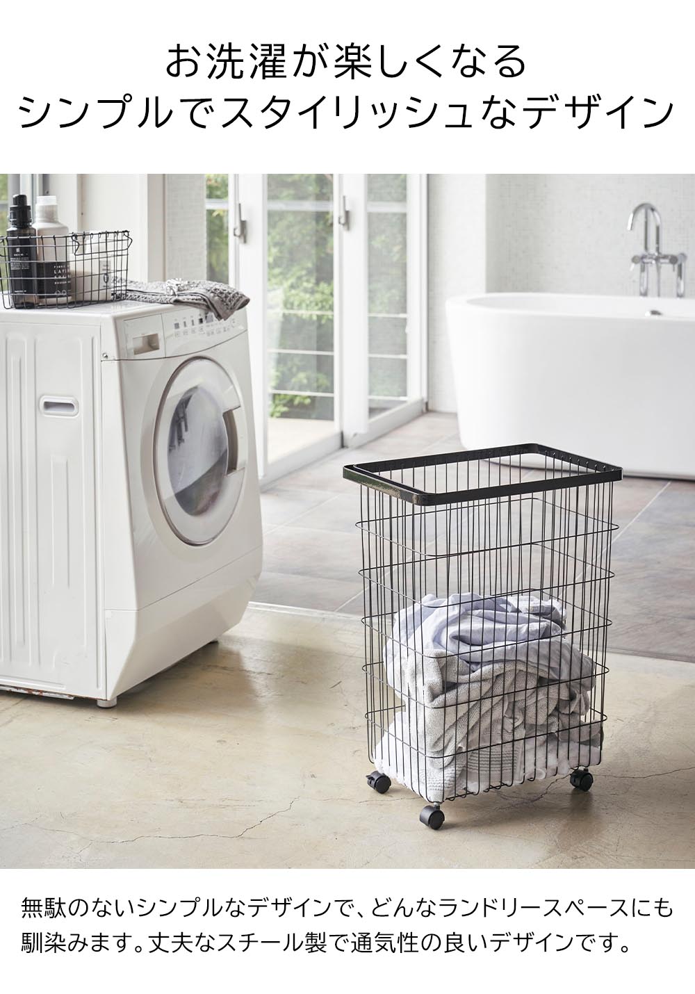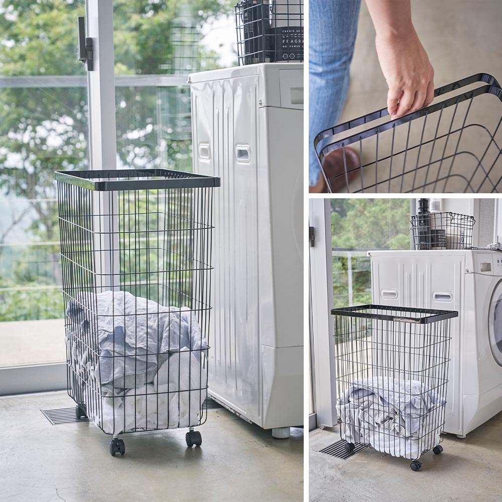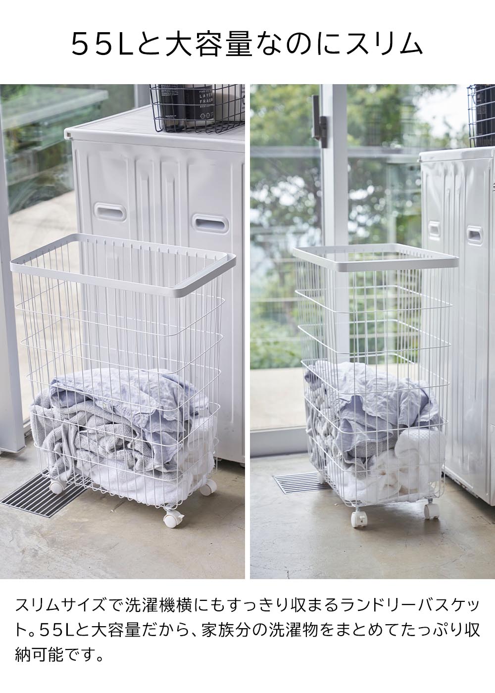 55Lと大容量サイズなのにスリムだから、洗濯機横にもスッキリと収まり、たくさんの洗濯物が収納できます。ハンドルとキャスターが付いていて移動が楽。丈夫なスチール製で通気性の良いデザインです。シンプルでスタイリッシュなデザインは様々なランドリースペースに馴染みます。