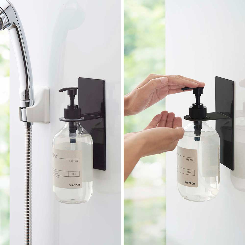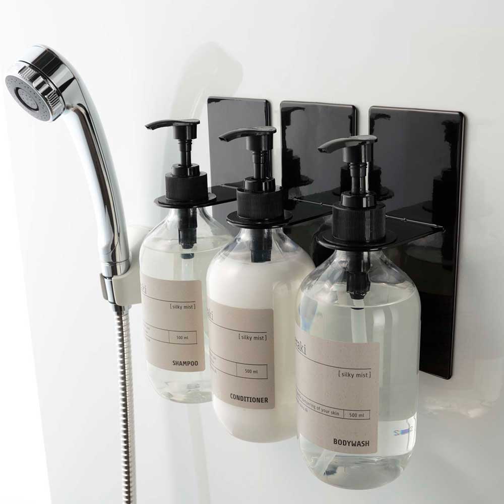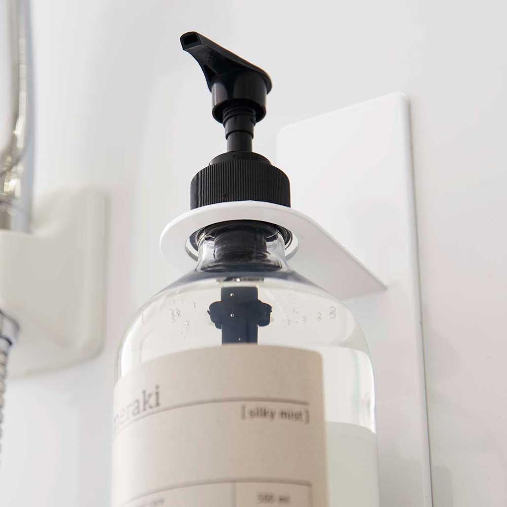 壁面にディスペンサーを浮かせて収納できる便利なホルダーです。マグネットで好みの位置に簡単に取り付け可能。収納の不足しがちなバスルームに手軽に収納場所が増やせます。浮かせているからボトルの底がぬめらず衛生的。しっかり取り付けられてそのままポンプを押すことができる点も便利です。