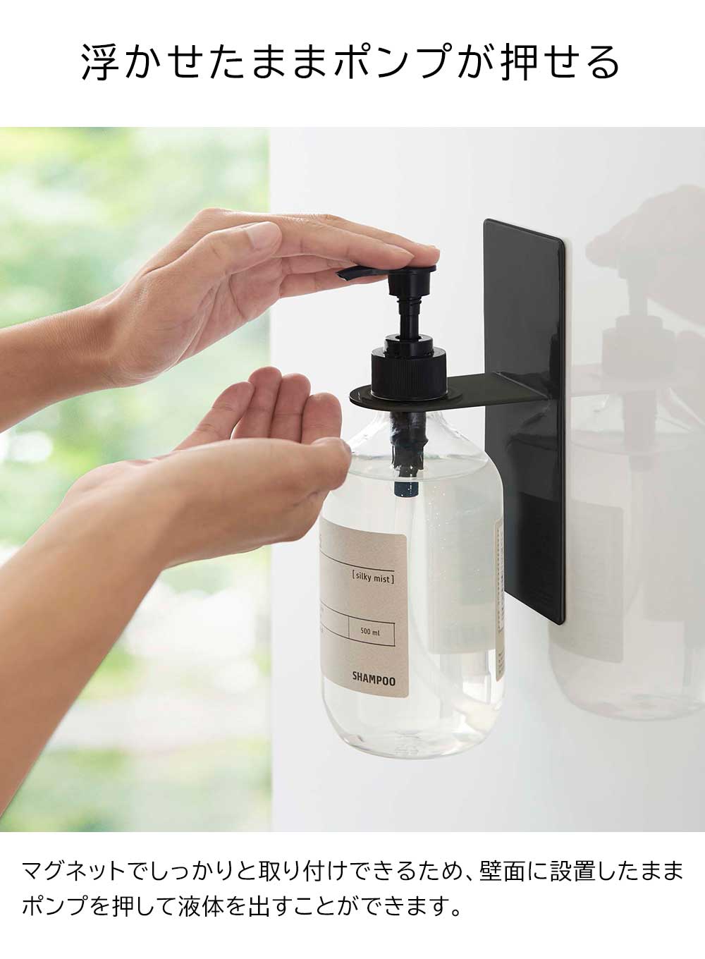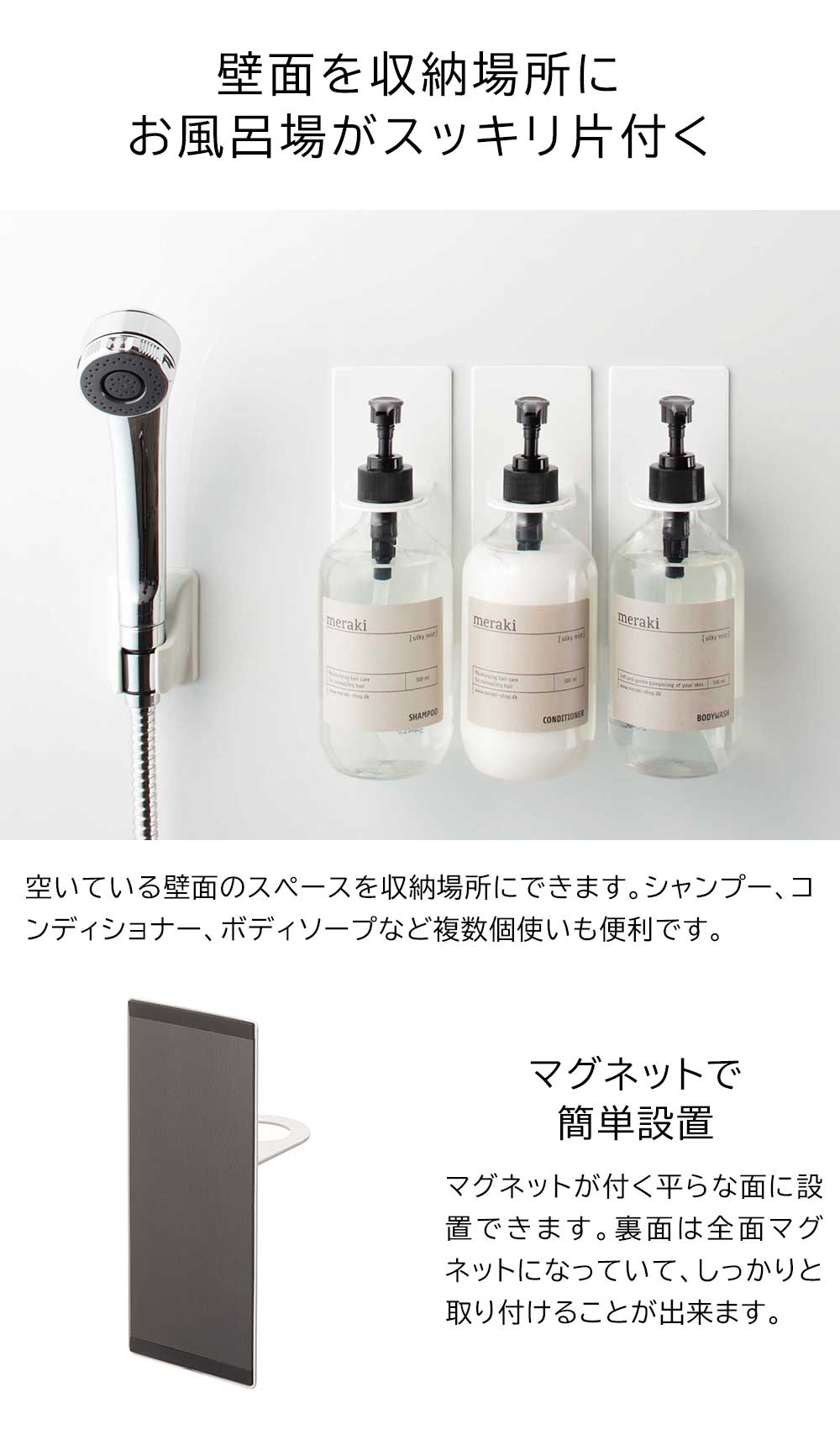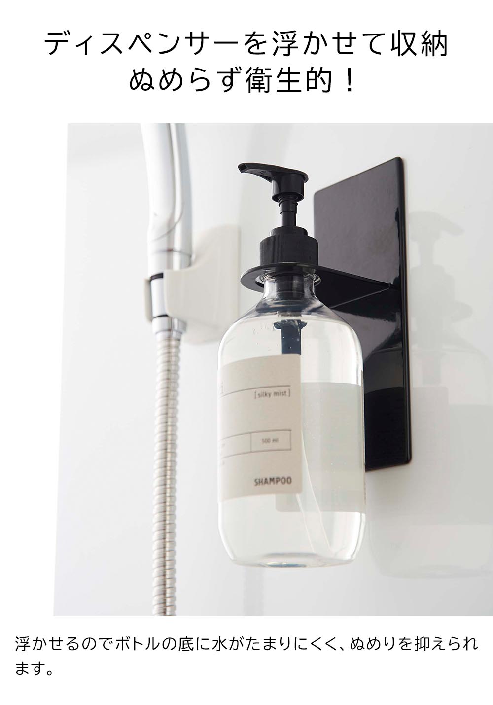 壁面にディスペンサーを浮かせて収納できる便利なホルダーです。マグネットで好みの位置に簡単に取り付け可能。収納の不足しがちなバスルームに手軽に収納場所が増やせます。浮かせているからボトルの底がぬめらず衛生的。しっかり取り付けられてそのままポンプを押すことができる点も便利です。