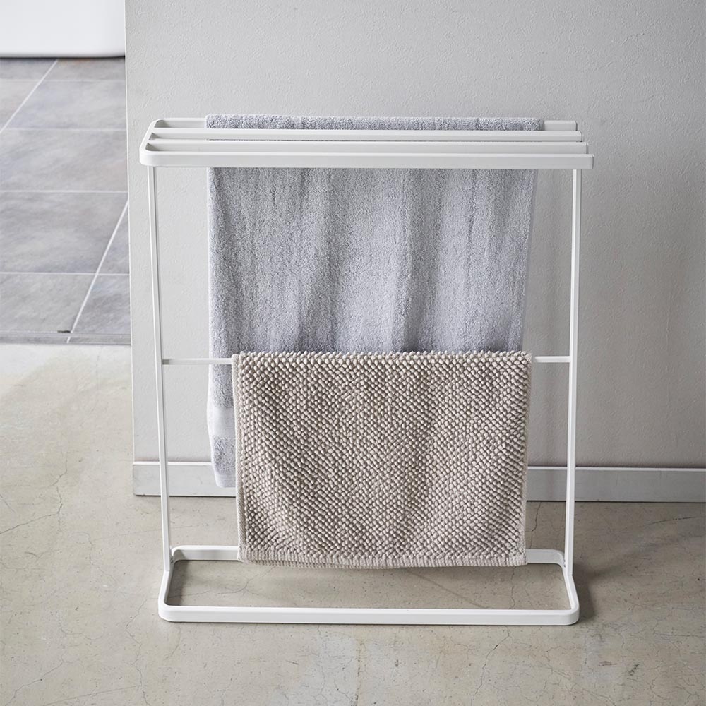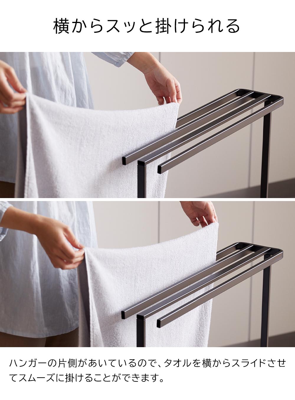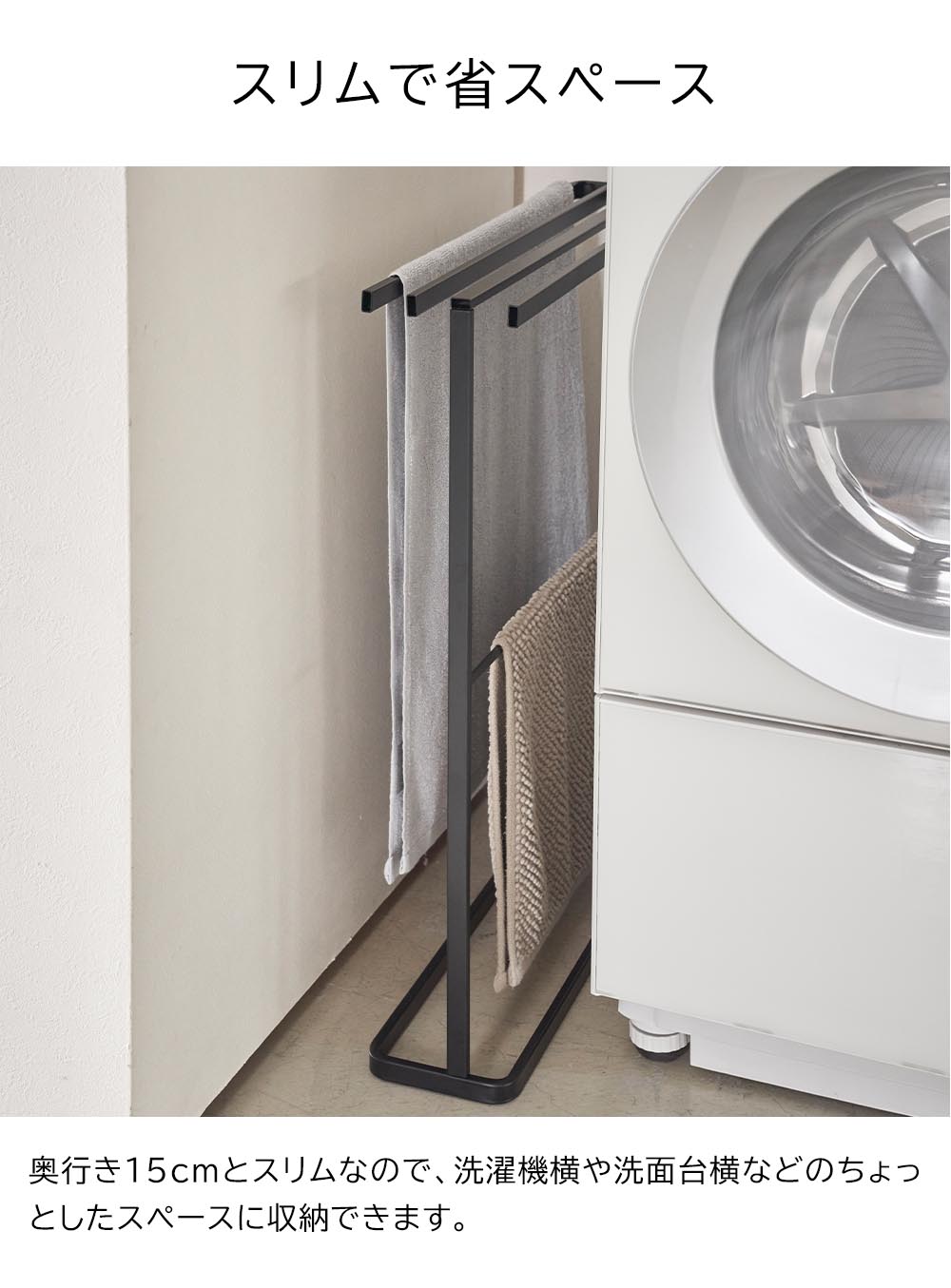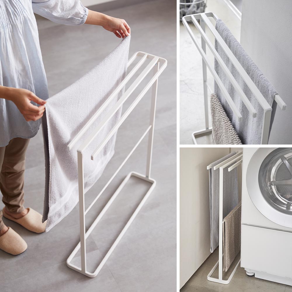 バーの側面が開いていてタオルを横からスッと掛けられるのでとっても楽です。バスタオル4枚とバスマット1枚を収納できます。洗濯機横の隙間などにも収まるスリムな設計で、脱衣所や洗面所に省スペースに設置できます。