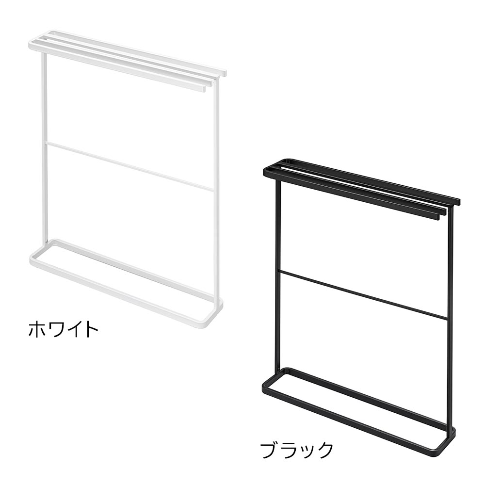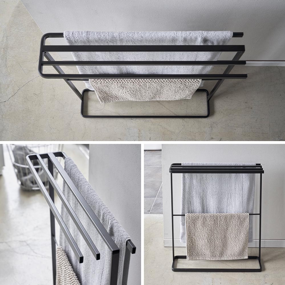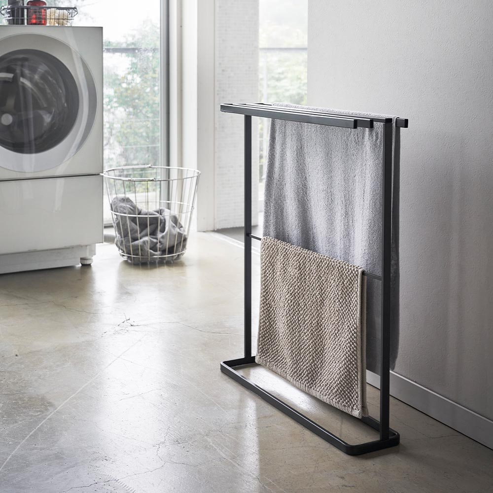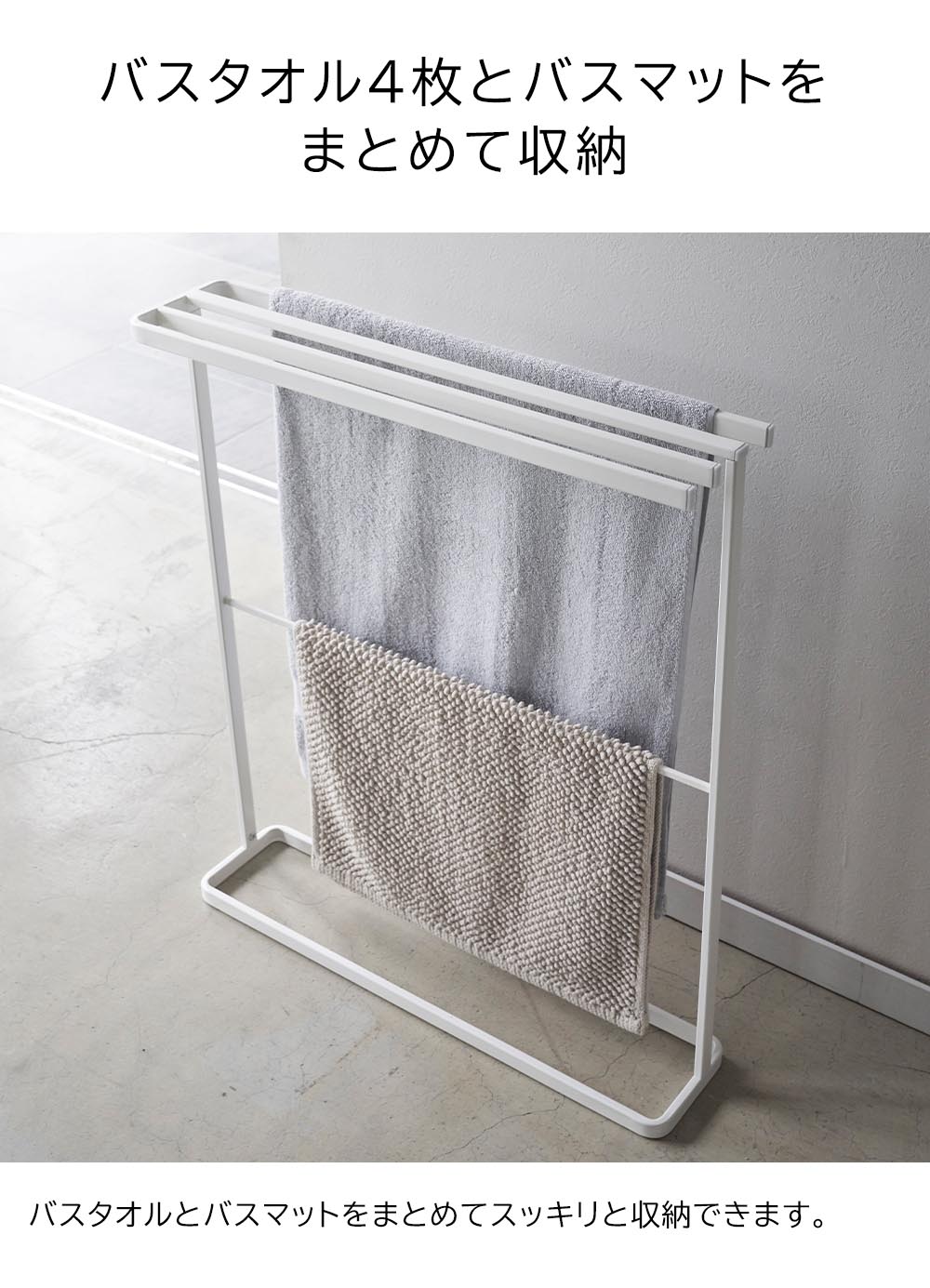 バーの側面が開いていてタオルを横からスッと掛けられるのでとっても楽です。バスタオル4枚とバスマット1枚を収納できます。洗濯機横の隙間などにも収まるスリムな設計で、脱衣所や洗面所に省スペースに設置できます。