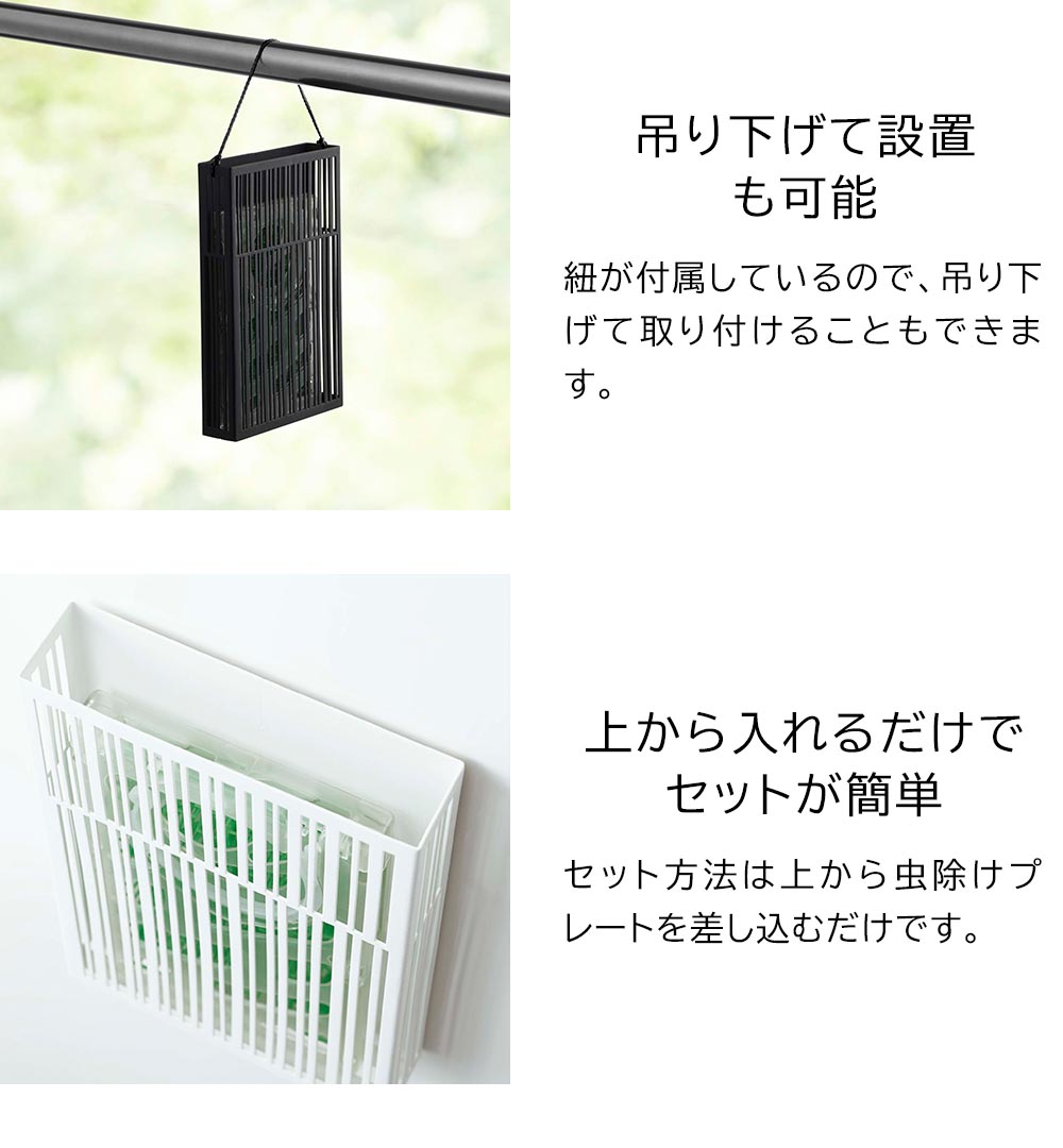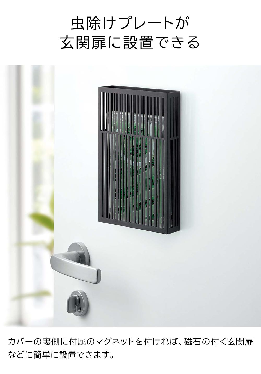 開け閉めのたびに虫が入ってくるのを避けるため玄関に設置したい虫除けプレートですが、吊り下げる場所や置く場所がなくてお困りではありませんか?こちらのカバーに入れれば、付属のマグネットで磁石の付く扉に簡単に取り付けできます。マグネットは上下2か所にあるので、扉の開閉時に揺れて邪魔になることもありません。紐も付属しているので吊り下げての設置にも対応しています。プレートの生活感を隠せる事もおすすめのポイントです。