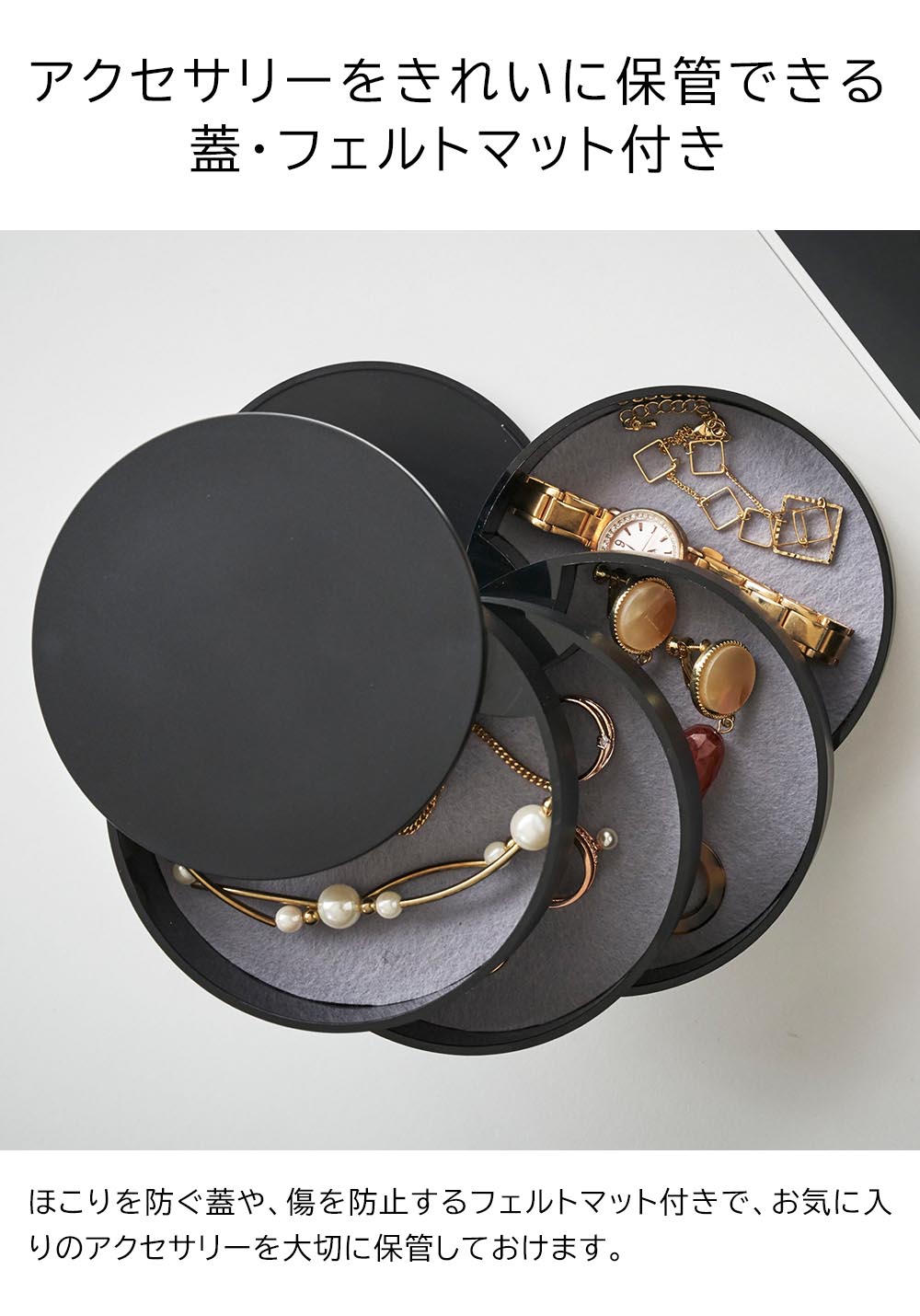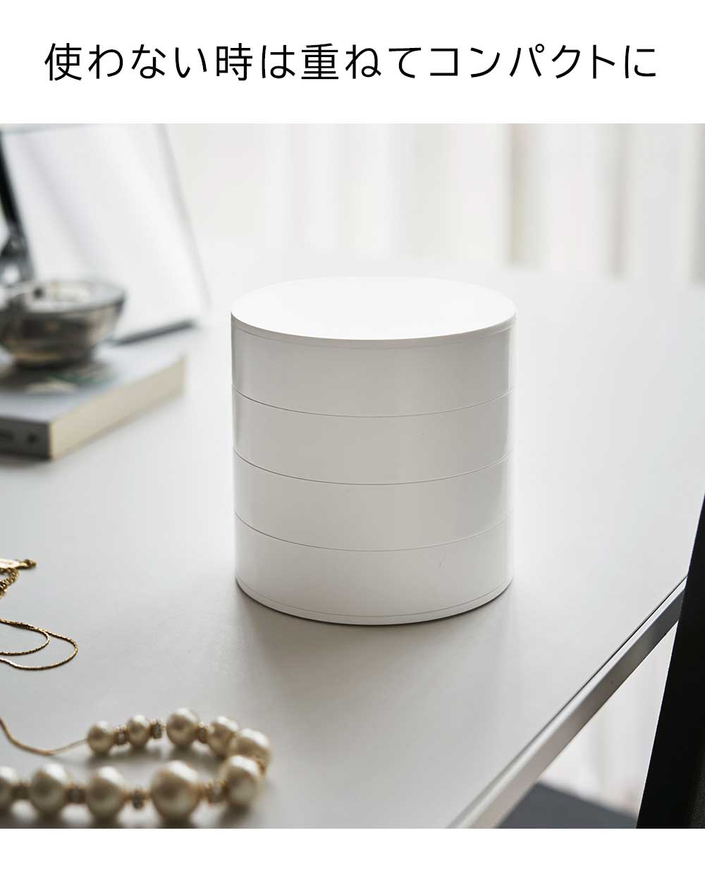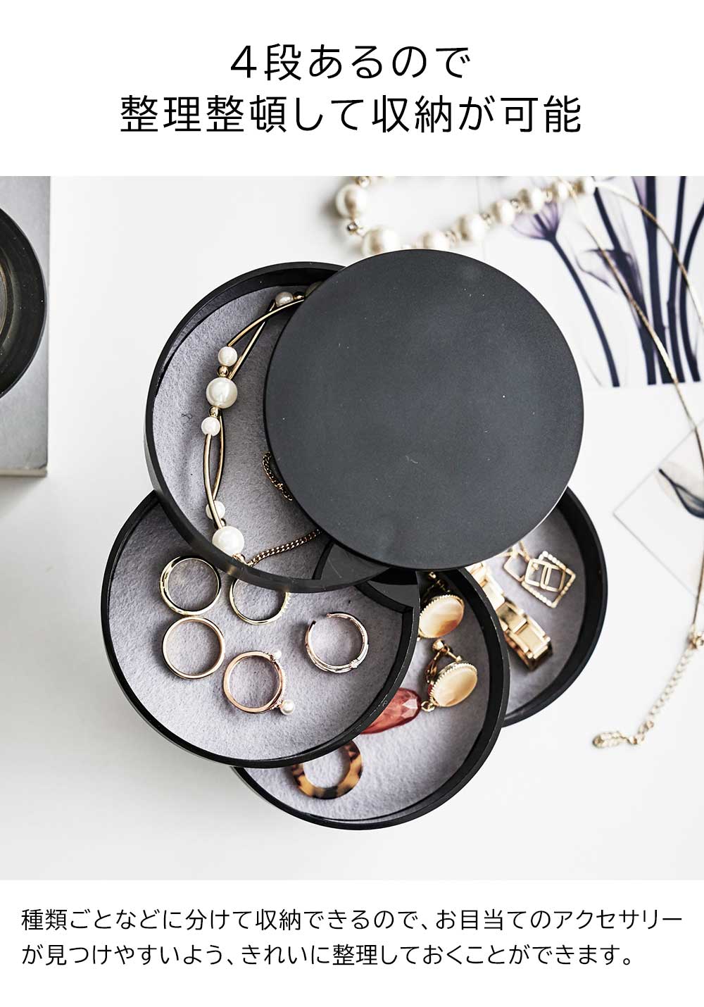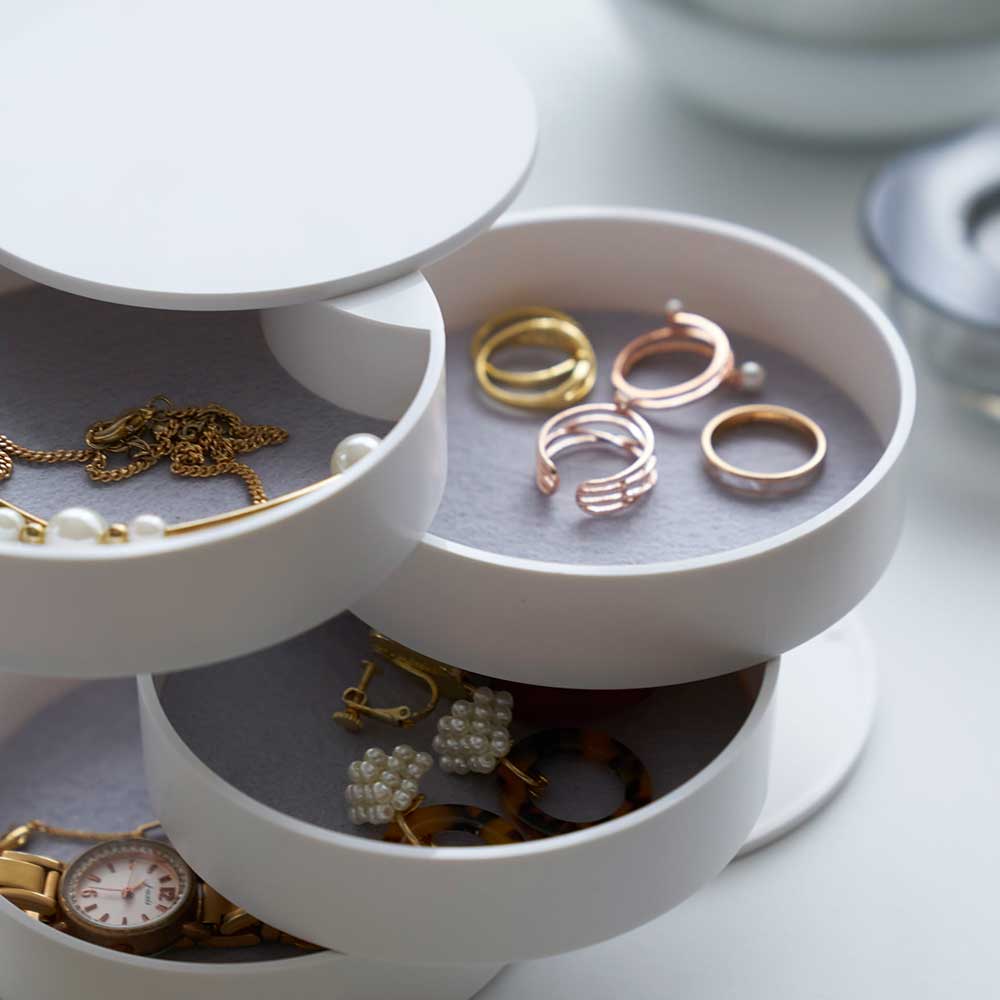 色々な種類や形状のあるアクセサリーをきれいに分類して収納できるアクセサリーケースです。4段に整理して入れられ、必要な段だけサッと開けるので、お目当てのアクセサリーが取り出しやすく、とっても便利。朝のお支度もスムーズになりますよ。使わない時はトレーを重ねてコンパクトに収納可能。インテリア性も高い美しいフォルムです。