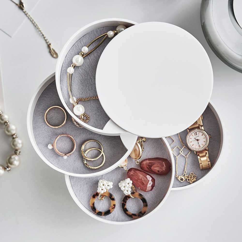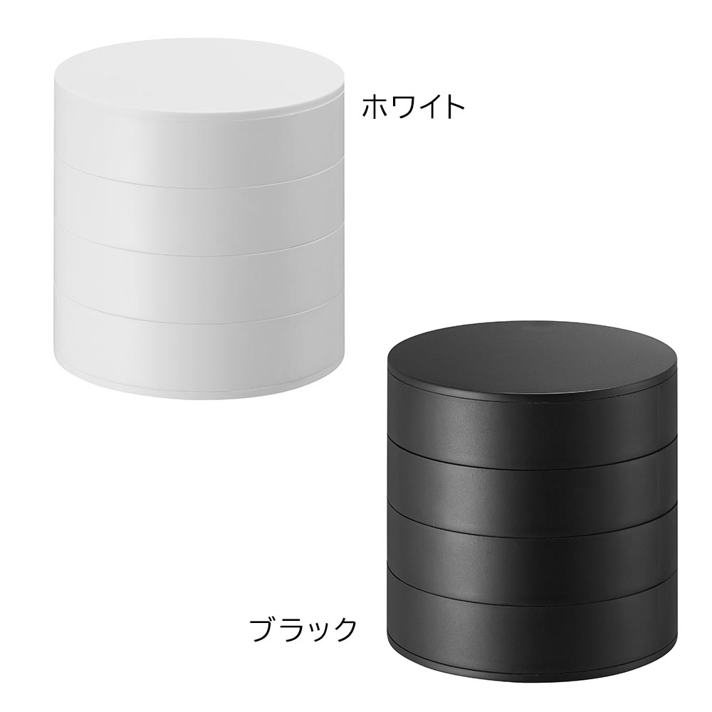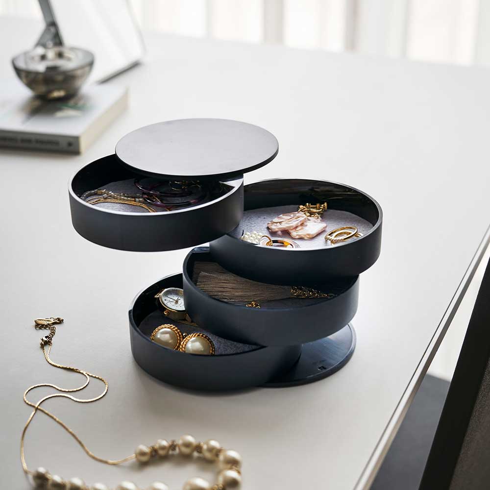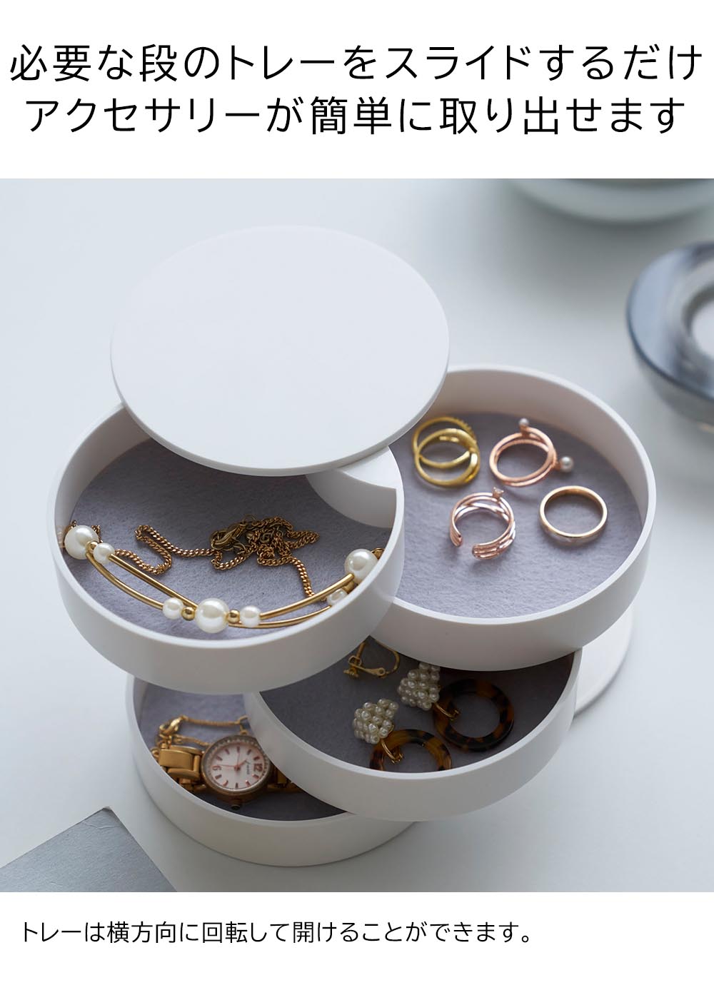 色々な種類や形状のあるアクセサリーをきれいに分類して収納できるアクセサリーケースです。4段に整理して入れられ、必要な段だけサッと開けるので、お目当てのアクセサリーが取り出しやすく、とっても便利。朝のお支度もスムーズになりますよ。使わない時はトレーを重ねてコンパクトに収納可能。インテリア性も高い美しいフォルムです。