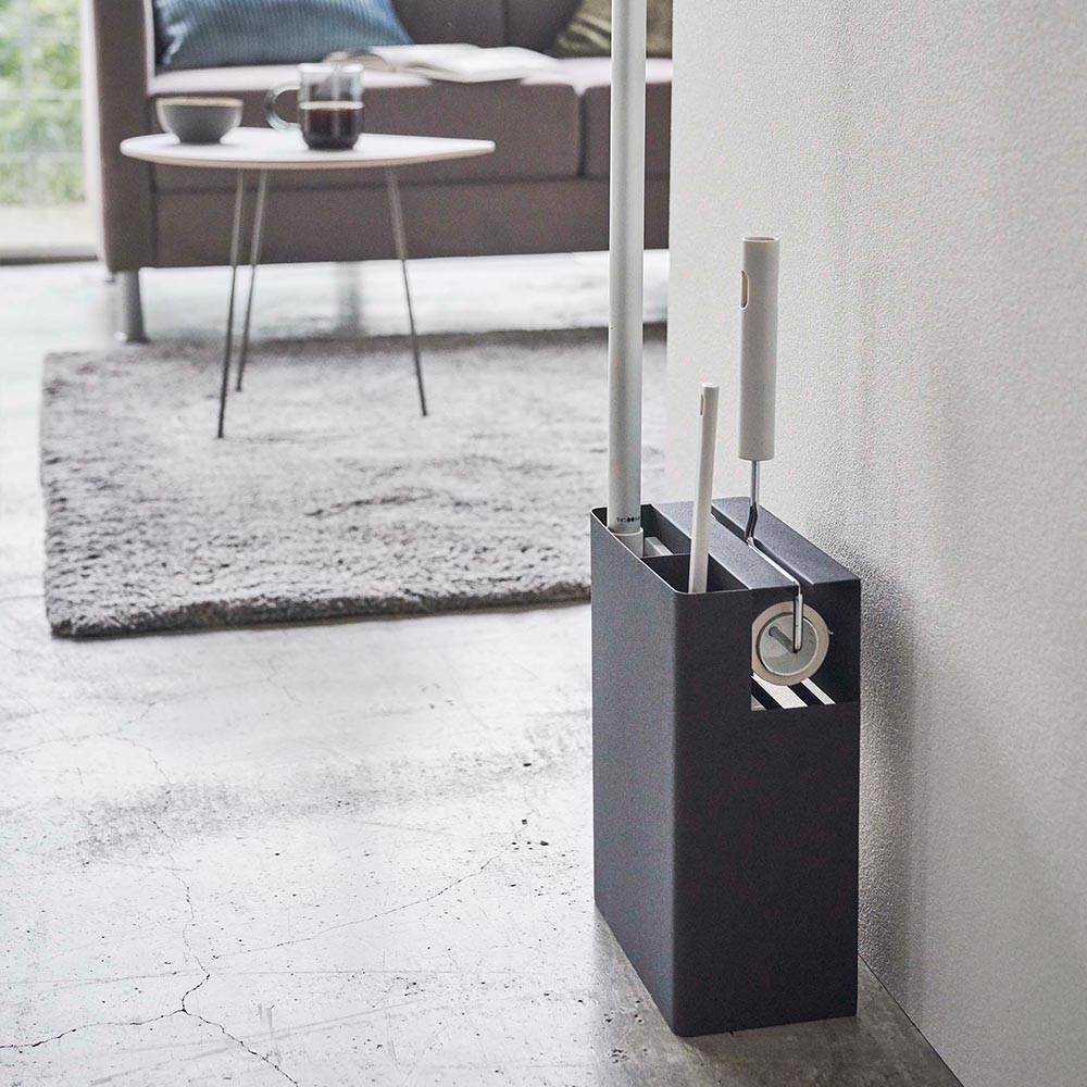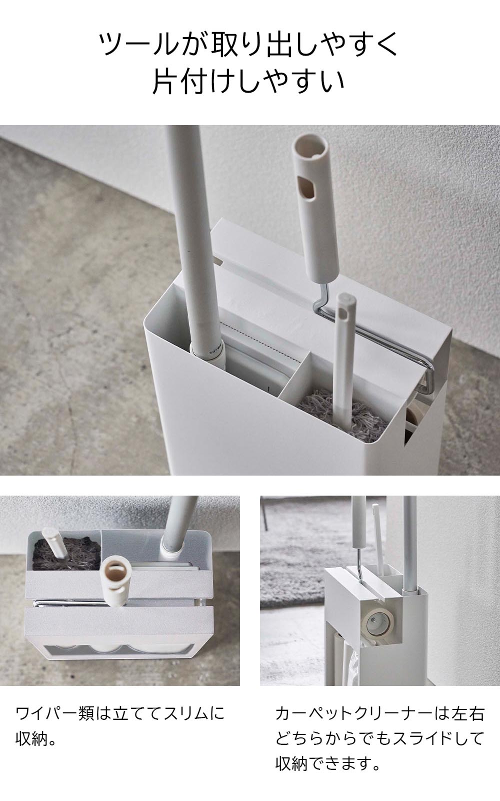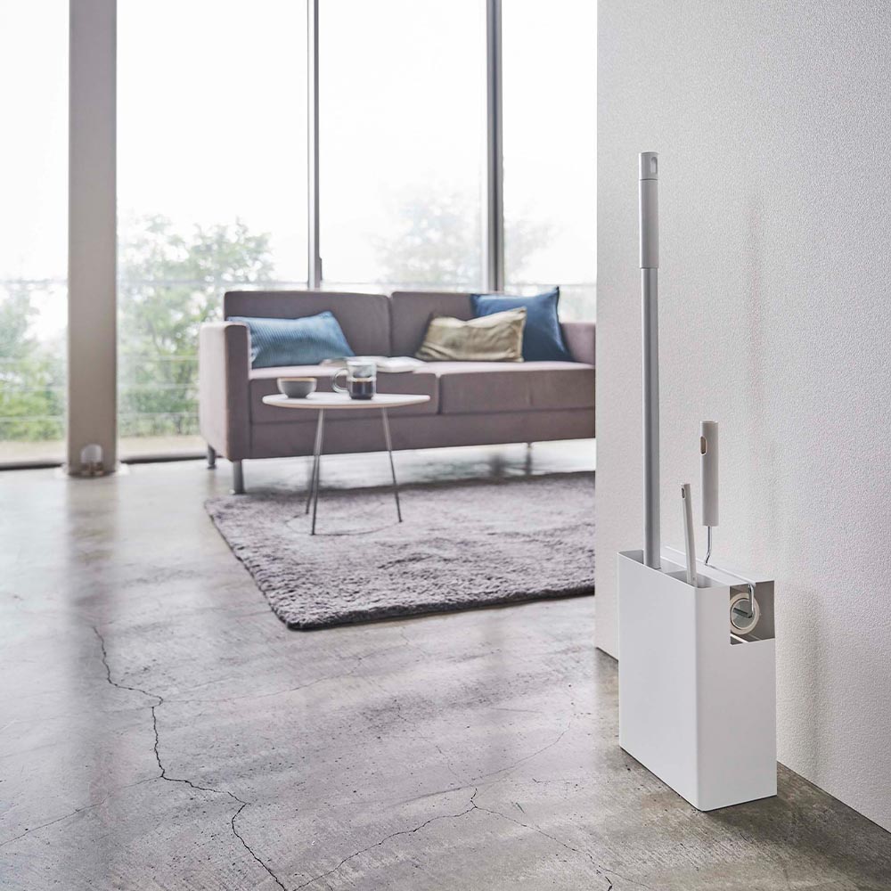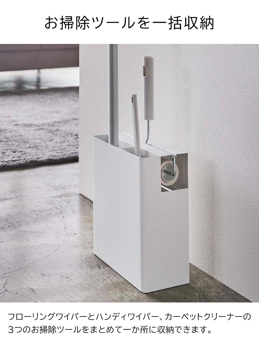 フローリングワイパー・ハンディーワイパー・カーペットクリーナーの3つのお掃除ツールをまとめて収納できるスタンドです。ヘッド部分が隠せるから見た目もきれい。生活空間にもさりげなく置けるシンプルでスタイリッシュなデザインのため、手に取りやすい場所に置いてサッとお掃除ができます。背面にはストックを収納できるスペースもあり便利です。