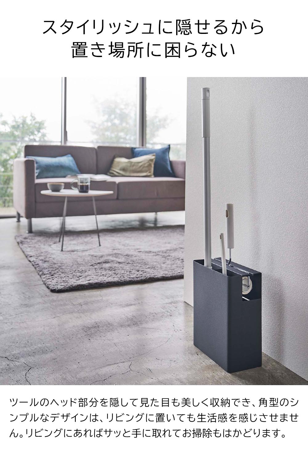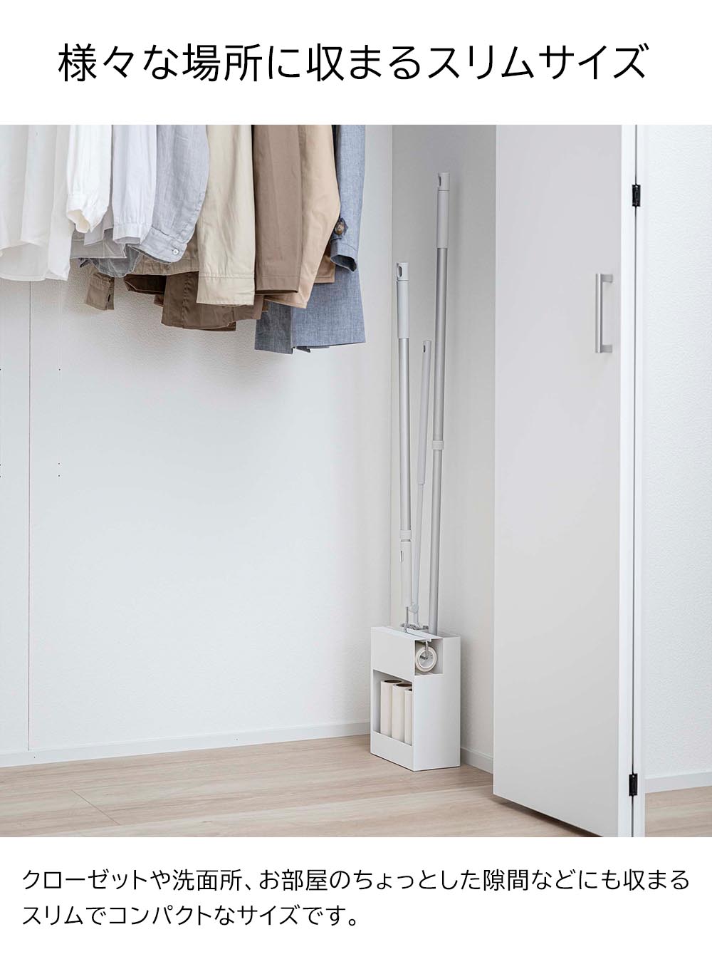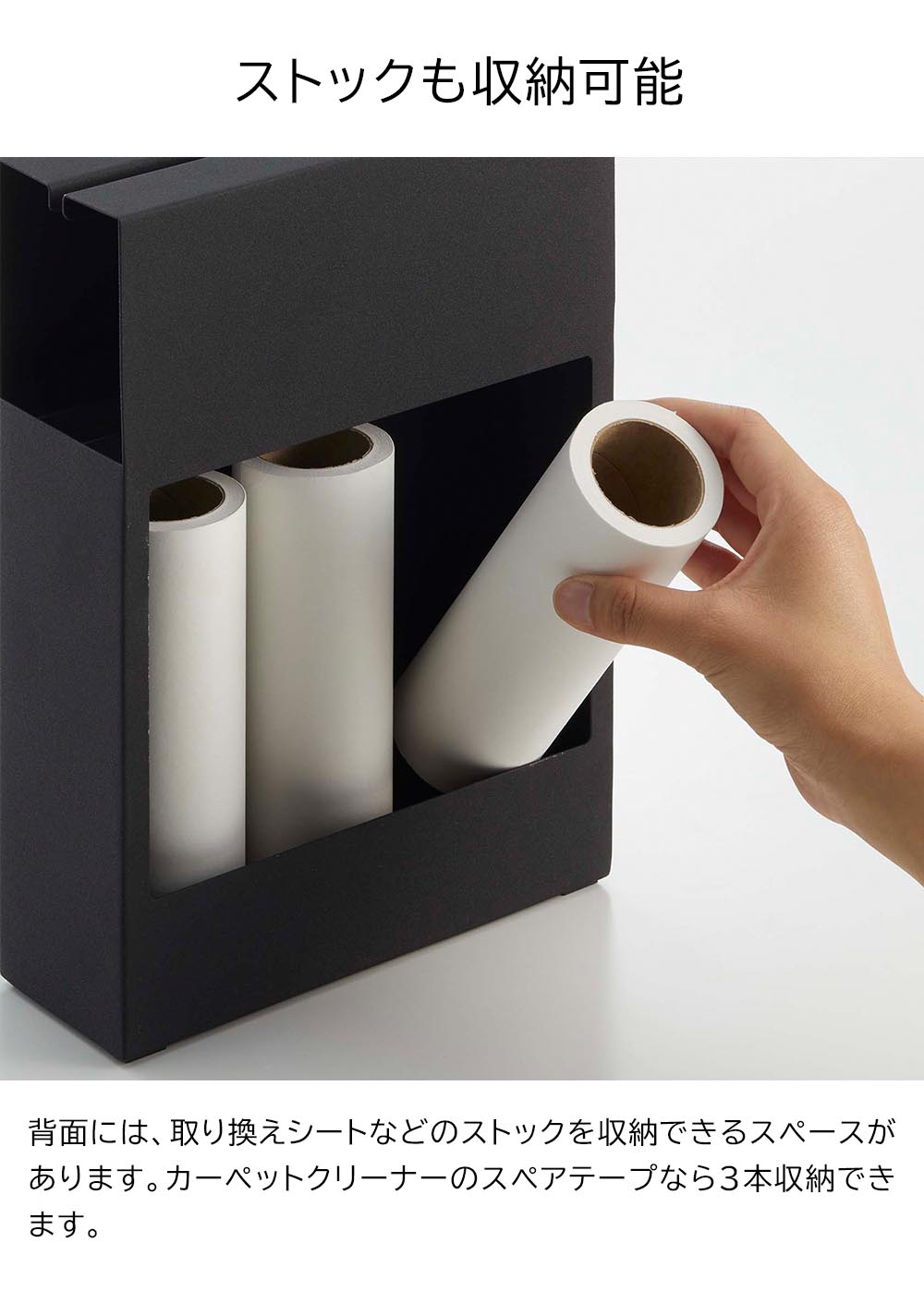 フローリングワイパー・ハンディーワイパー・カーペットクリーナーの3つのお掃除ツールをまとめて収納できるスタンドです。ヘッド部分が隠せるから見た目もきれい。生活空間にもさりげなく置けるシンプルでスタイリッシュなデザインのため、手に取りやすい場所に置いてサッとお掃除ができます。背面にはストックを収納できるスペースもあり便利です。