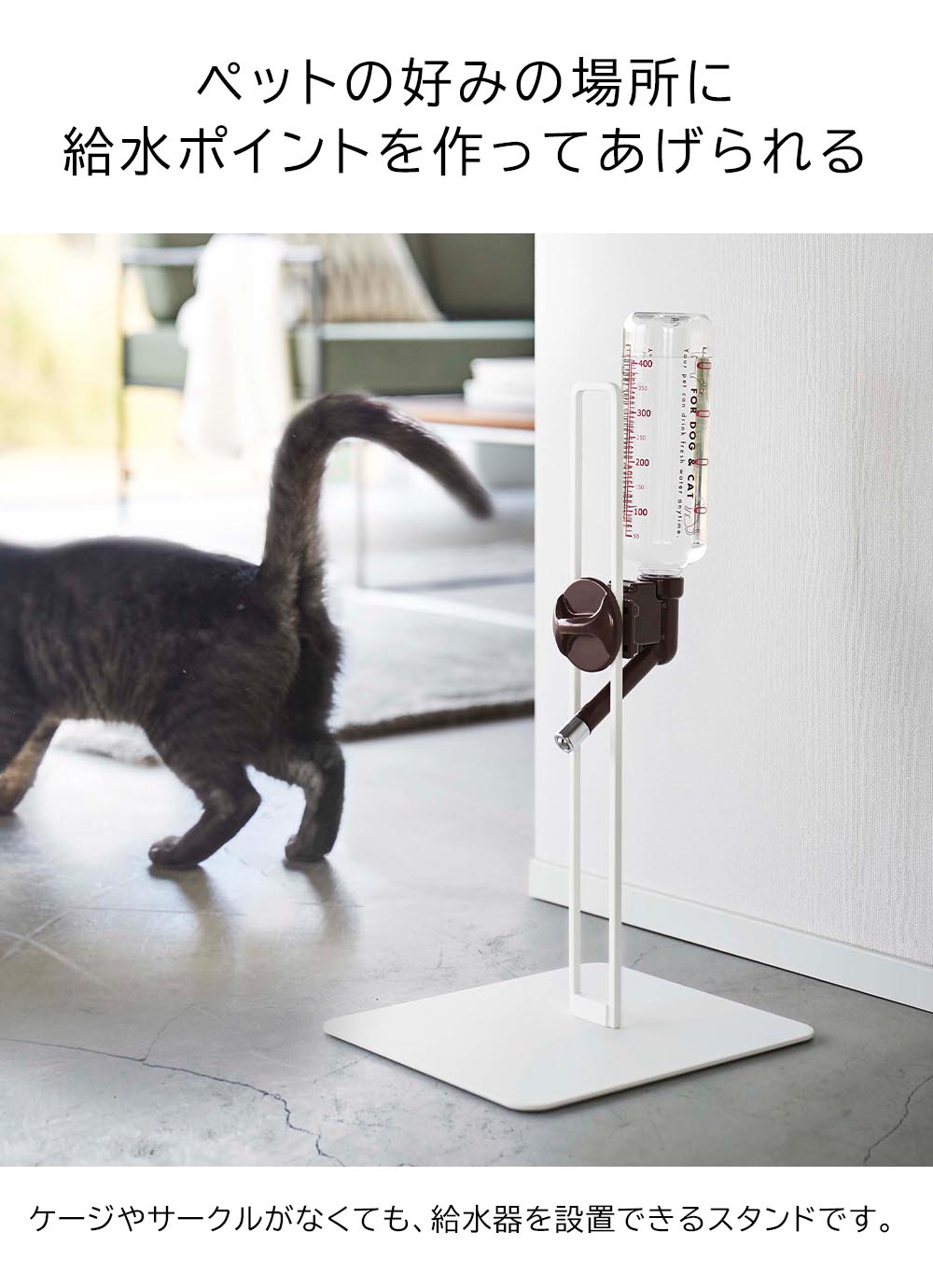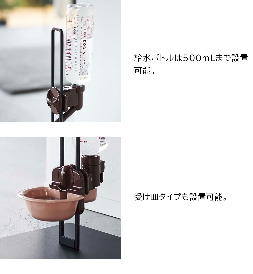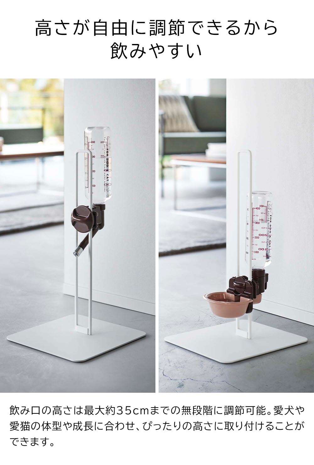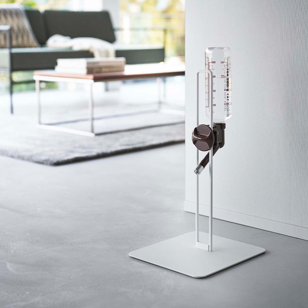 ケージやサークルがなくても、ペットがお水を飲めるポイントを好きな場所に作れる給水器スタンドです。高さは無段階に調整可能で飲みやすい位置にボトルの高さを合わせることができます。ノズルタイプと受け皿タイプ、どちらの給水器にもお使いいただけます。インテリアに合わせやすいシンプルなデザインです。