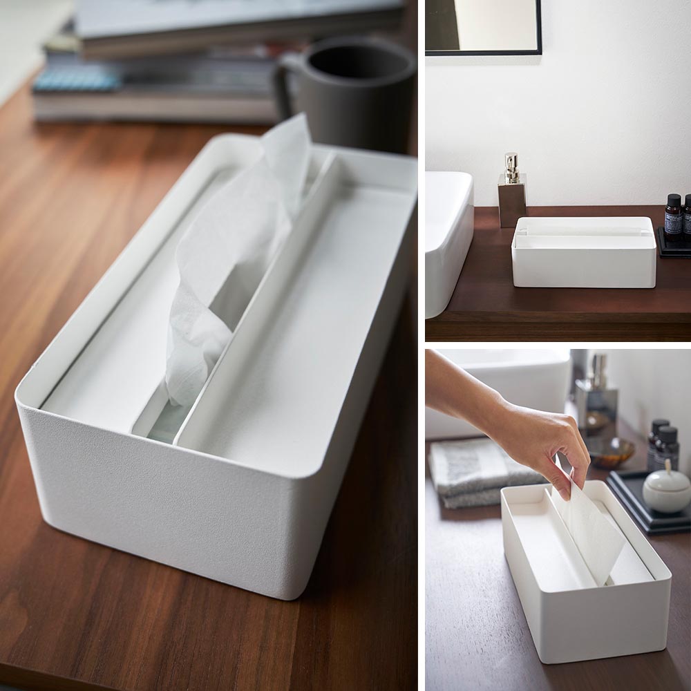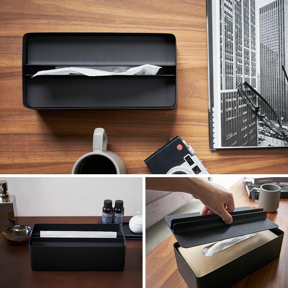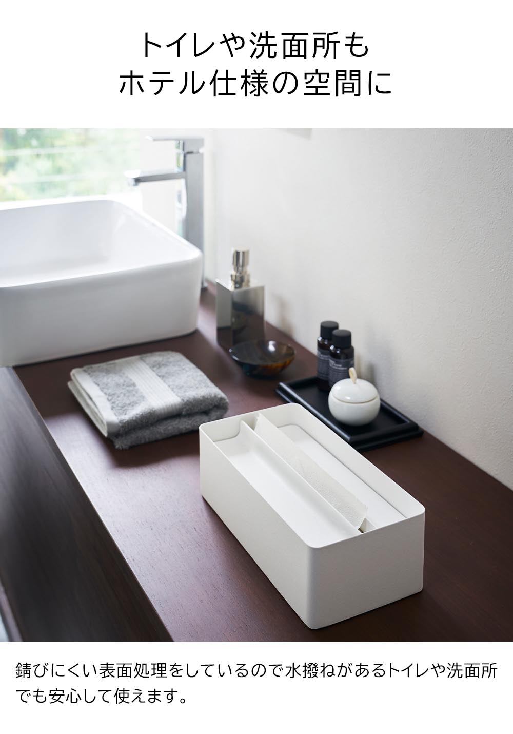 スチール製の重さがある蓋なので、浮きにくくペーパーがスムーズに取り出せます。一般的な高さのティッシュも箱ごと収納可能です。スタイリッシュで無駄のないシンプルなデザインはどんな場所にも馴染み、高級感のある空間を演出します。錆びにくい表面処理をしているので、洗面所やトイレでもお使いいただけます。
