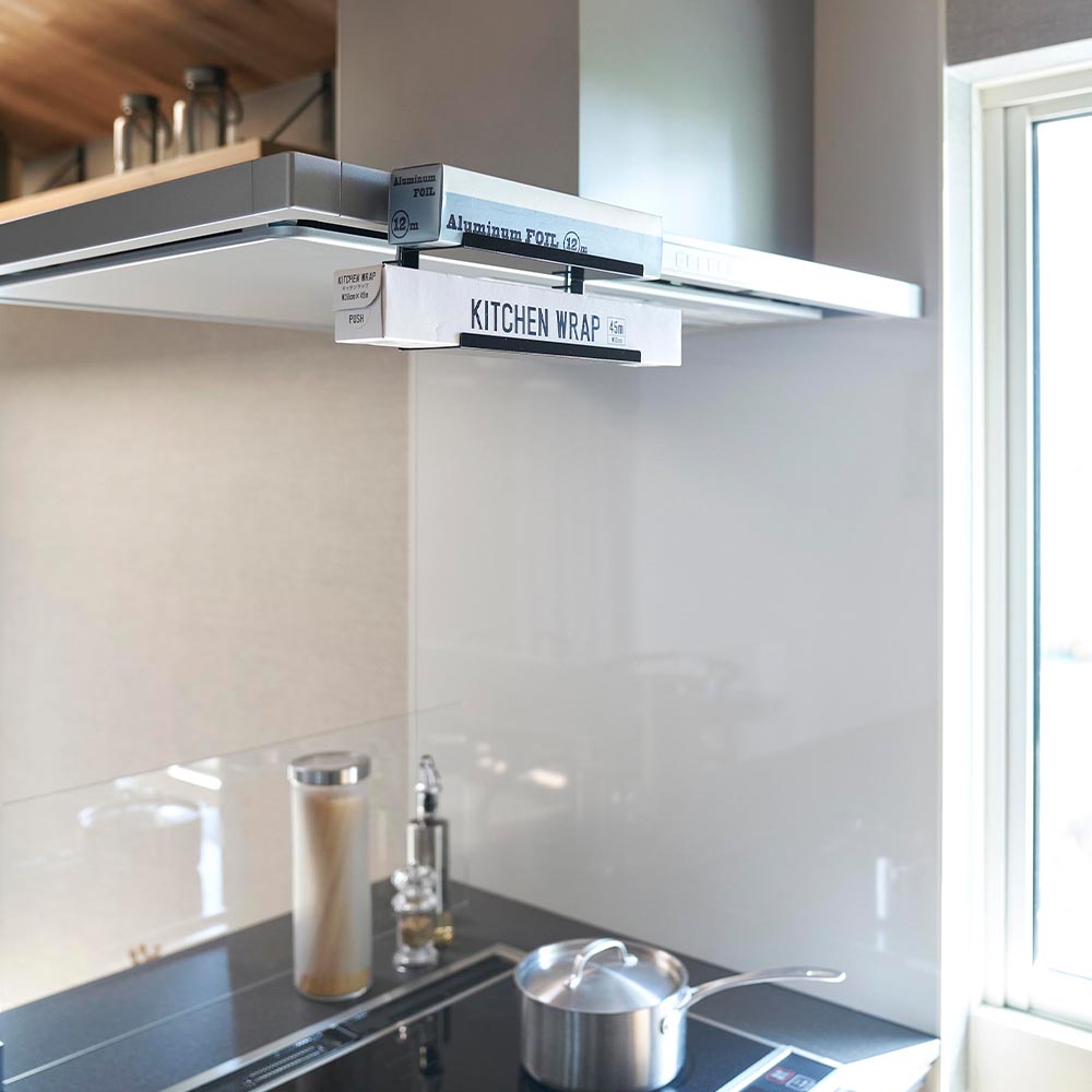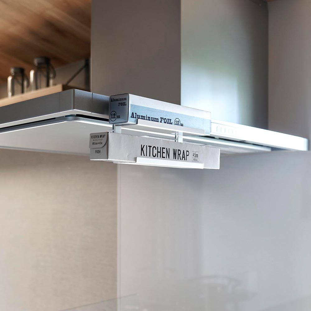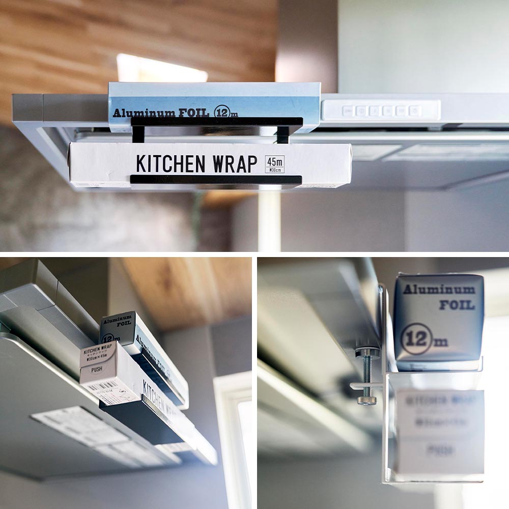 レンジフードに簡単取り付け レンジフード横のスペースを有効活用できるラップホルダーです。 サイズ違いのラップやアルミホイルなど、よく使う物を2段に分けて収納できます。 浮かせて収納するので邪魔にならず、必要な時にはサッと手に取れるのでスムーズな動線が生まれます。 レンジフードに挟み込んで、調節ネジでしっかりと固定できるから落下の心配もありません。 ![]() ![]() ![]() ![]() ![]() ![]() ![]() ![]() |