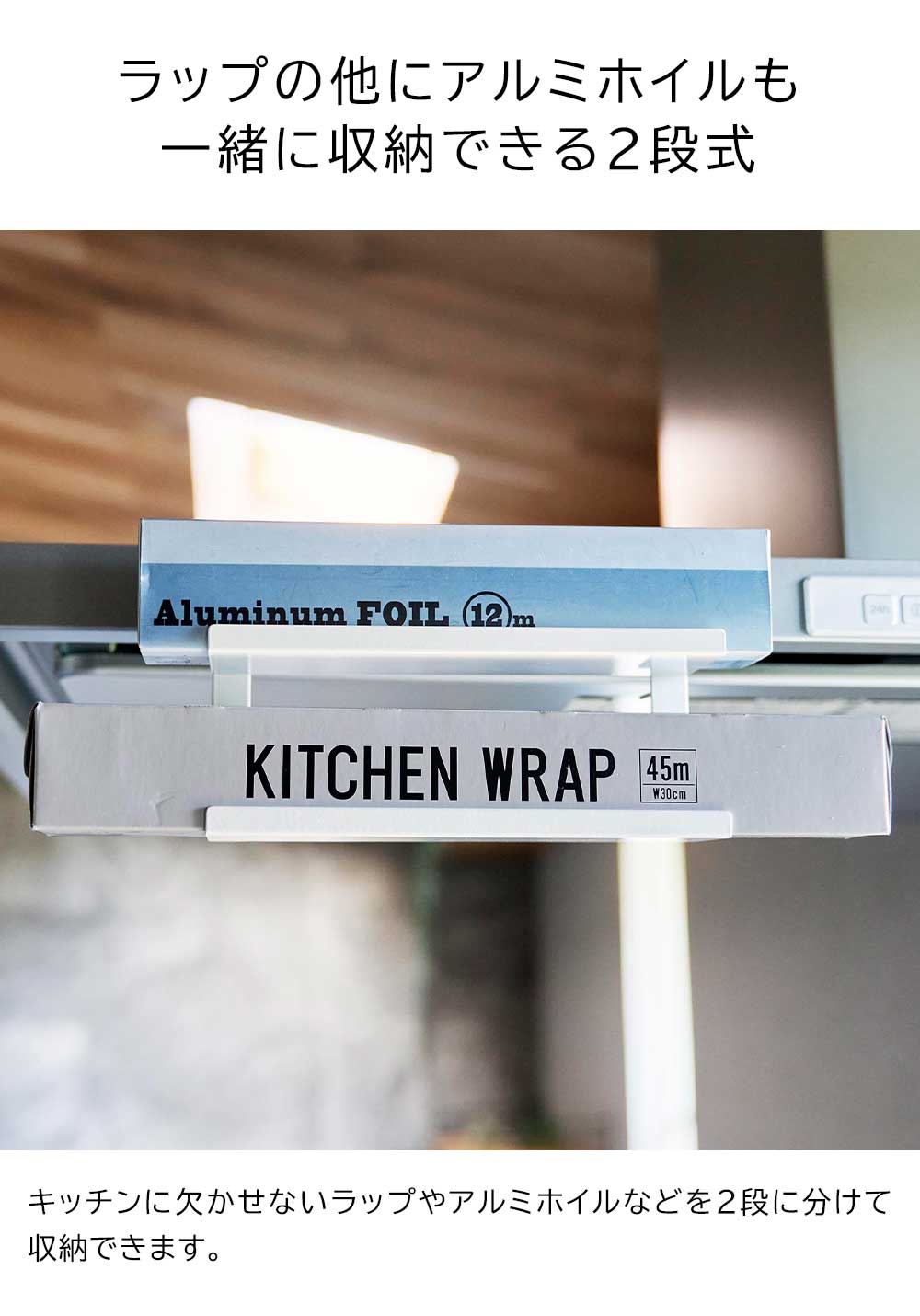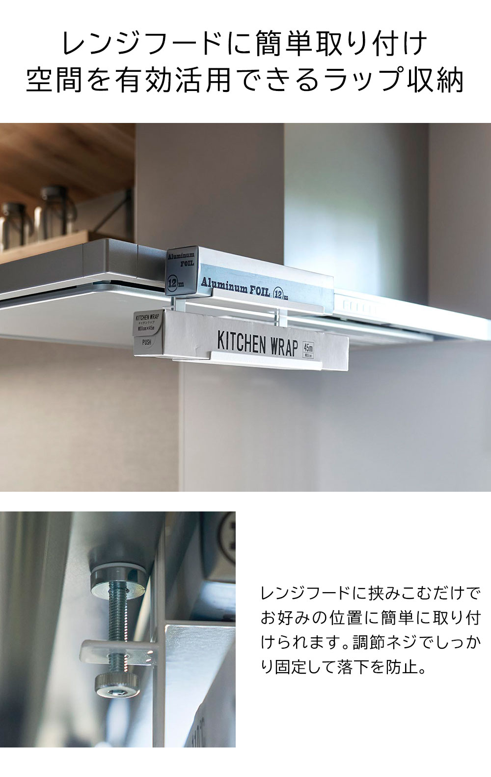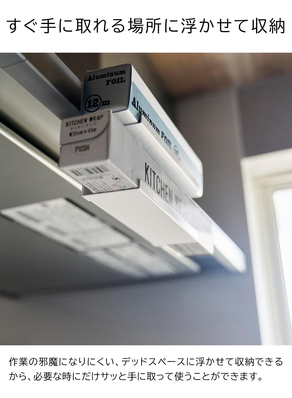 レンジフードに簡単取り付け レンジフード横のスペースを有効活用できるラップホルダーです。 サイズ違いのラップやアルミホイルなど、よく使う物を2段に分けて収納できます。 浮かせて収納するので邪魔にならず、必要な時にはサッと手に取れるのでスムーズな動線が生まれます。 レンジフードに挟み込んで、調節ネジでしっかりと固定できるから落下の心配もありません。 ![]() ![]() ![]() ![]() ![]() ![]() ![]() ![]() |