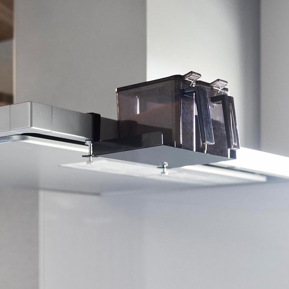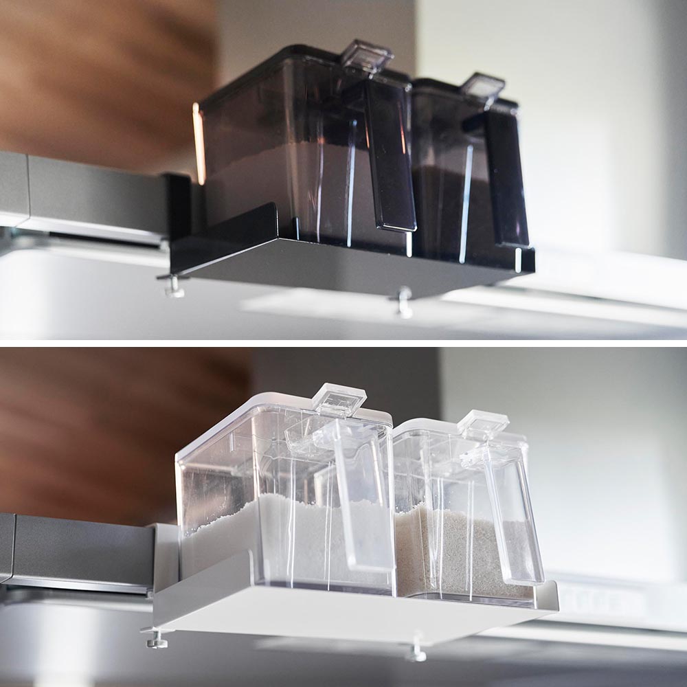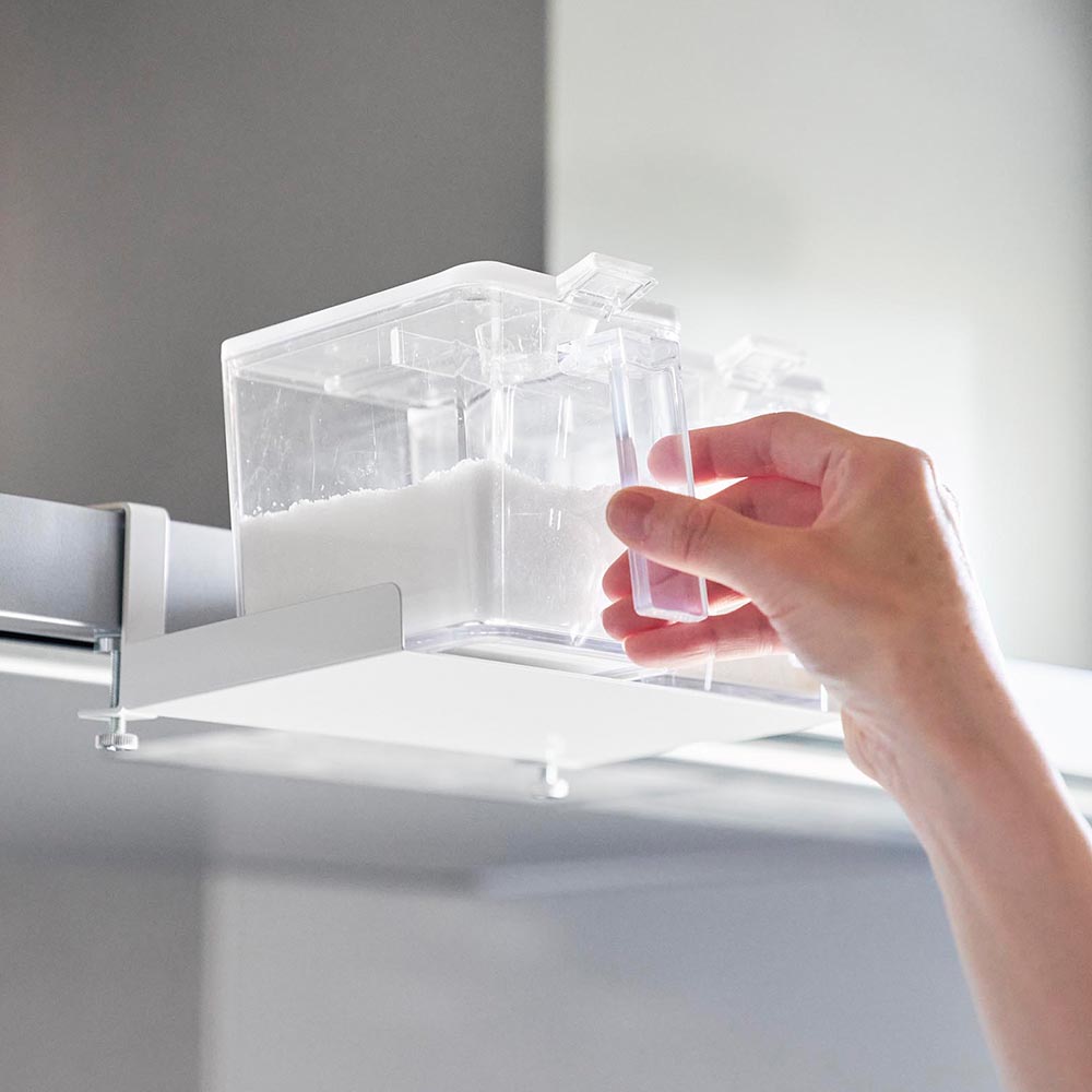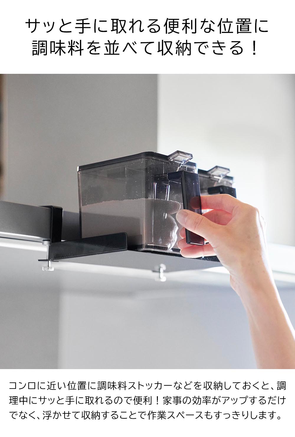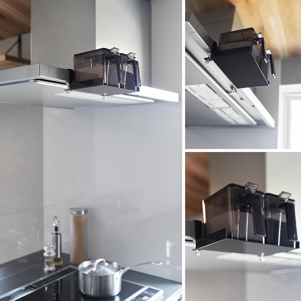 レンジフードに挟み込んで調節ネジで固定するだけで、お好みの位置に簡単に取り付けができる調味料ラック。