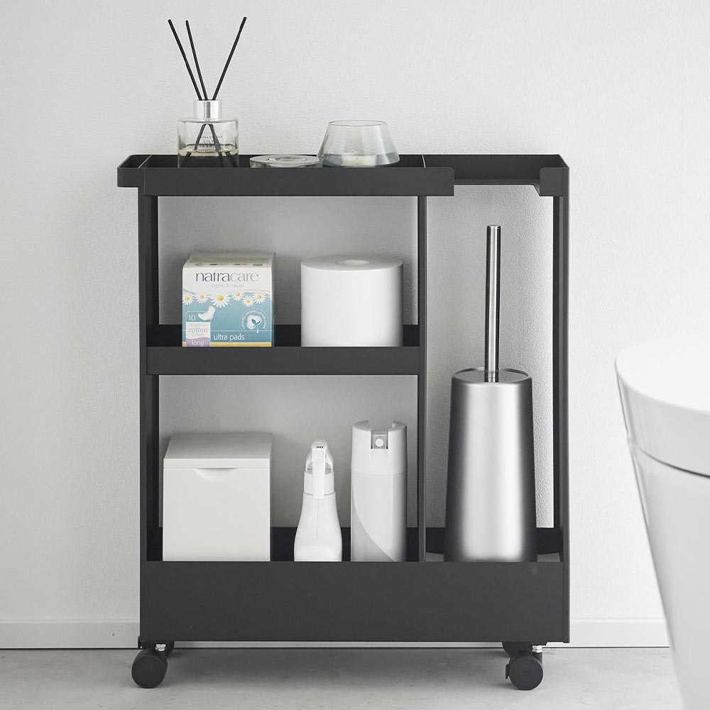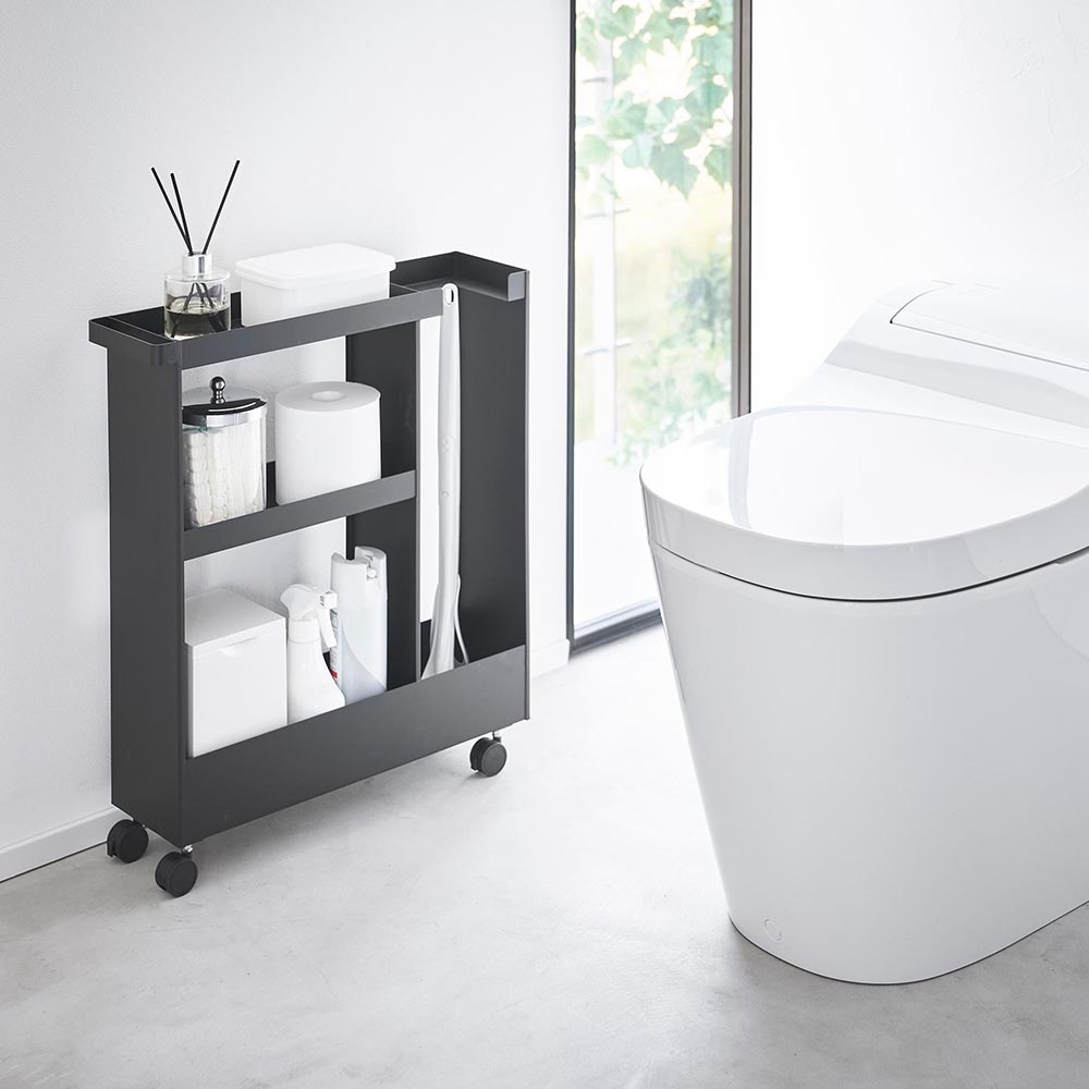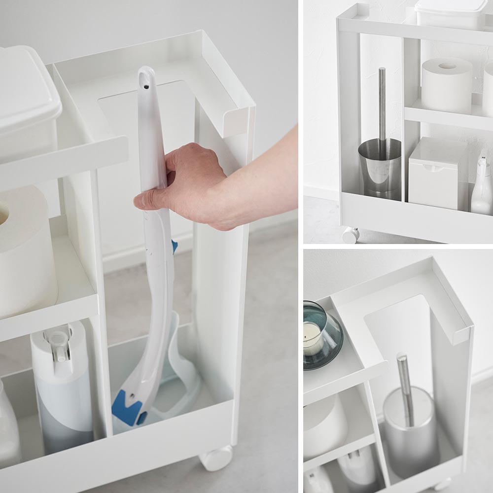 高さのあるトイレブラシや トイレットペーパーやサニタリー用品、トイレ用洗剤などと一緒に、高さのあるトイレブラシも収納できる、キャスター付きのスリムなワゴンです。 トイレ用品をスタイリッシュなワゴンにまとめて収納することで、機能的でスッキリと整ったトイレ空間を演出します。 使い捨てトイレブラシのような、細長くやや不安定なアイテムも、トイレブラシ収納エリアに安定して収まります。 様々な用途や形状のトイレ用品は、3段の棚に使いやすく分類できます。それぞれの棚にはフチが付いているので落下の心配もありません。 キャスターとハンドル付きだから、こまごまとしたトイレ用品を全て一緒に移動でき大変便利!物の出し入れやトイレ掃除の際に、ラクに移動できます。 付属のスパナでキャスターを取り付けるだけの簡単組み立てで、購入後すぐに使用できます。 ![]() ![]() ![]() ![]() ![]() ![]() ![]() ![]() ![]() ![]() ![]() ![]() |