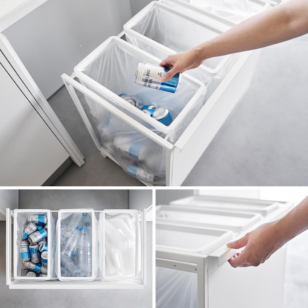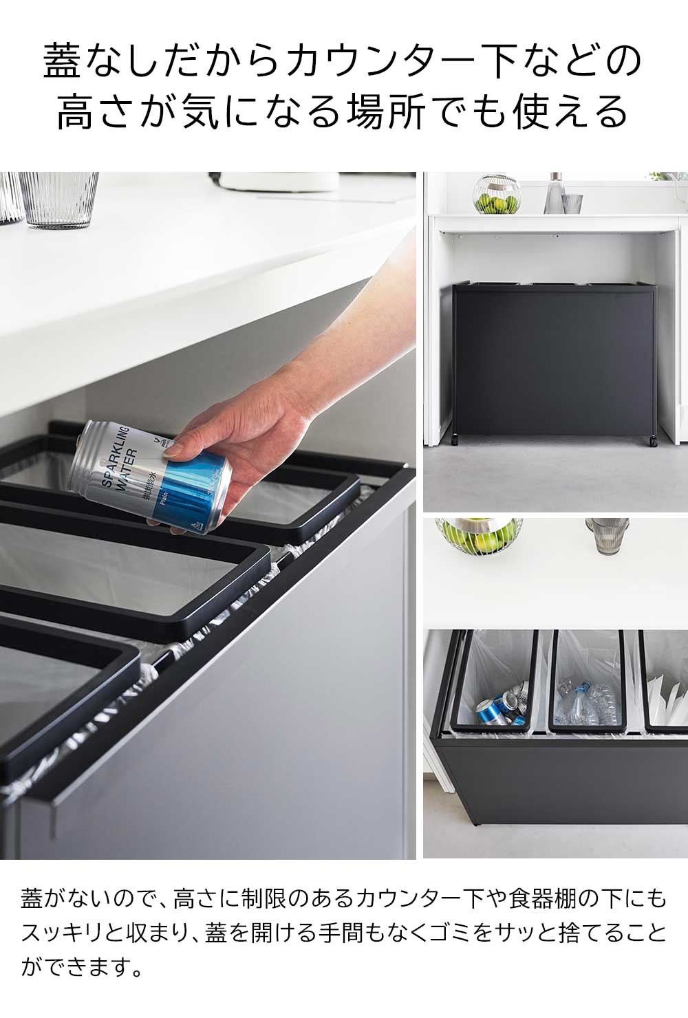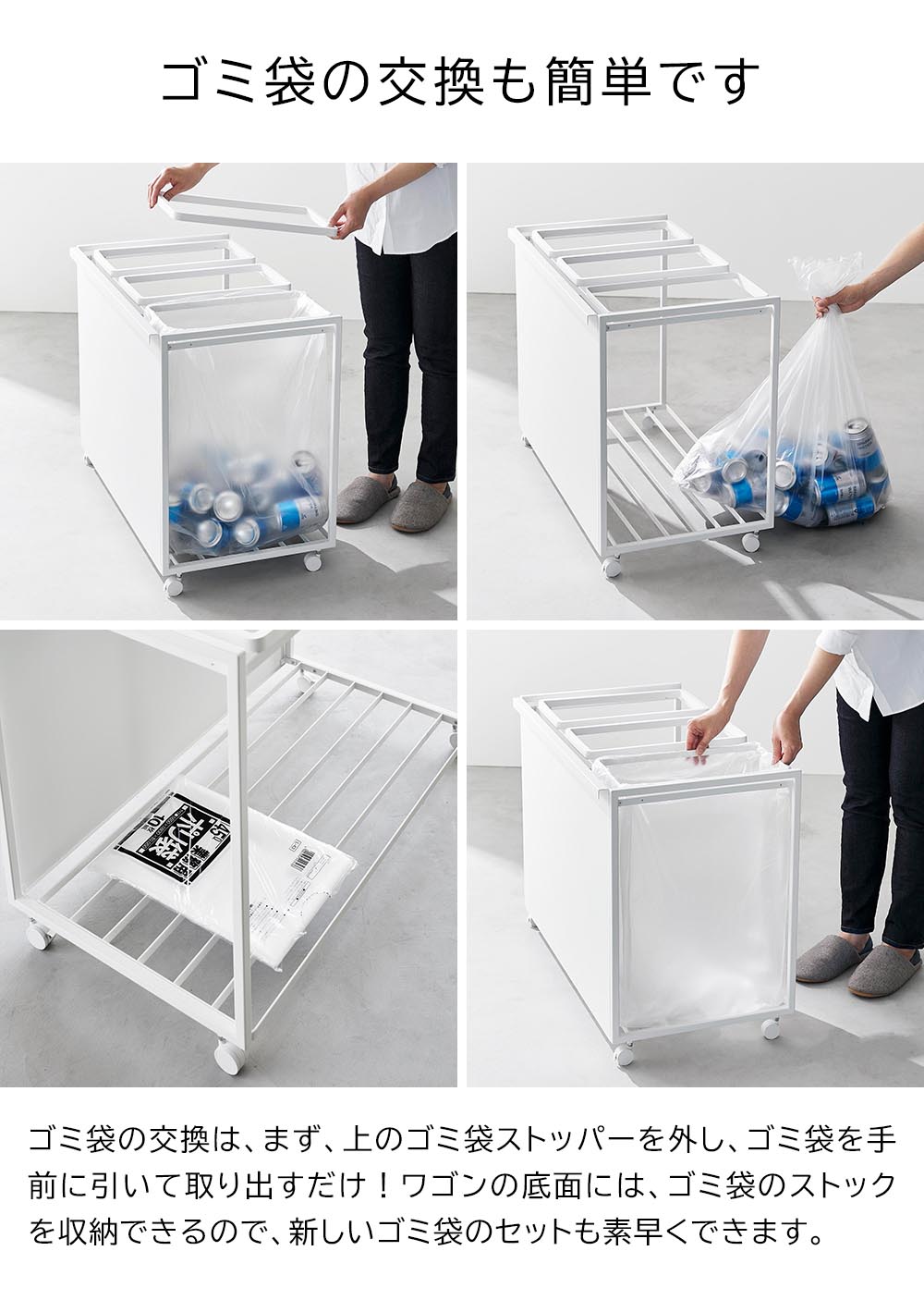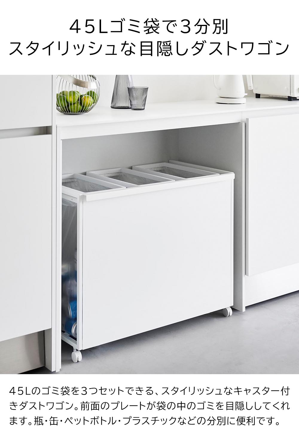 45Lゴミ袋を隠してセット 45Lのゴミ袋を3つセットできる、目隠し分別ダストワゴン。 捨て場所に困る、瓶・缶・ペットボトル・プラスチックなどの分別に便利です。 前面についている目隠しプレートが、中のゴミを上手に隠してくれます。 蓋がないので、高さに制限のあるカウンター下や食器棚下にもスッキリと収まり、蓋を開ける手間もなくゴミをサッと捨てることができます。 ハンドルとキャスター付きで移動がラクラク!ゴミ出しやお掃除の際にもスッと動かせます。 ゴミ袋の交換も簡単です。上のゴミ袋ストッパーを外し、ゴミ袋を手前に引いて取り出すだけ!ワゴンの底面には、ゴミ袋のストックを収納できるので、新しいゴミ袋のセットも素早くできます。 ![]() ![]() ![]() ![]() ![]() ![]() ![]() ![]() ![]() ![]() ![]() ![]() ![]() ![]() ![]() |