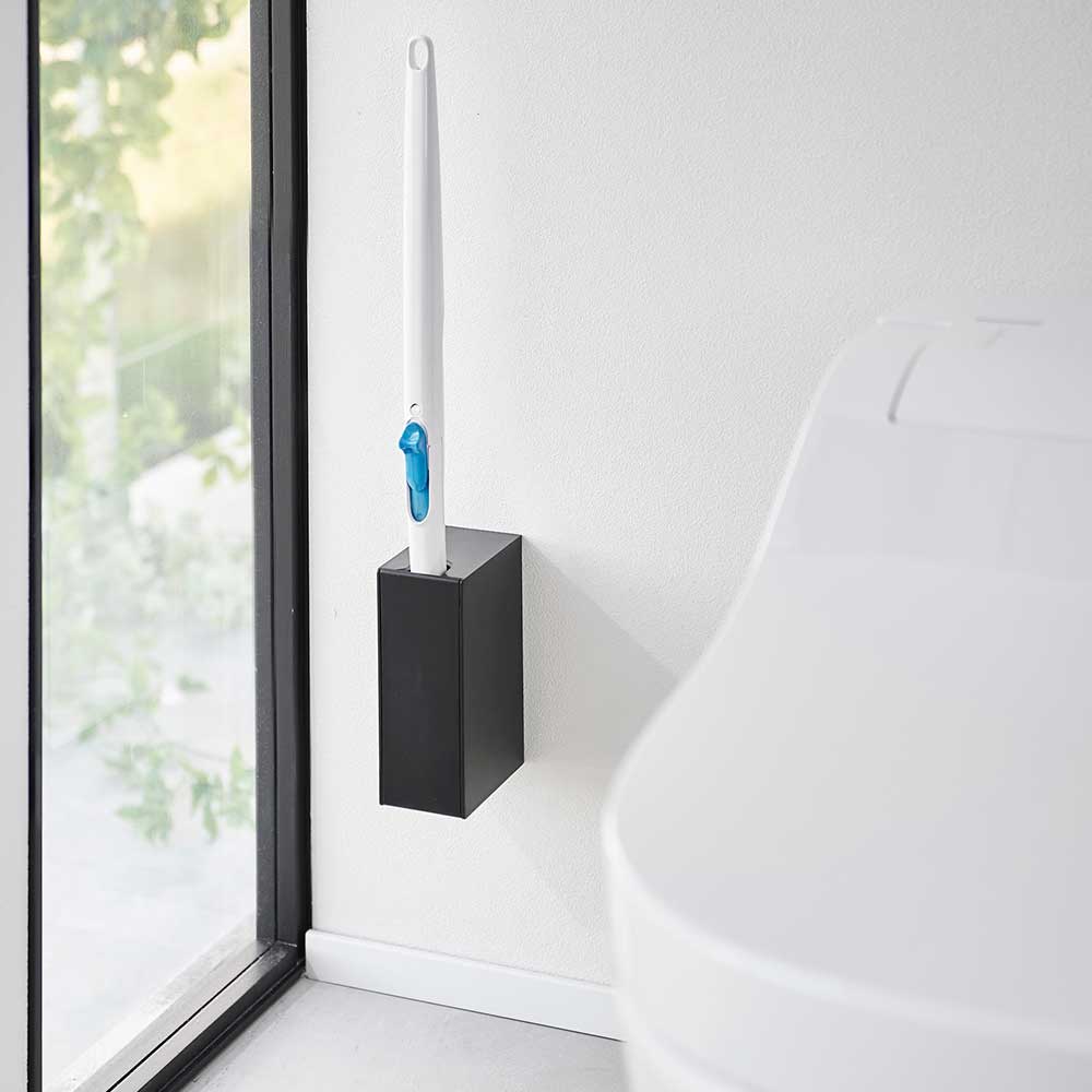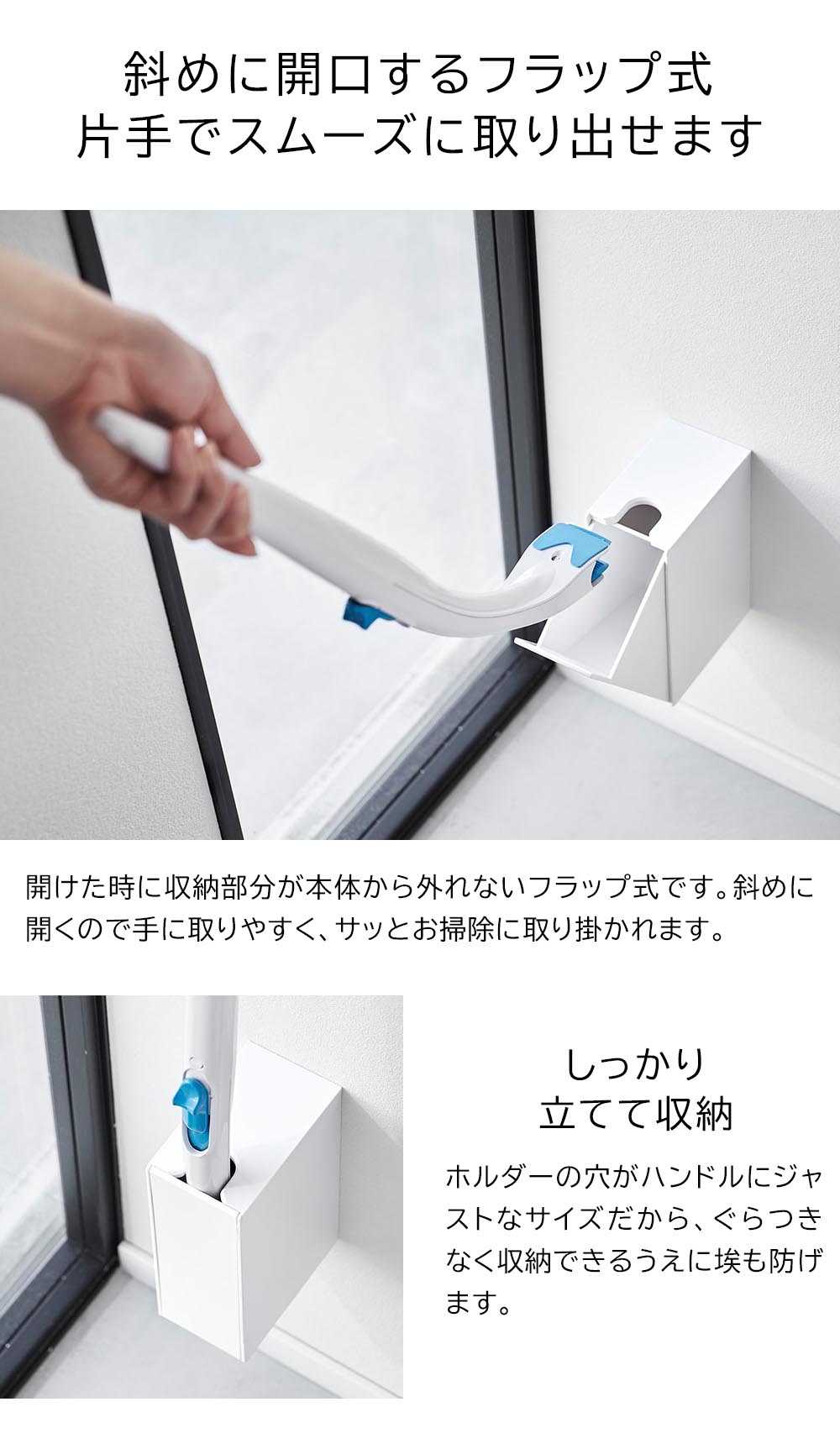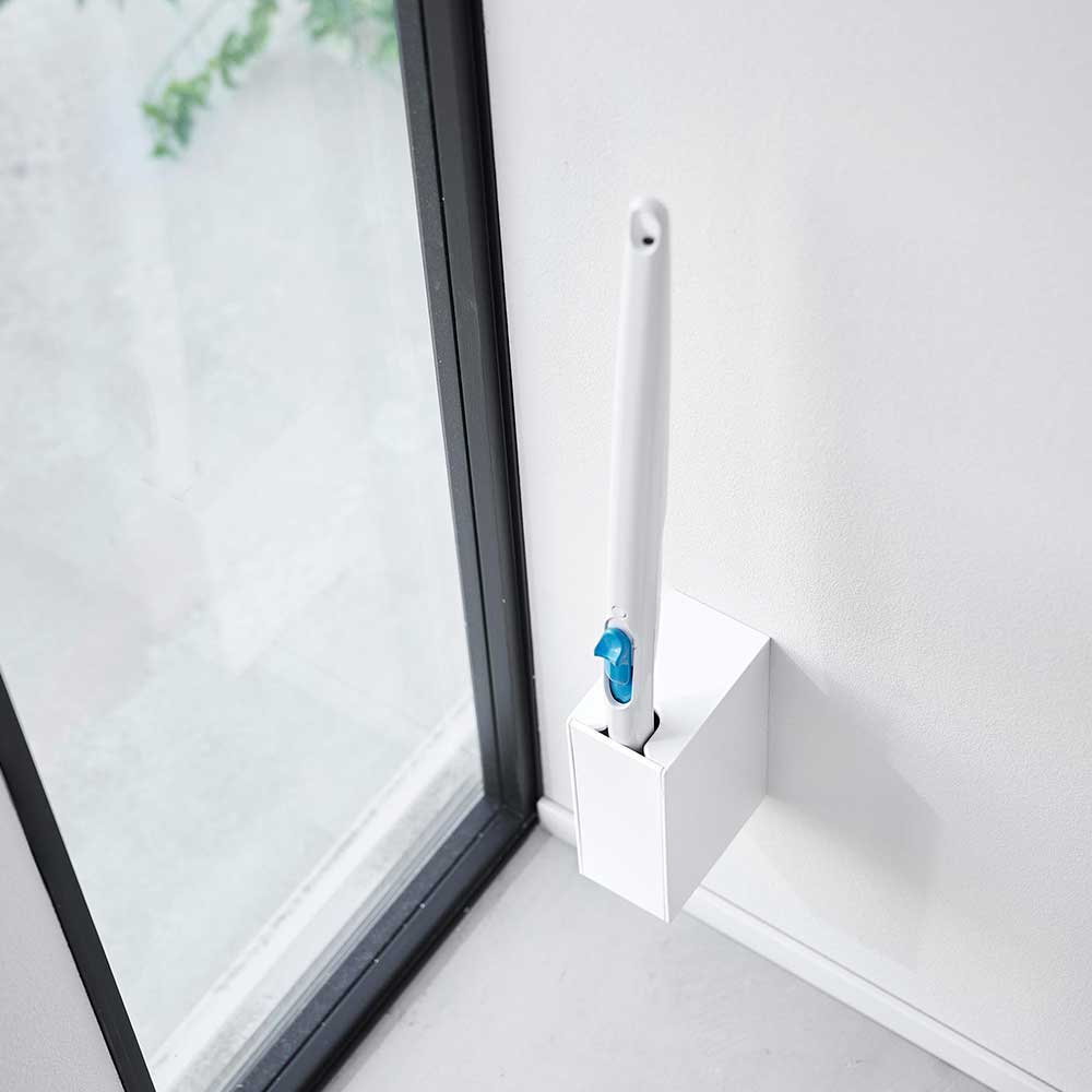 トイレ掃除に人気の流せるトイレブラシの収納に便利なホルダーです。汚れが気になる先端を隠して収納できるので衛生的で見た目にもきれい。壁面に浮かせて設置でき、床掃除の際に移動する手間がなくラクです。開口部はフラップ式で斜めに開き、ハンドルが片手でスムーズに取り出せます。取り付けは、石こうボードピンか木ネジでベースになるピースを取り付け、本体を差し込むだけで簡単です。