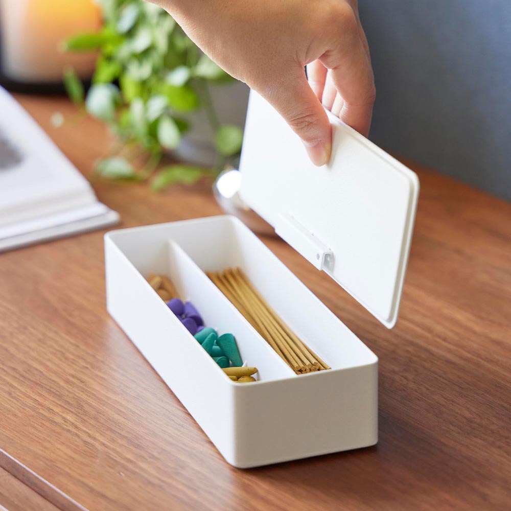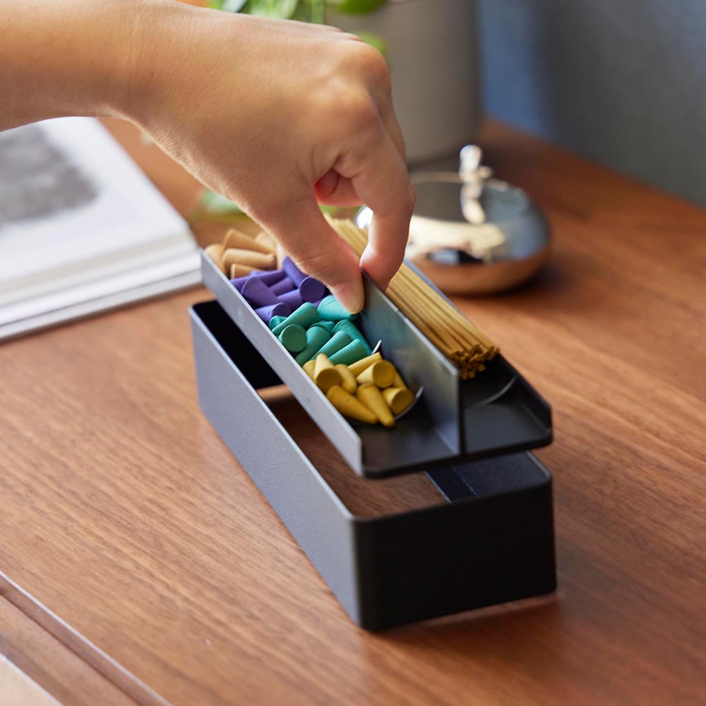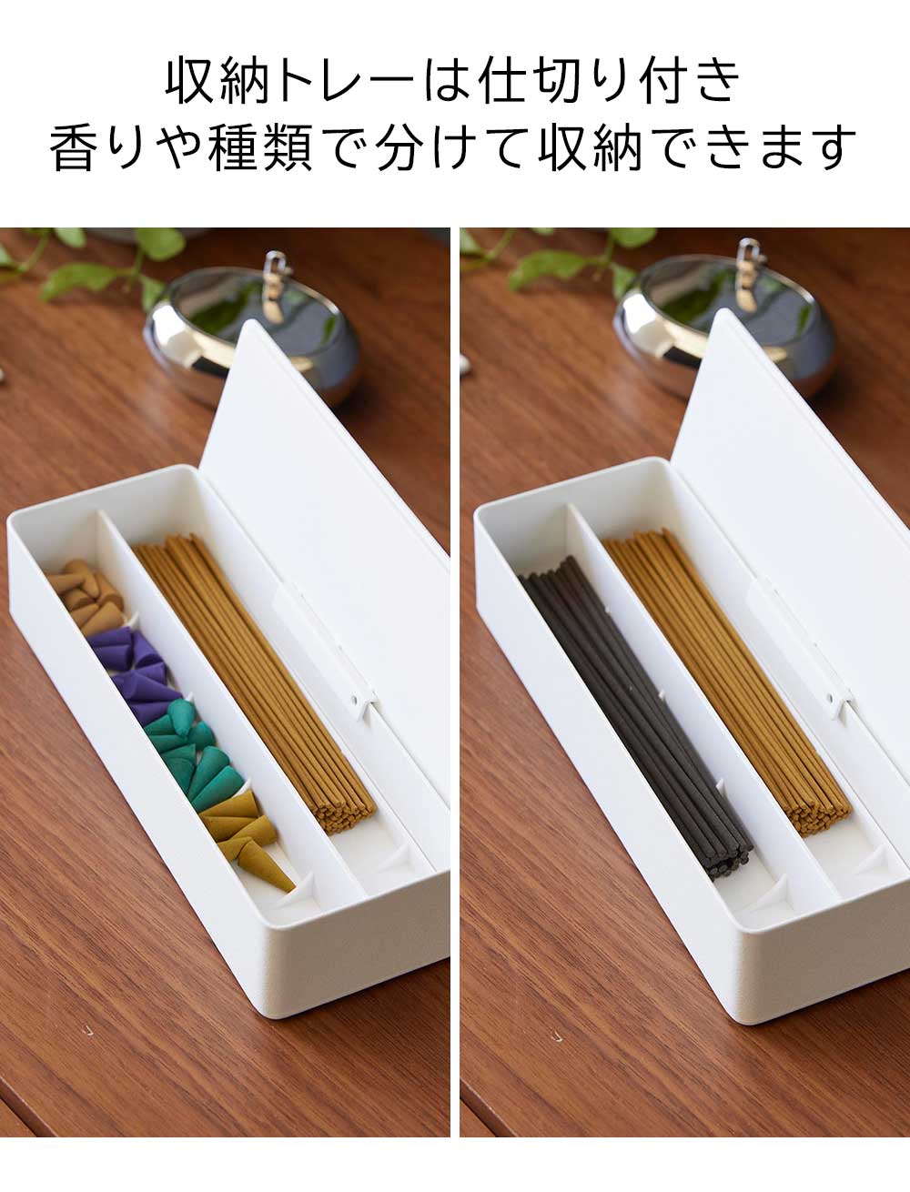 蓋の上でそのままお香を焚ける、スタイリッシュなお香収納ケースです。スティックタイプのお香を立てられる、マグネット付きのお香立てが付属。使用後は蓋の裏に取り付けてスッキリと収納できます。はずした蓋は本体に引っ掛けておけるので、置き場所に困りません。ケース内は、香りや種類で分けて収納できる仕切り付きのトレーとなっており、取り外して丸洗いも可能です。また、スティックタイプのお香だけでなく、コーンタイプのお香を焚いても◎
