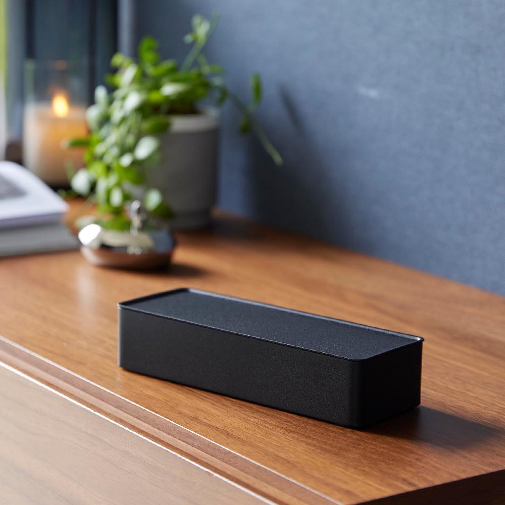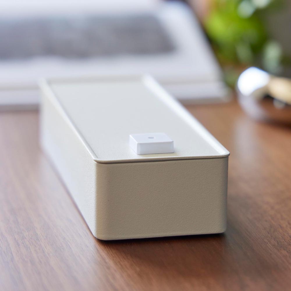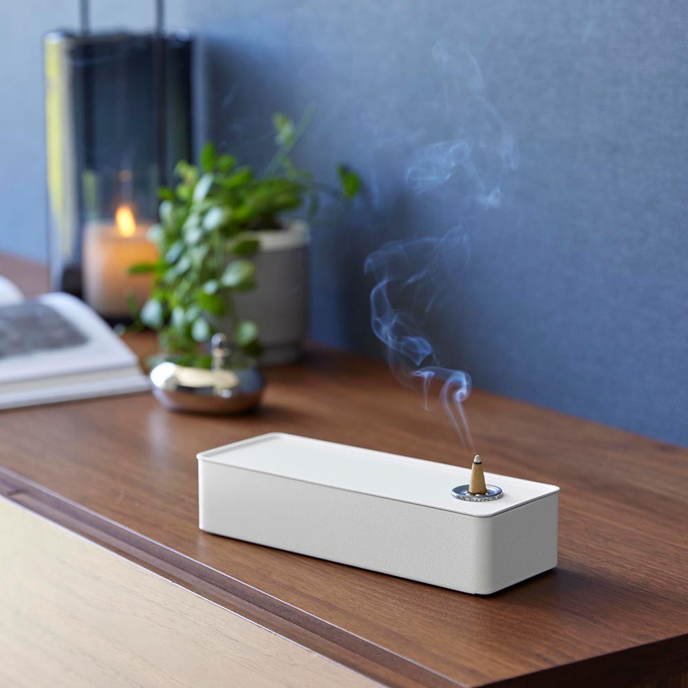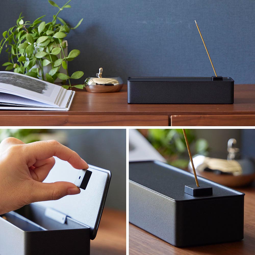 蓋の上でそのままお香を焚ける、スタイリッシュなお香収納ケースです。スティックタイプのお香を立てられる、マグネット付きのお香立てが付属。使用後は蓋の裏に取り付けてスッキリと収納できます。はずした蓋は本体に引っ掛けておけるので、置き場所に困りません。ケース内は、香りや種類で分けて収納できる仕切り付きのトレーとなっており、取り外して丸洗いも可能です。また、スティックタイプのお香だけでなく、コーンタイプのお香を焚いても◎