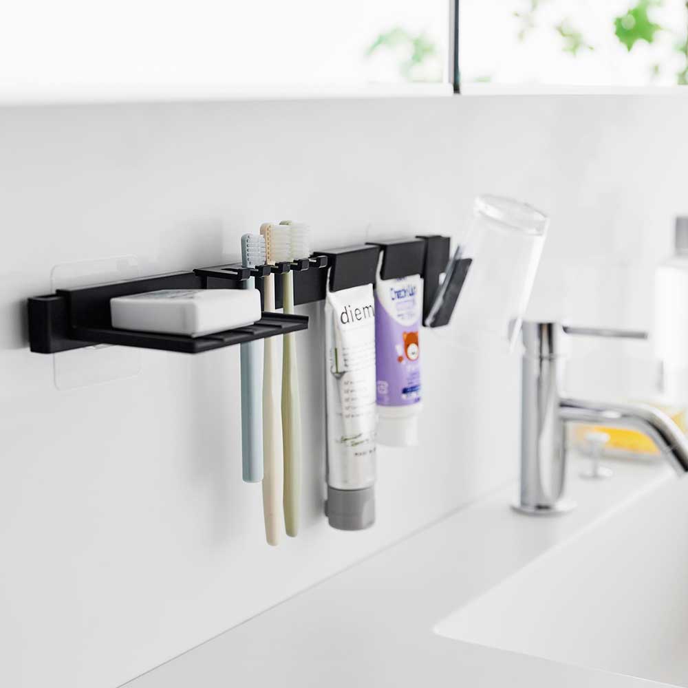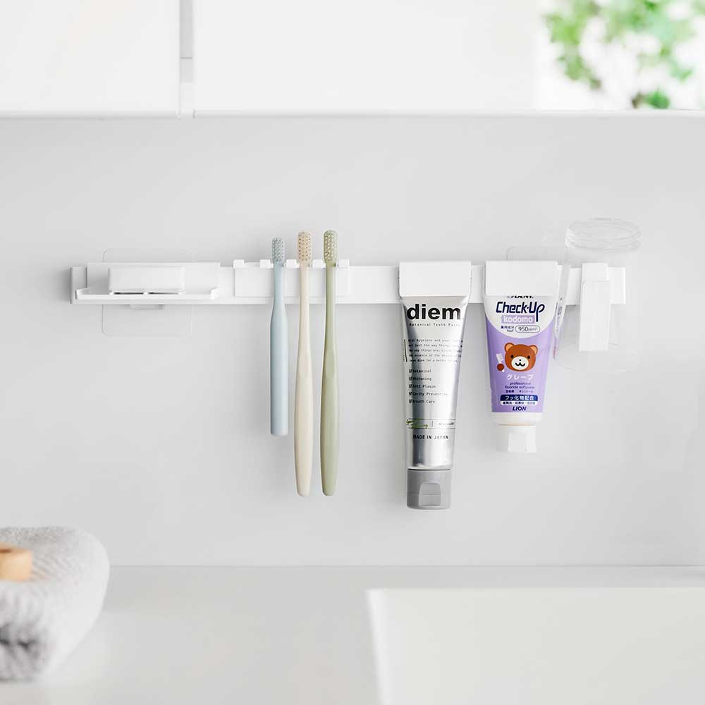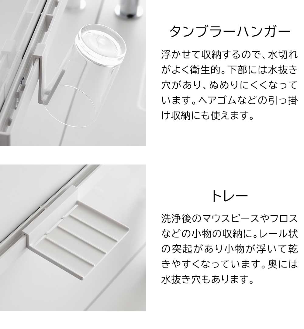 フィルムフックで簡単設置 洗面台の壁面に、歯ブラシ・歯磨き粉・タンブラーをまとめて収納できます。浮かせて収納しているので、空気によく触れて乾きやすく湿気がこもりません。歯ブラシハンガーには電動歯ブラシも収納可能。マウスピースなどの小物が置けるトレーも付いています。取り付けは、壁面に貼ったフィルムフックにバーを引っ掛け、各パーツを差し込むだけで簡単。洗面台がすっきり片付きます。 ![]() ![]() ![]() ![]() ![]() ![]() ![]() ![]() ![]() ![]() ![]() |