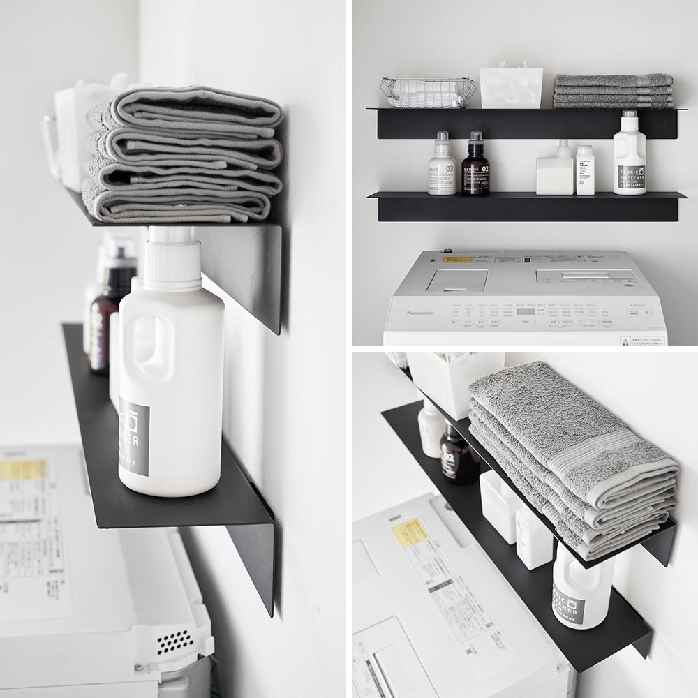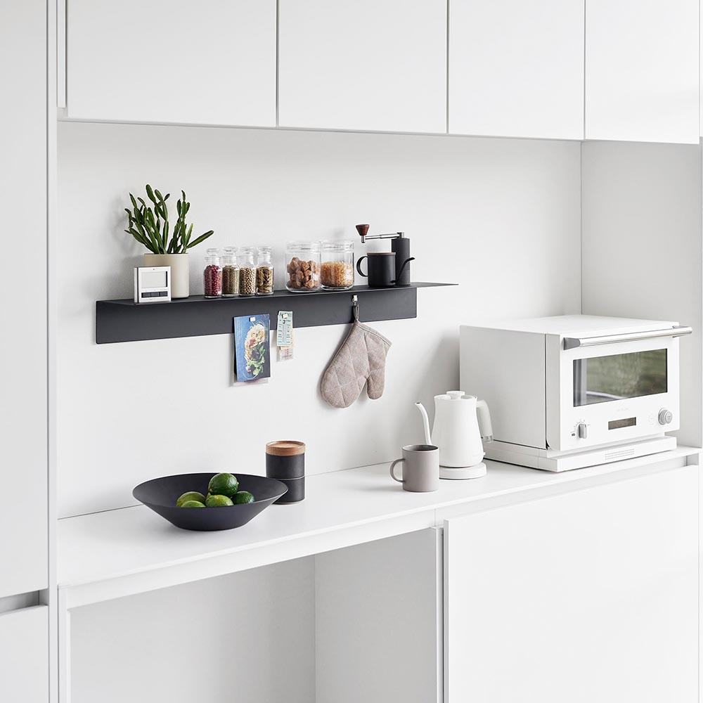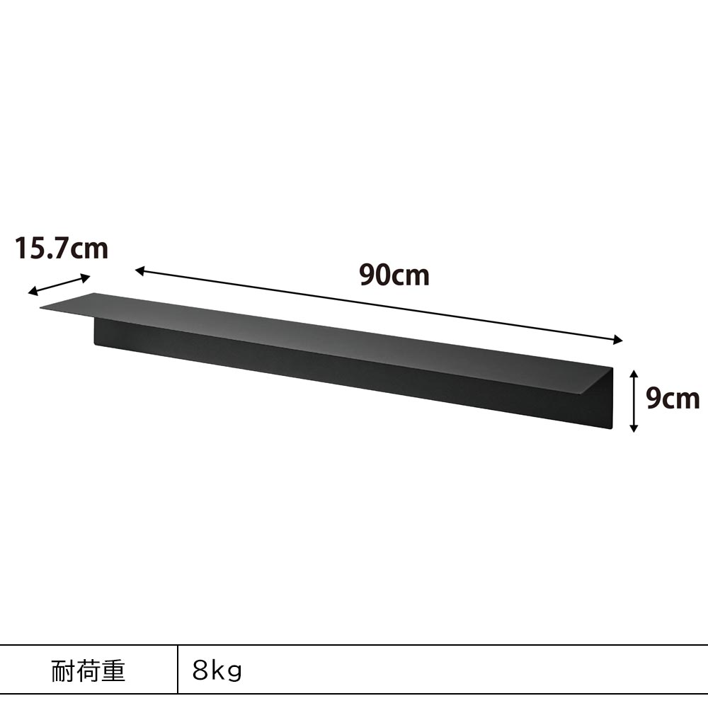 壁にあいた穴が目立ちにくい石こうボードピンで取り付けできる、幅90cmのシンプルなウォールラックです。石こうボードピンで取り付けベースを壁面に取り付けて、ラック本体を差し込むだけで設置完了。木ネジで取り付けることも可能です。L字型のシンプルなデザインなので、リビング・キッチン・ランドリー・玄関・トイレなど、場所を選ばずに活躍してくれます。ラックは奥行僅か15cmと省スペースながら、様々な物が置けて収納力も充実。また、マグネットがつくスチール製なので、メモや小物をペタッと貼りつけることができて便利です。